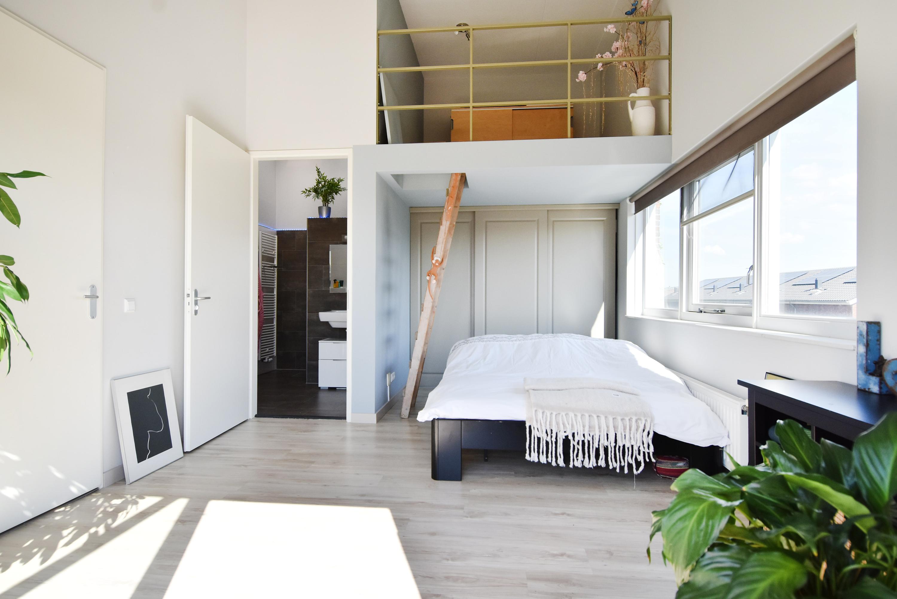 The third bedroom/studio (currently the master bedroom), which provides access to the terrace, has a playful layout with a particularly attractive ceiling height of more than 4 metres (!) with a mezzanine and loft.