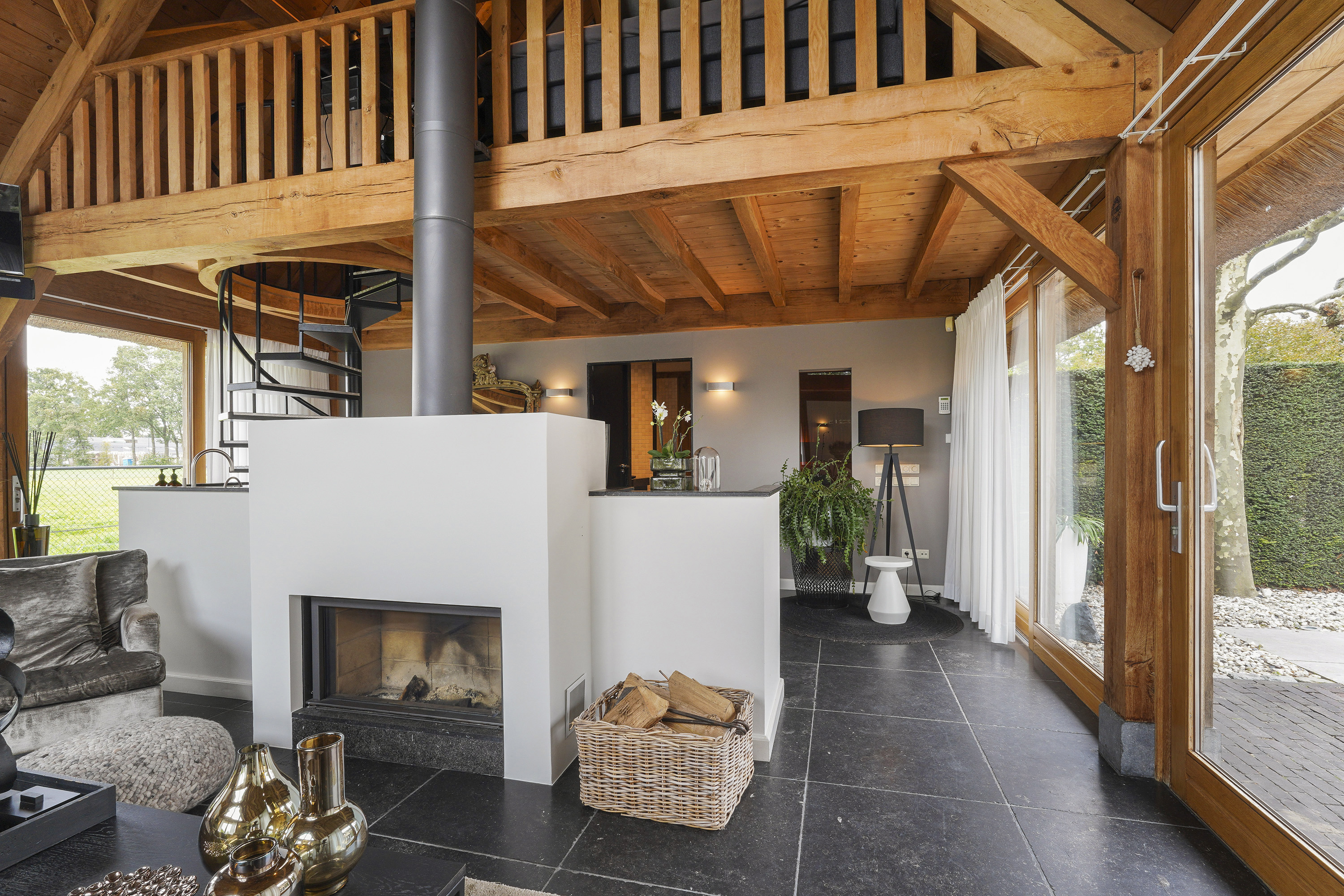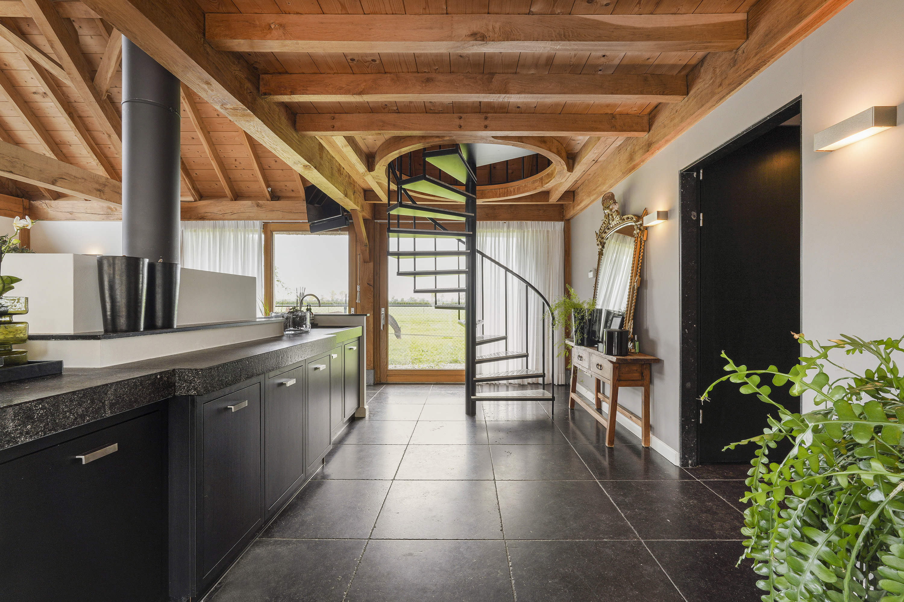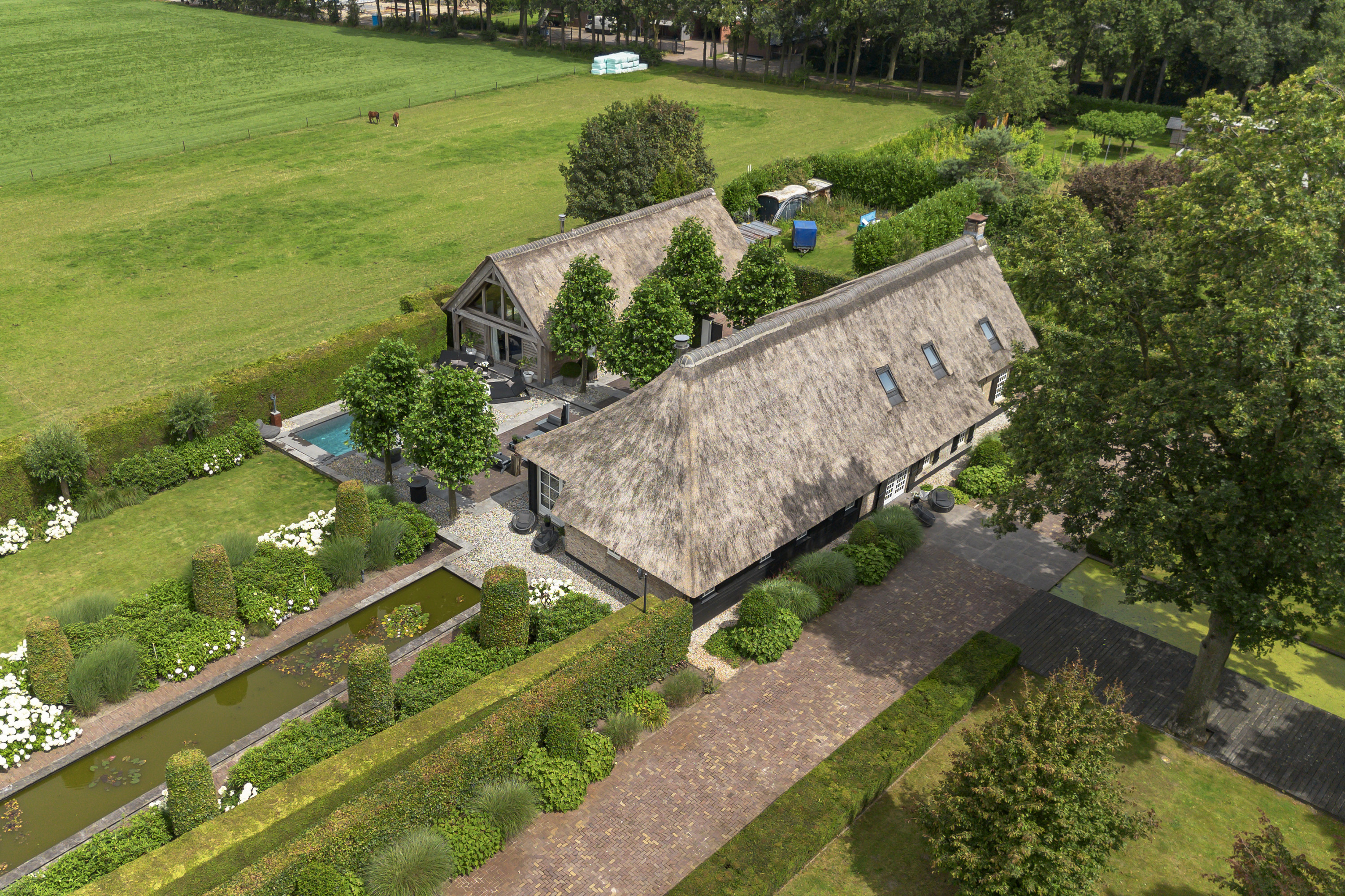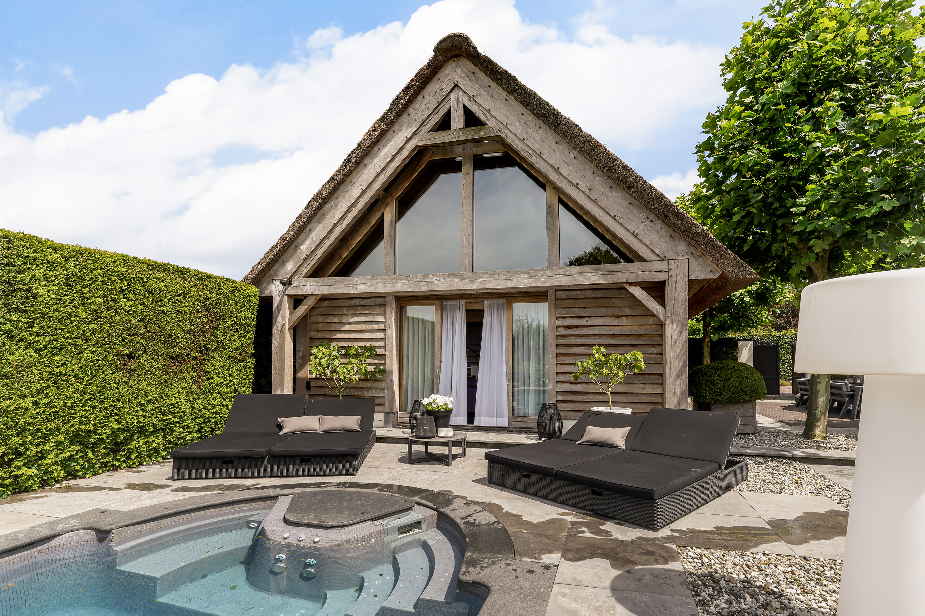 The “Handmade by Rasenberg” guesthouse is a true gem, with a spacious living area, a four-person sauna, a pantry kitchen, and an open fireplace. The guesthouse is beautifully insulated and features large sliding doors, allowing natural light to flood the space. A steel spiral staircase leads to the study and private bedroom on the upper floor. The high-quality thatched roof complements the farmhouse, creating a harmonious and luxurious atmosphere.