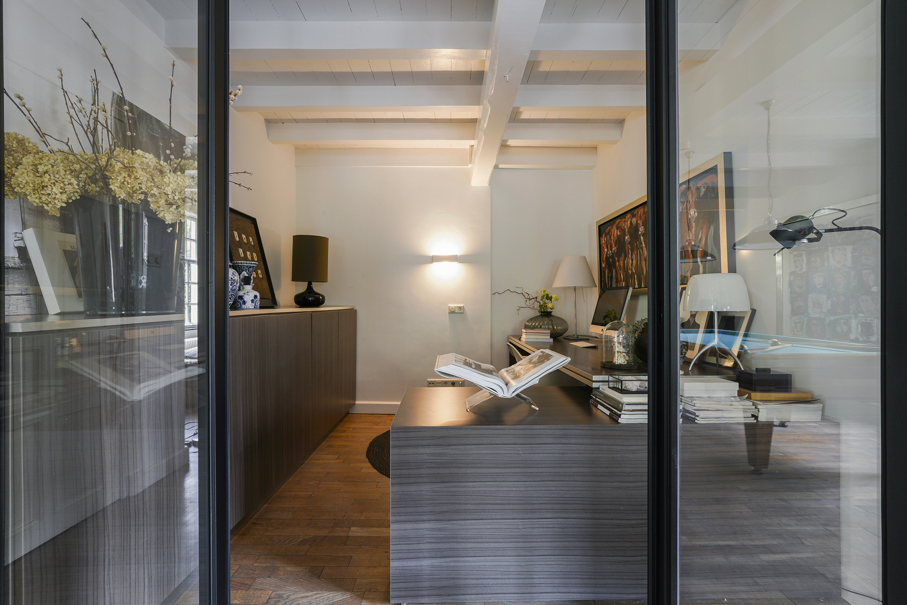 Living Room: A bright, open space with views of the garden, original beams, and a modern tunnel fireplace. The room connects to the mezzanine above, offering an airy feel and a sense of openness.