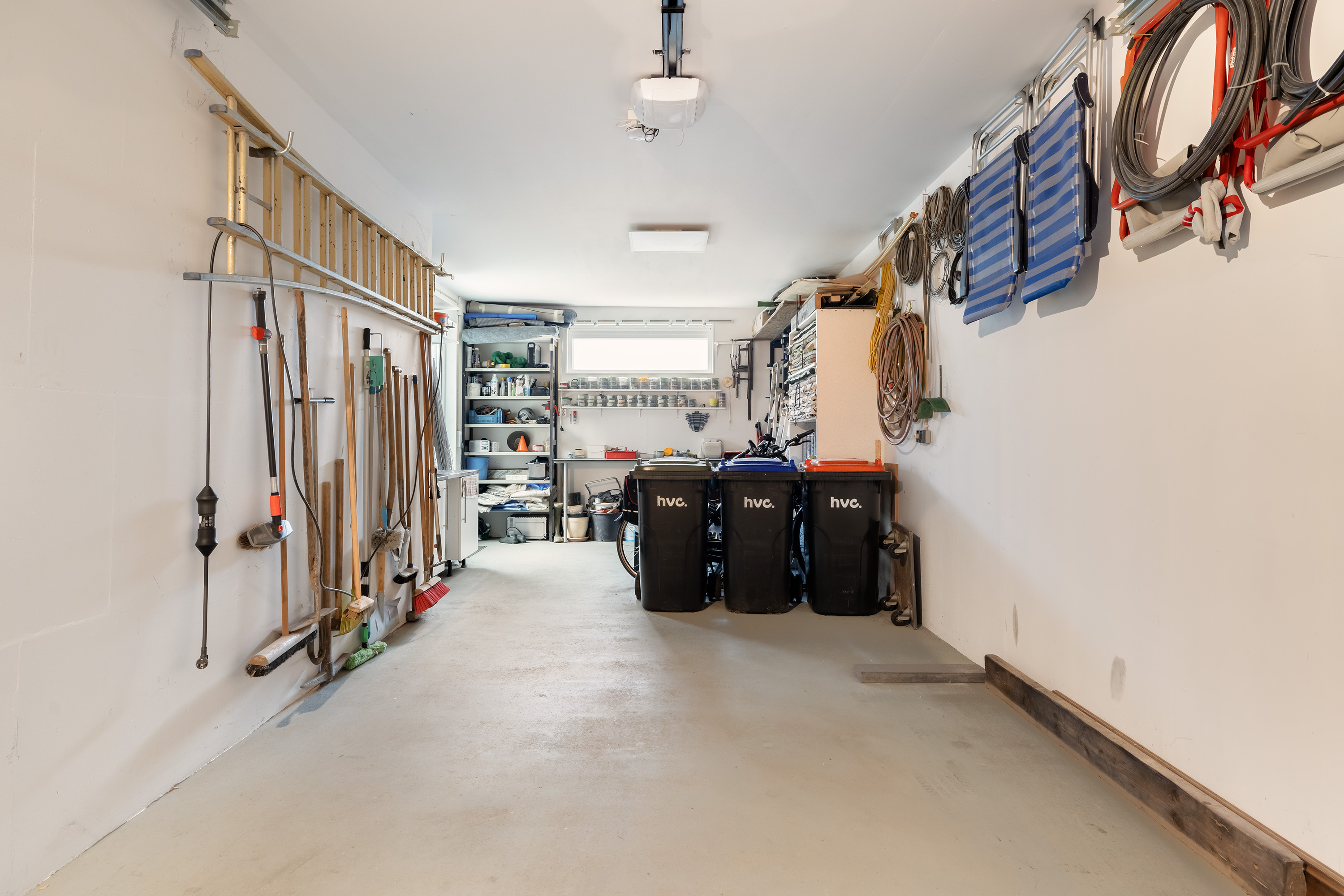 Features a neatly landscaped area and multiple parking spaces in front of the garage on private property.