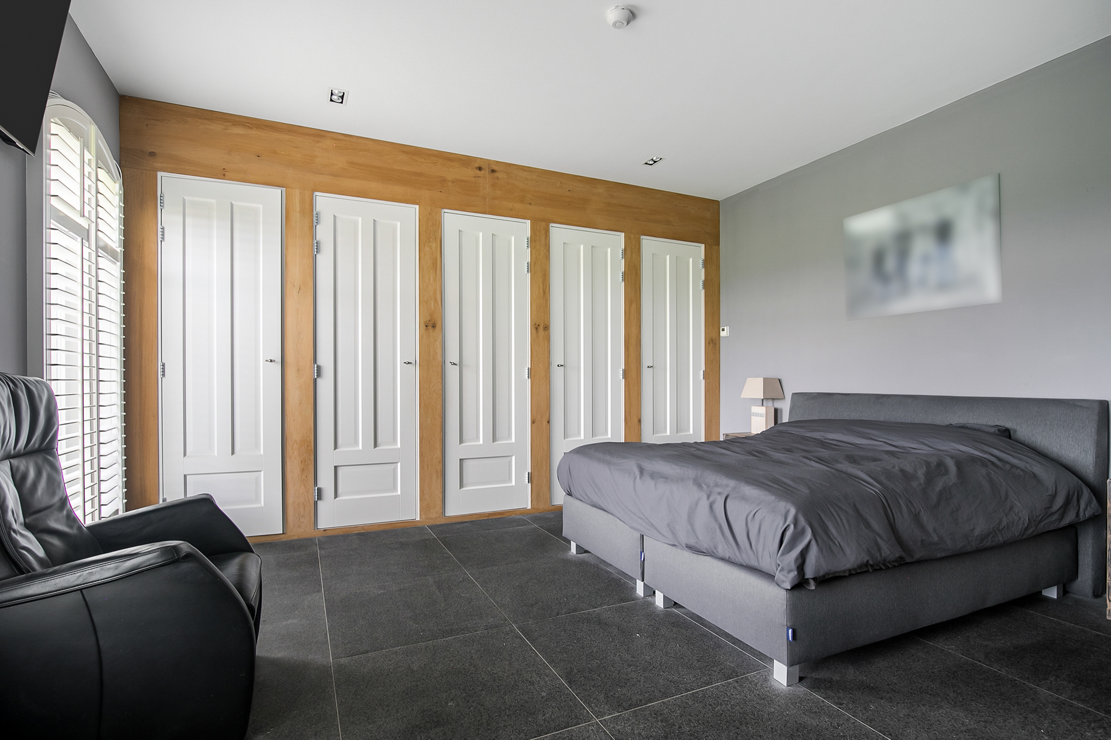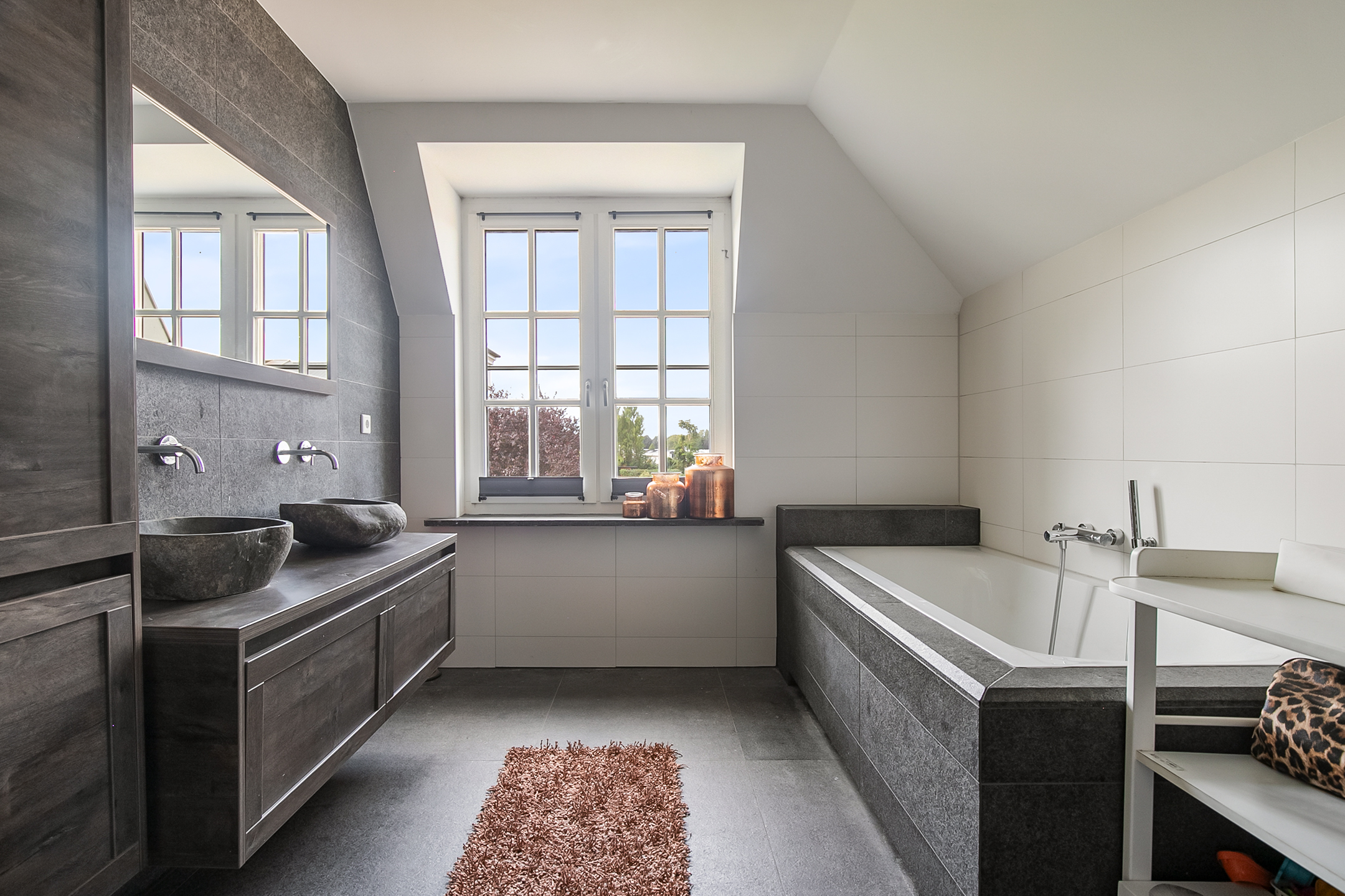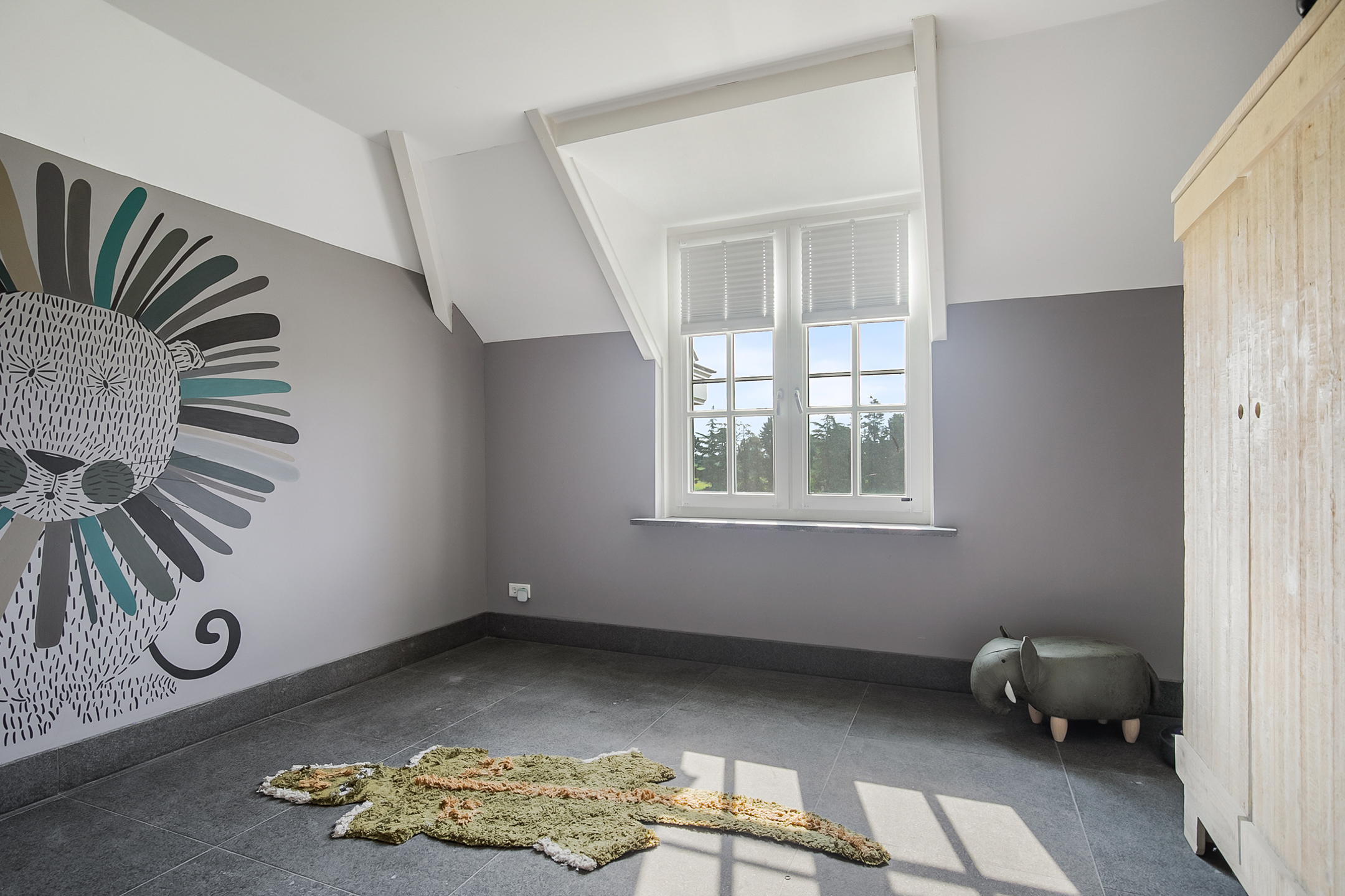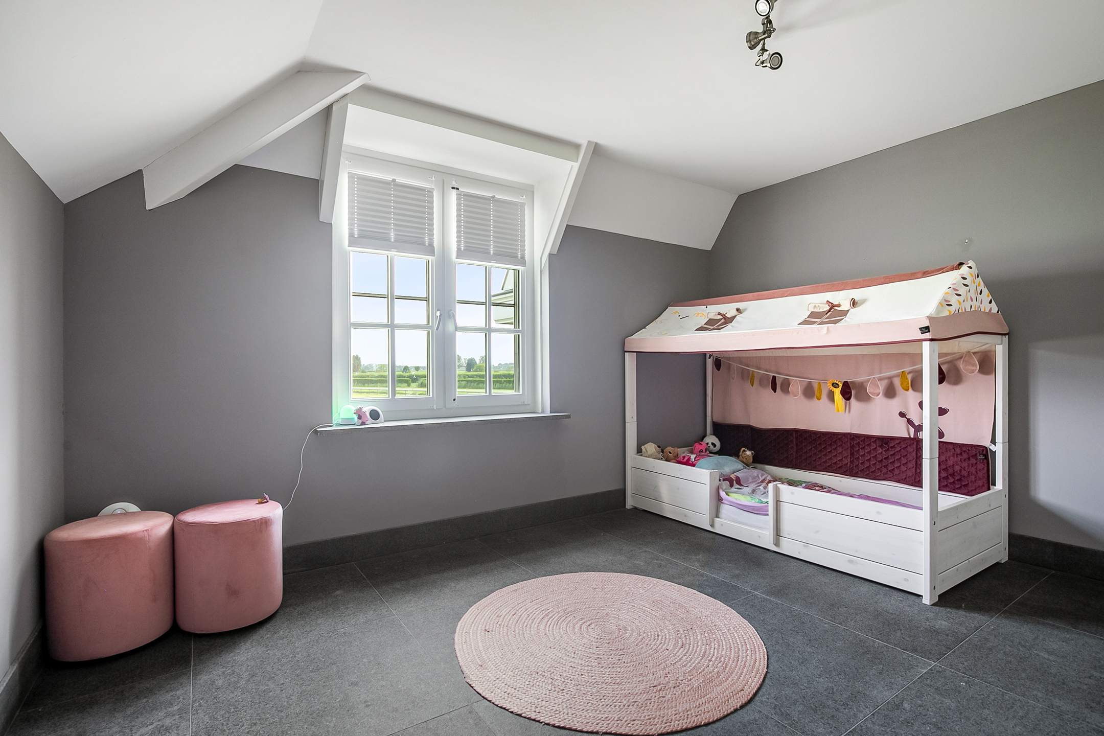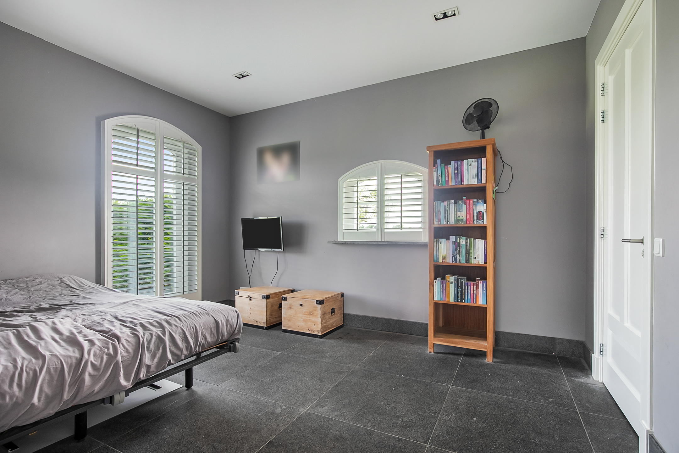 The covered entrance with a double sliding front door, gives this villa an attractive appearance. The spacious reception hall with imposing wooden staircase provides access to the living room and the 1st floor. The hall has a natural stone tiled floor, stucco walls and a stucco ceiling. The spacious living kitchen with dining area has a natural stone tiled floor, stucco walls and a stucco ceiling with recessed lighting. The kitchen features a wall-mounted unit with appliance wall and a cooking and rinsing island. The appliance wall is further equipped with an oven, coffee maker, steam oven and fridge. The island features a 5-burner gas hob with built-in extractor fan in the ceiling, a sink and a dishwasher. Various cupboards and drawers provide plenty of storage space. A large bay window/extension with French doors provide access to the garden. The many windows provide plenty of natural light. A fireplace adds atmosphere and warmth to the room. From the living room there is a nice view of the horse pastures. And here, too, large windows and double doors provide a sea of light. In addition, there is a beautiful, large fireplace with a gas fire that provides even more atmosphere and warmth in the room. Sliding doors close off the living room from the kitchen/dining area. Semi-circular French doors in the side wall of the house provide access to the front house. The spacious entrance hall provides access to the utility/laundry room, living room, toilet room and the meter cupboard. The utility/laundry room is equipped with a sink. Also located here are the connections for the washing equipment. From here, there is access to the office/workroom. The office space is a fine room which is obviously suitable for various purposes, such as a playroom or chill room.