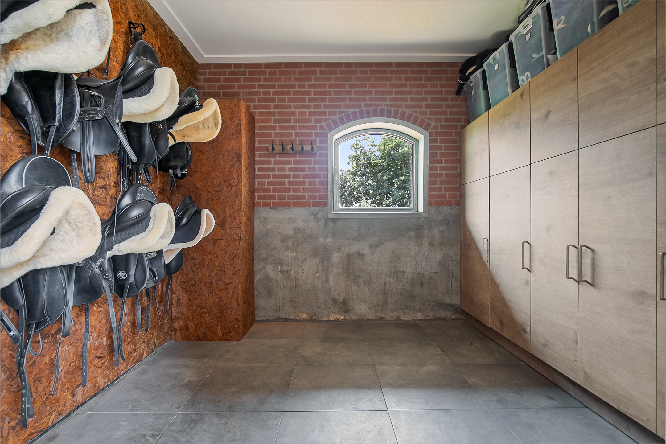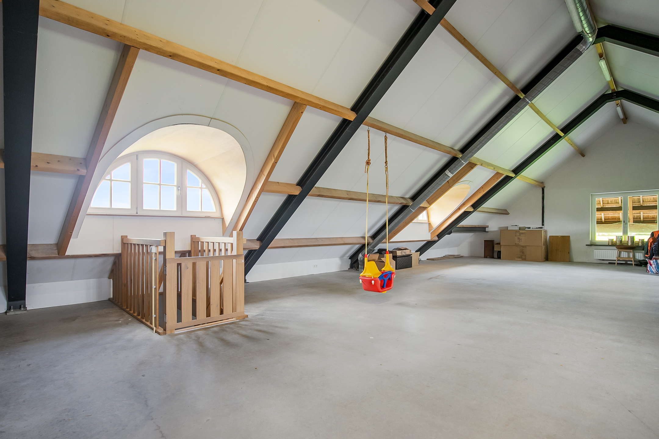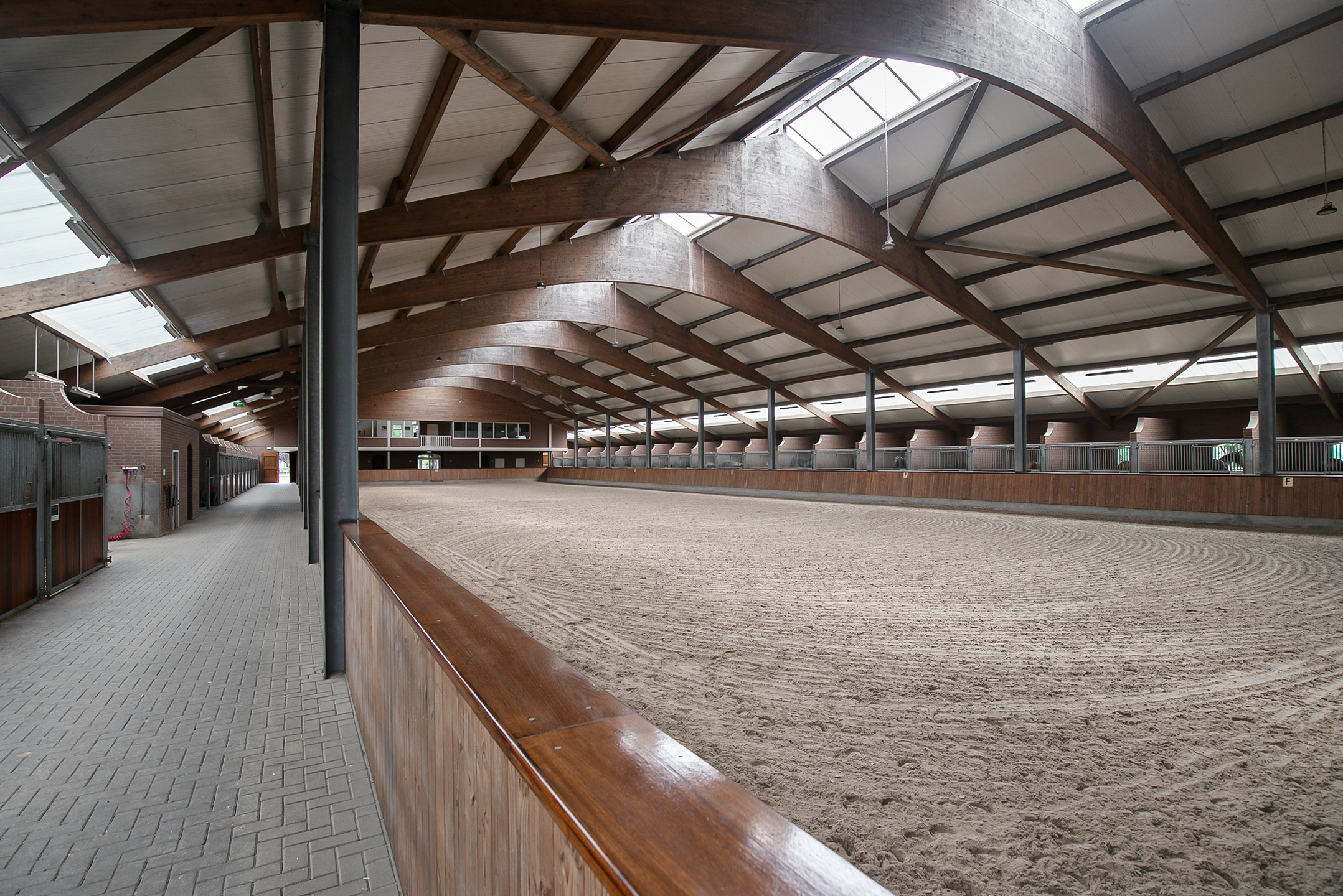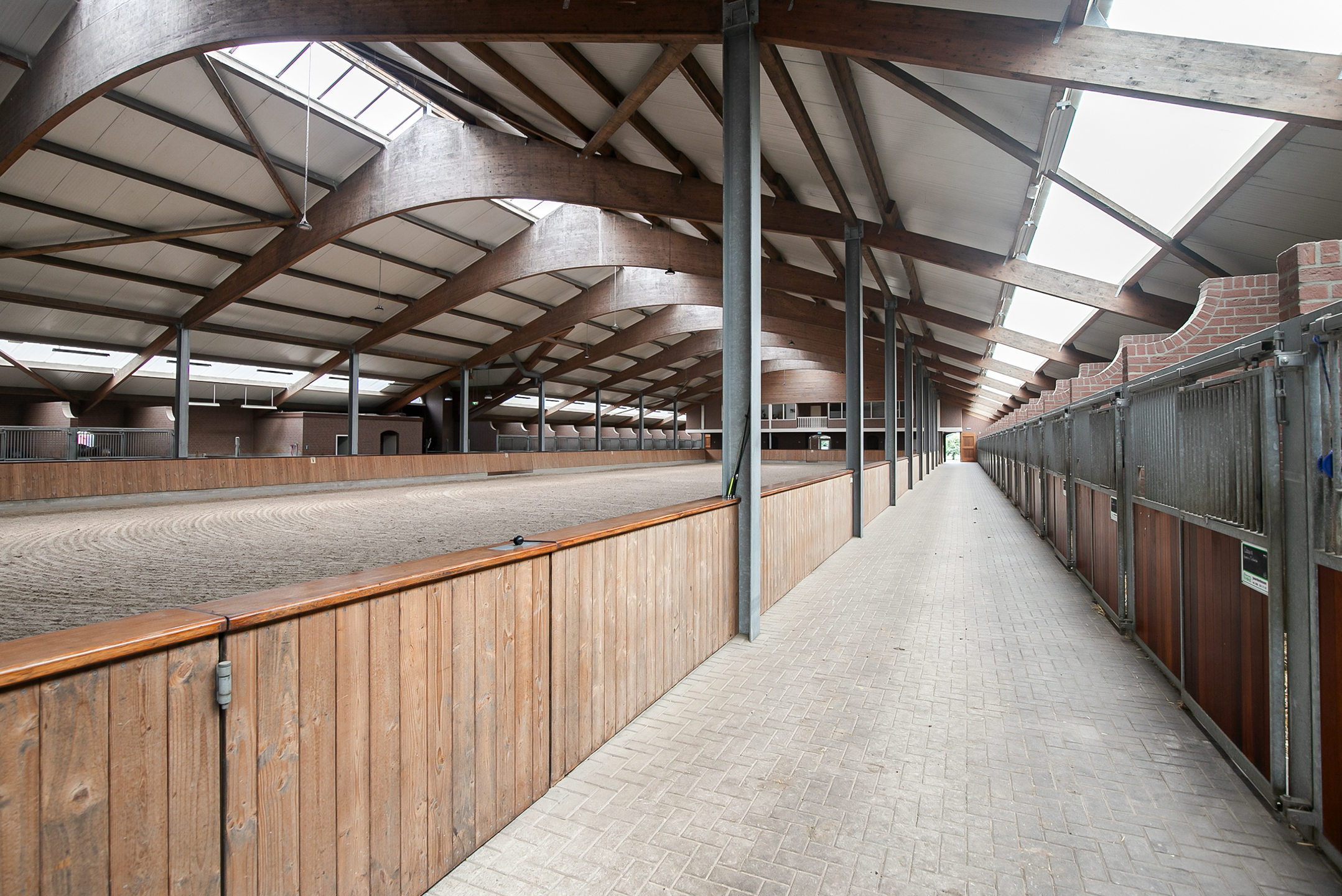 The hall at the front of the riding hall has a cobbled floor and provides access to a storeroom, toilet rooms, laundry room and a shop area. A spiral staircase provides access to the 1st floor. The reception area and a flat are located here. The reception area has a tiled floor, stucco walls and a suspended ceiling. There is a kitchenette and bar. French doors provide access to a balcony at the front of the riding hall. Large windows offer nice views of the indoor arena and stables. There is also access from the reception area to a balcony above the indoor arena.The flat is equipped with a living room with open kitchen, 2 bedrooms and a spacious bathroom. The flat has a tiled floor. The kitchen unit features a sink, induction hob, dishwasher, fridge and combination microwave. The bathroom is fully tiled and further equipped with a shower room, washbasin with cabinet and a floating toilet. A laundry room is located behind a practical sliding wall. The indoor arena (approx. 21x61 m) is equipped with a professional soil (Ben Agterberg), a beautiful hardwood arena edge. Vaulted wooden rafters add to the atmosphere. A skylight in the ridge provides beautiful natural light. LED lighting is also available. The 39 horse stalls are divided over two stall corridors. The stalls have partly hardwood / partly galvanised front walls and masonry partitions and rear walls. The doors of the stalls are hinged. The stalls are also equipped with an outside hatch. Each stall corridor has its own facilities such as washing areas and a tack room. Between the corridors there are three spacious loose boxes. The washing areas are equipped with hot and cold water supply. There is also a place for the farrier and physio. There is another flat at the rear. Access is gained via a flight of stairs on the outside. There is also a balcony here. The flat features a spacious living room with open kitchen, 3 bedrooms, a spacious bathroom, a utility room, laundry room and a toilet room.At the rear of the plot is a detached field barn situated. The barn is constructed of masonry skirting with sheet pile walls and the insulated roof is covered with sandwich panels. At the front, the field barn is fitted with windbreak netting. There is a feed silo in the barn. There are currently 14 horse boxes and a lunging circle, but this barn is of course also extremely suitable for various other purposes.