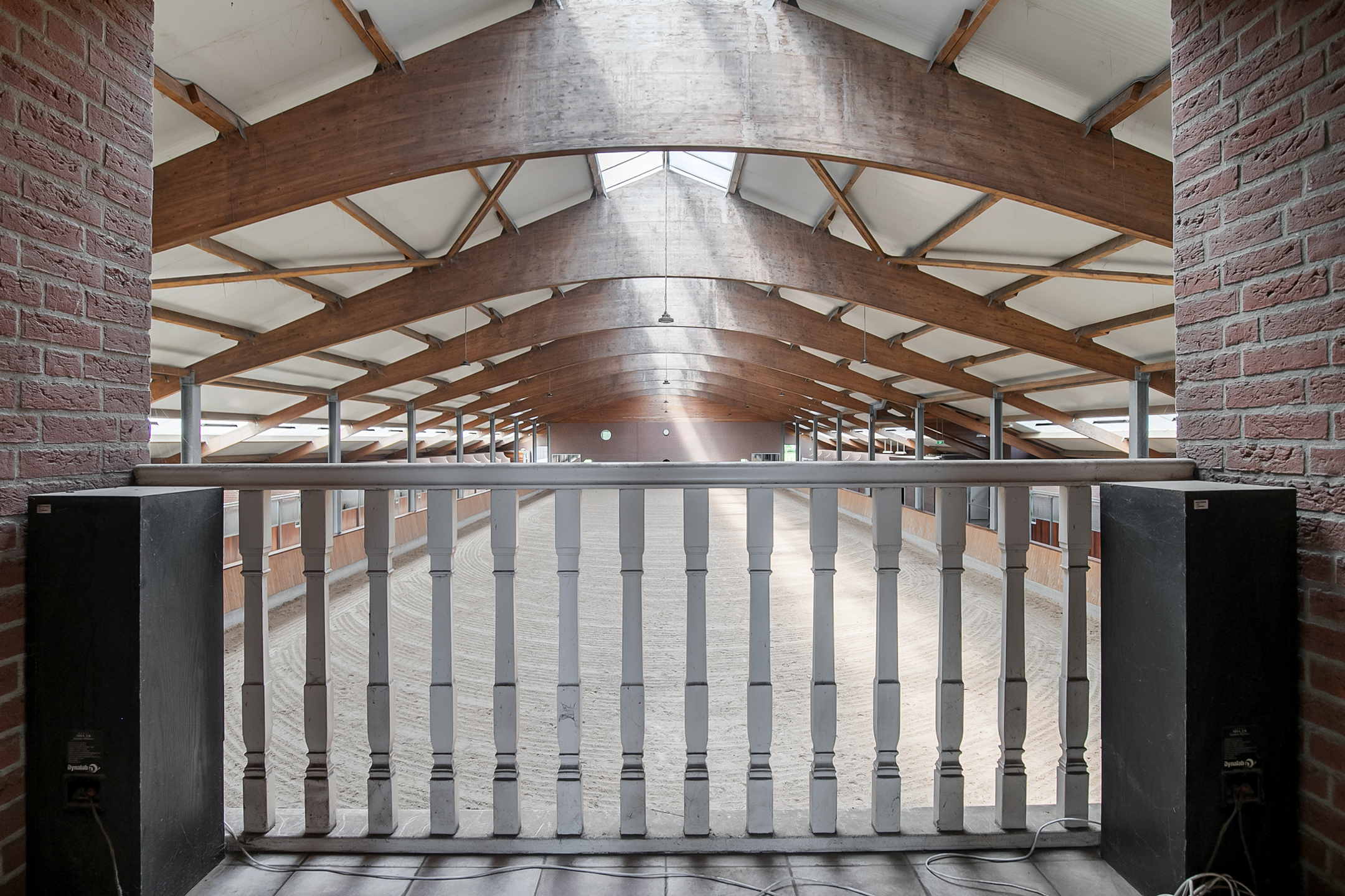 The riding hall is built of masonry facades with rafters. A skylight in the ridge and above the stables provides plenty of natural light. French doors in the front facade provide access.