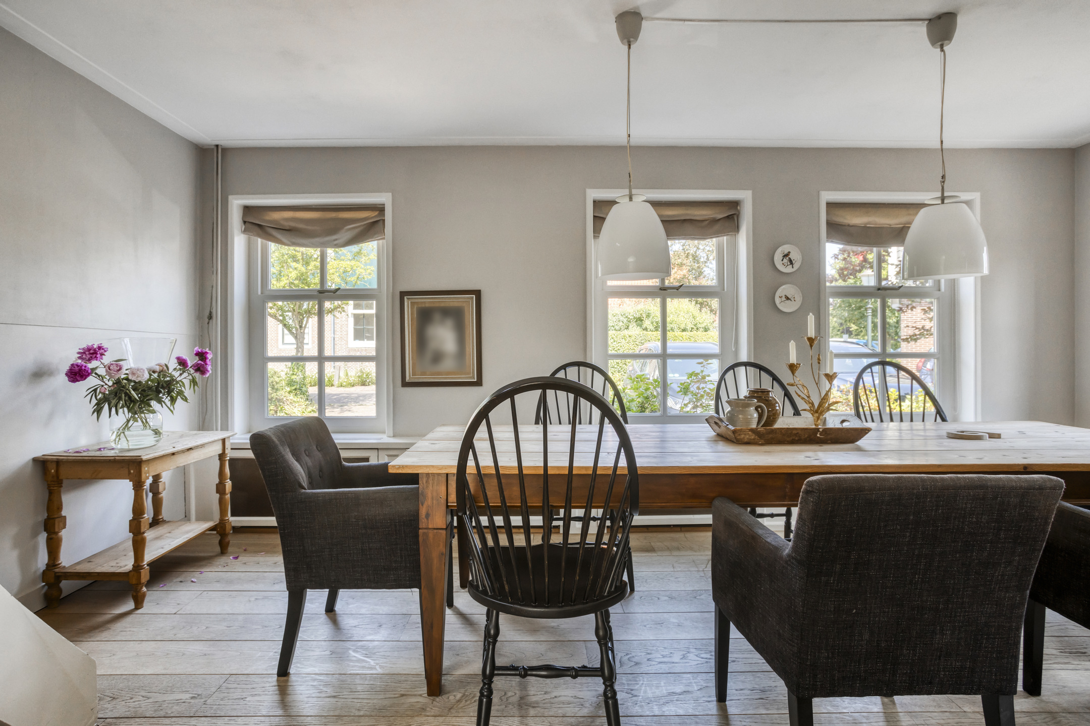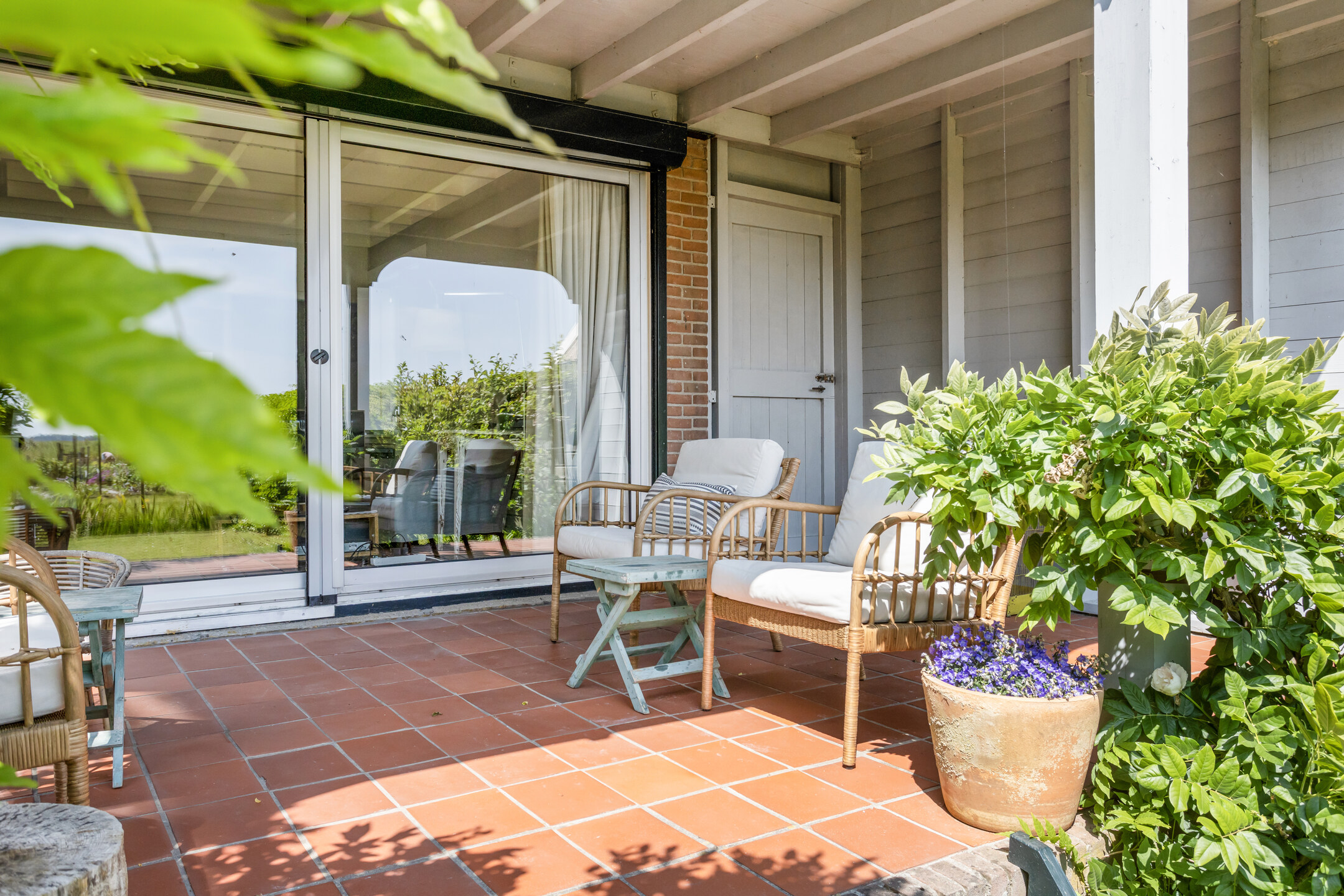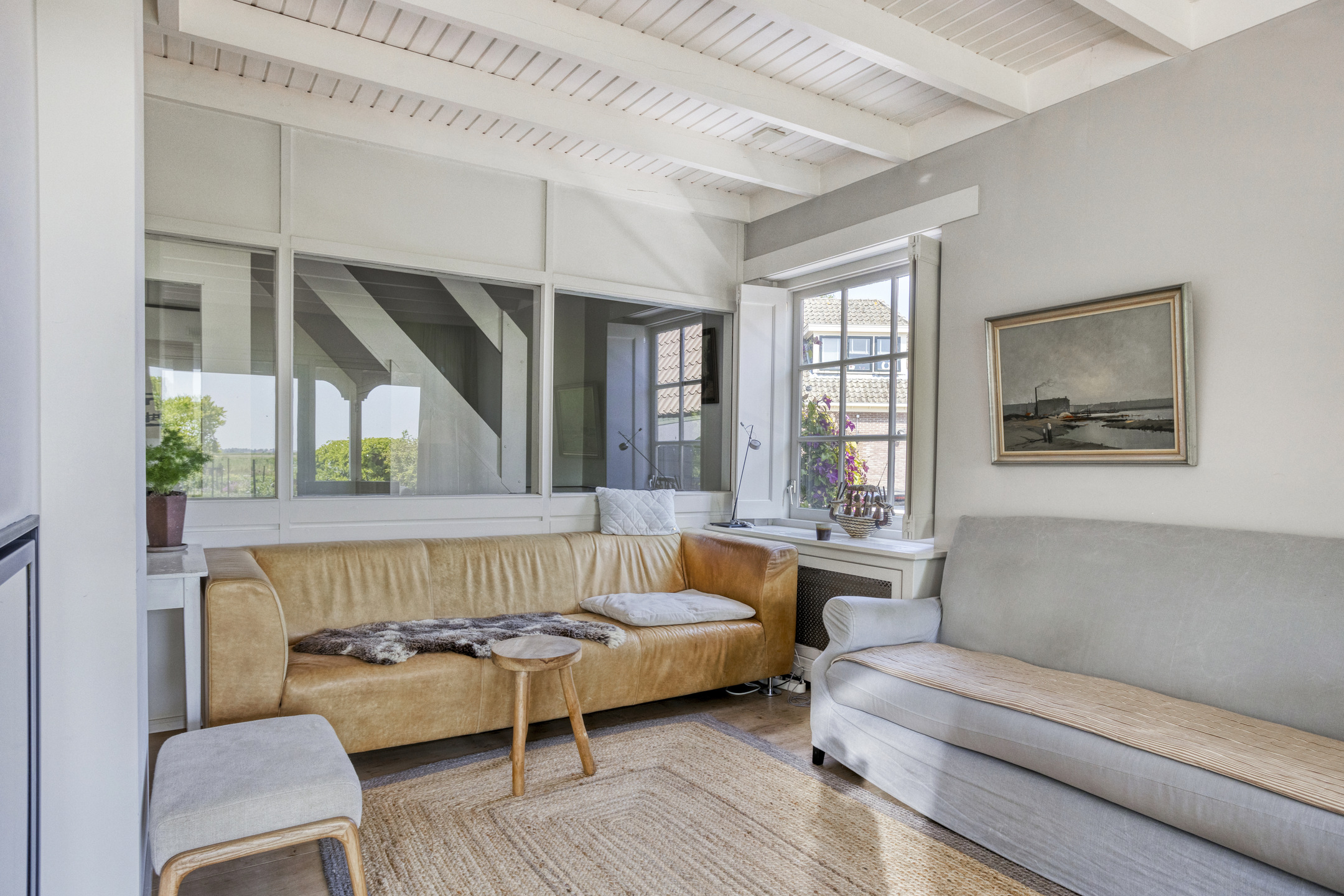 Through the front door, you enter a hallway that leads to the front house. At the front is the semi-open kitchen, equipped with a 5-burner gas hob, oven, dishwasher, and a freestanding fridge-freezer. Adjacent to the kitchen is the cozy dining room with beautiful light from the large windows, forming the warm heart of the home. Next to the dining room is a comfortable living room, which can easily switch functions with the dining room if desired. From the dining room, a staircase also leads to the first floor of the front part of the house.