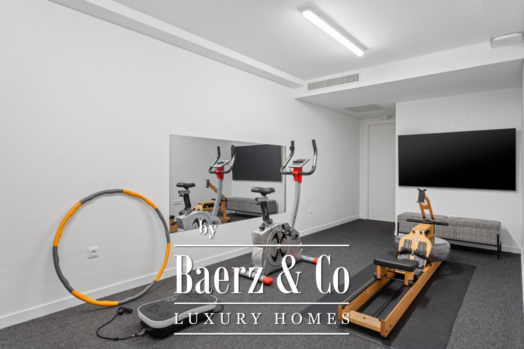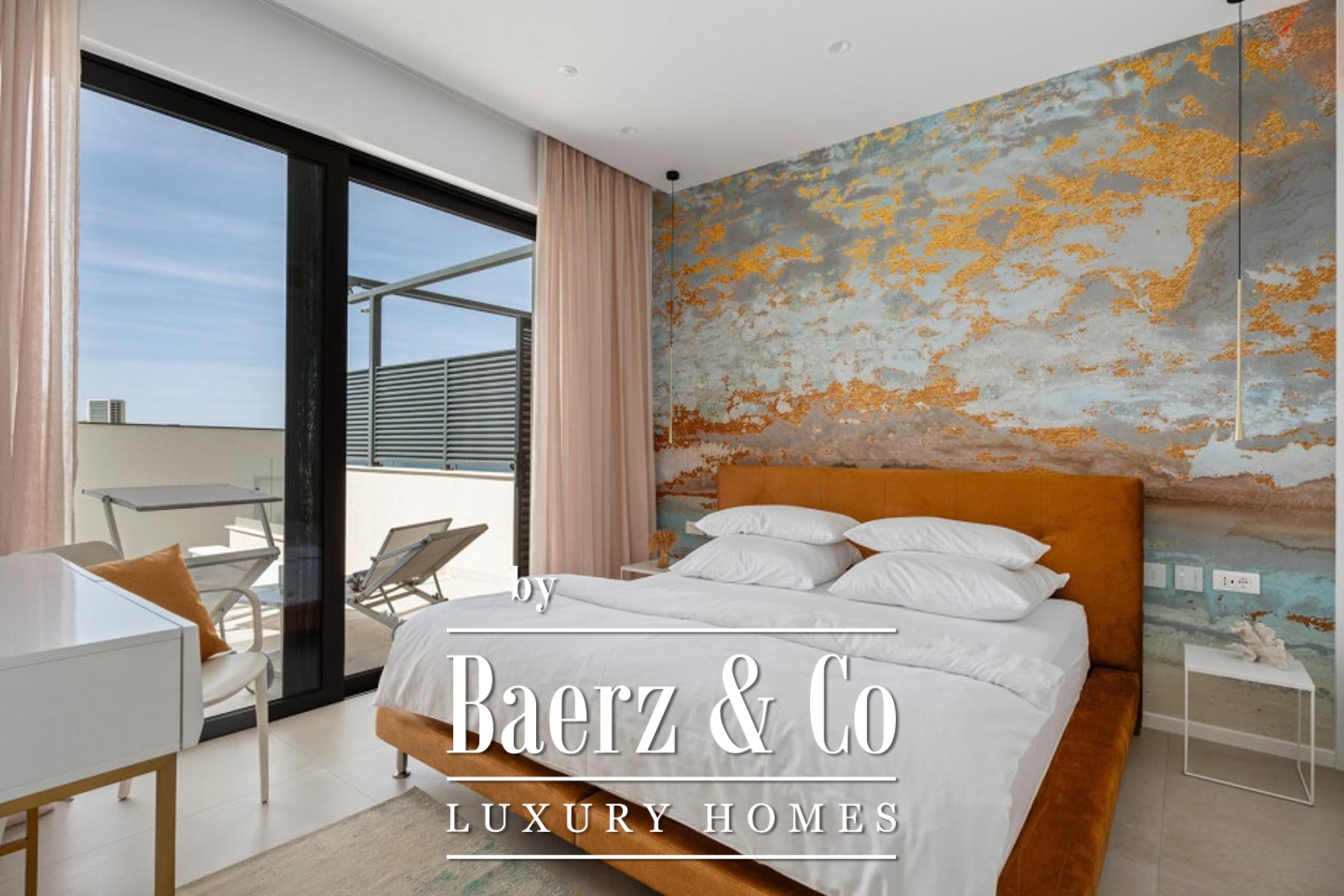 Three bedrooms, two bathrooms, and an additional guest toilet emphasize functional elegance. The upper floor reveals generous ceiling heights and panoramic sea views from the living area, creating an uplifting sense of space. Throughout, smart home technology is integrated alongside underfloor heating, air conditioning, and electrically operated roller shutters. Two dedicated parking spaces provide convenience.