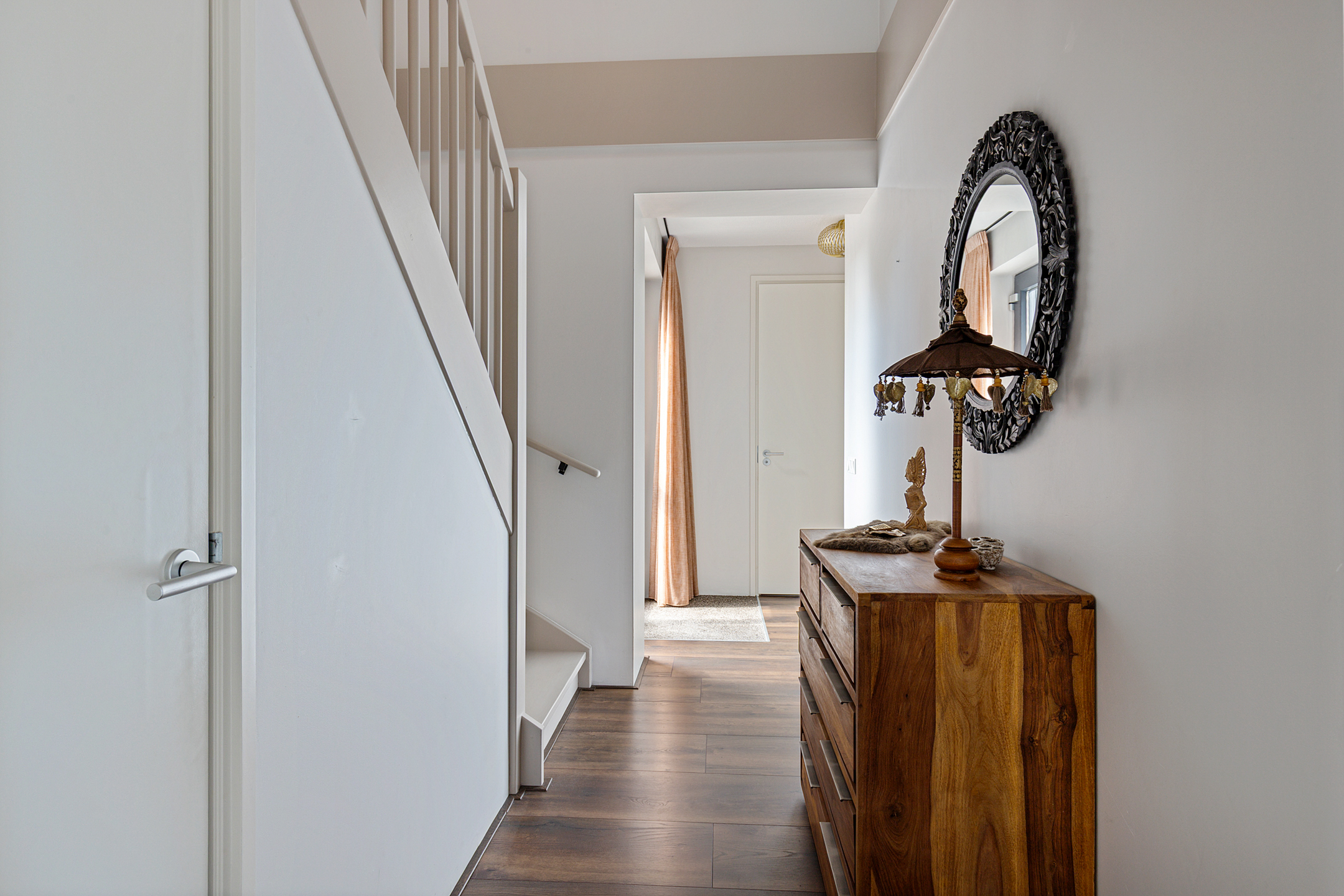 The utility room houses the advanced heat pump system with 190-litre boiler and laundry connections. The whisper-quiet air-source heat pump is discreetly placed outside. Throughout the ground floor, a refined laminate floor with underfloor heating and cooling ensures both style and comfort.