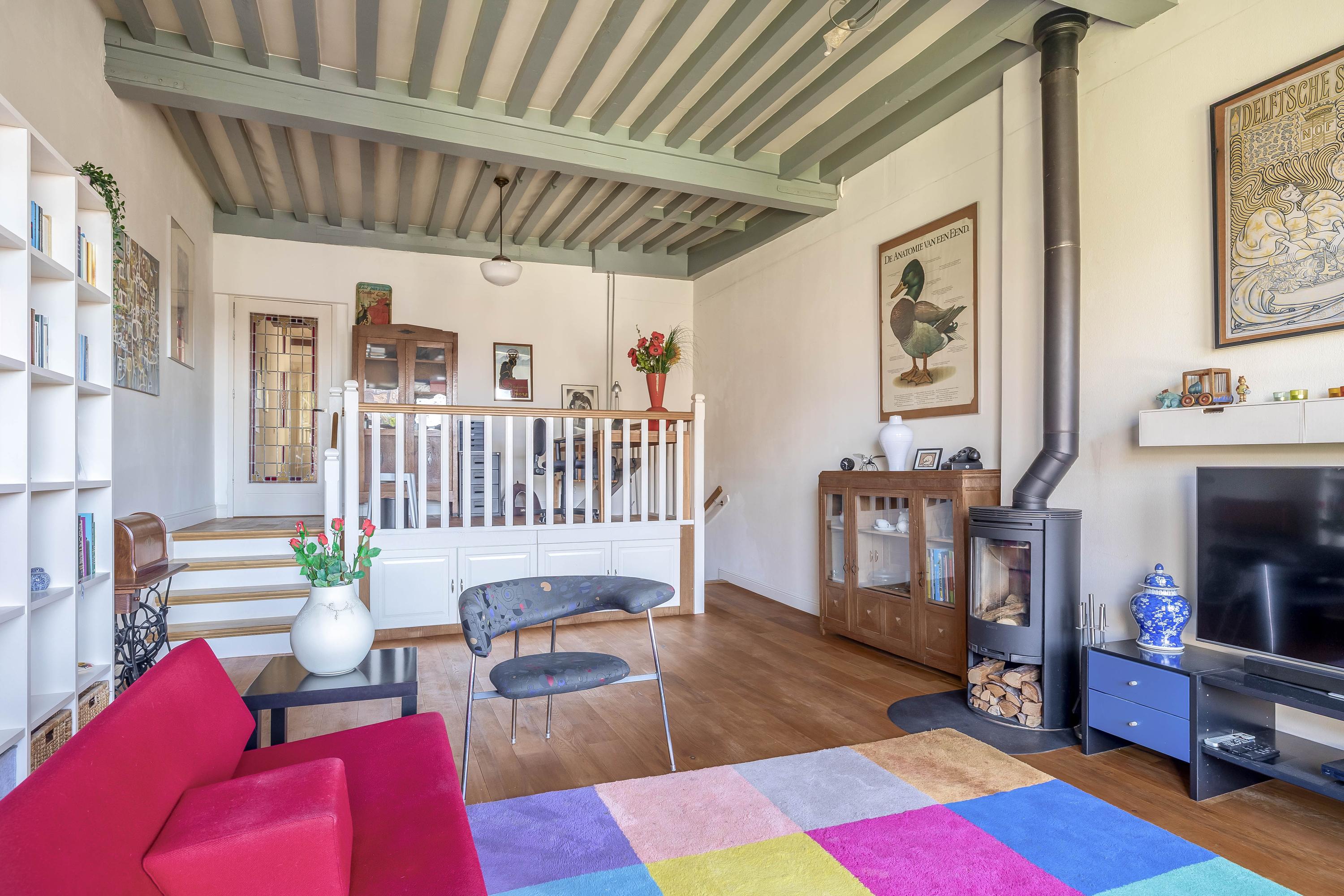 Shop space with beautiful wooden molded ceiling, staircase (fully renewed), studio with loft ladder to attic storage, toilet, second staircase (fully renewed), large kitchen-diner with stunning garden view, kitchen equipped with induction cooktop, extractor hood, combi oven, convection oven, dishwasher, kitchen boiler, marmoleum flooring with underfloor heating, and door to southwest-facing terrace.