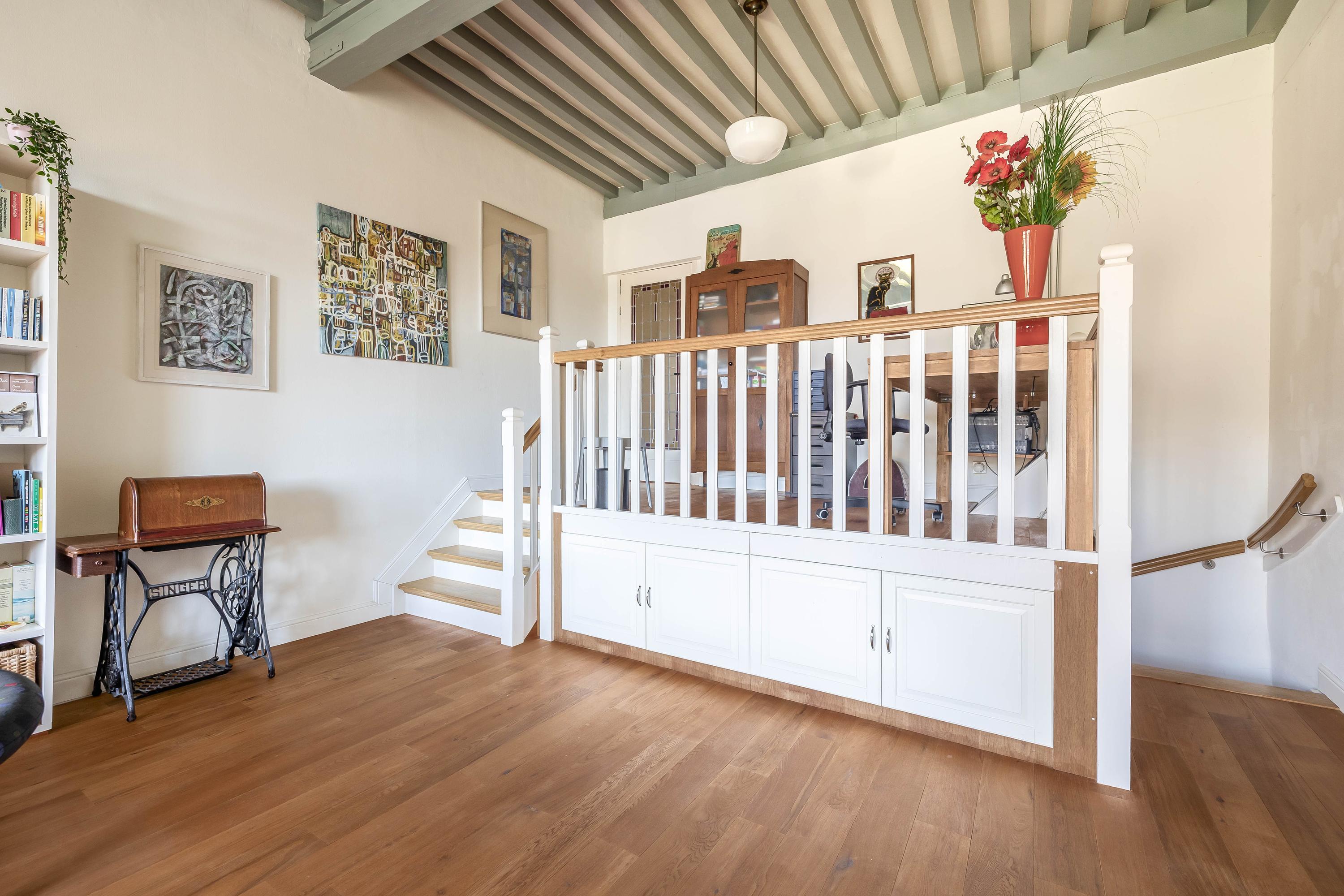 The history of many buildings along the harbor is beautifully visible in this property. The large barrel-vaulted cellar dates from the 15th century. From the 16th century, “moor and child beam” constructions are present throughout the building. The façade, front room, and hallway were transformed in the 18th century into Louis XIV style, including an elegantly carved cornice with four consoles, a vaulted ceiling in the hallway designed for a lantern, a wooden carving of the tree of life above the interior door, and a wooden molded ceiling. On the 1st floor, unique stencil paintings have been uncovered.
