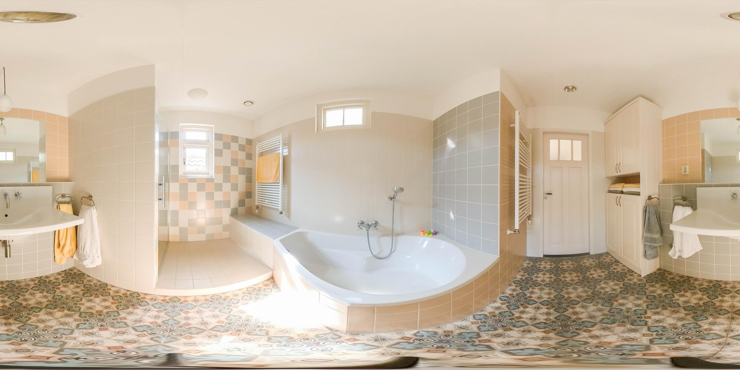 Spacious landing with roof light, laminate flooring, toilet (wall-mounted toilet and small sink), bright bathroom with walk-in shower, bathtub, sink, windows, fully tiled, and designer radiator