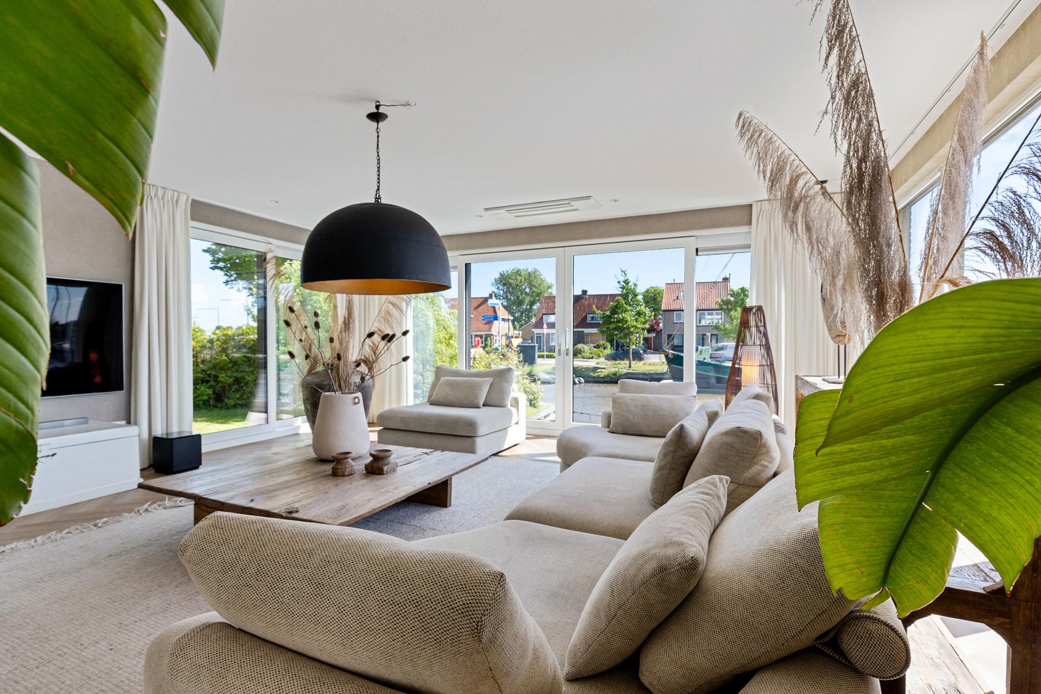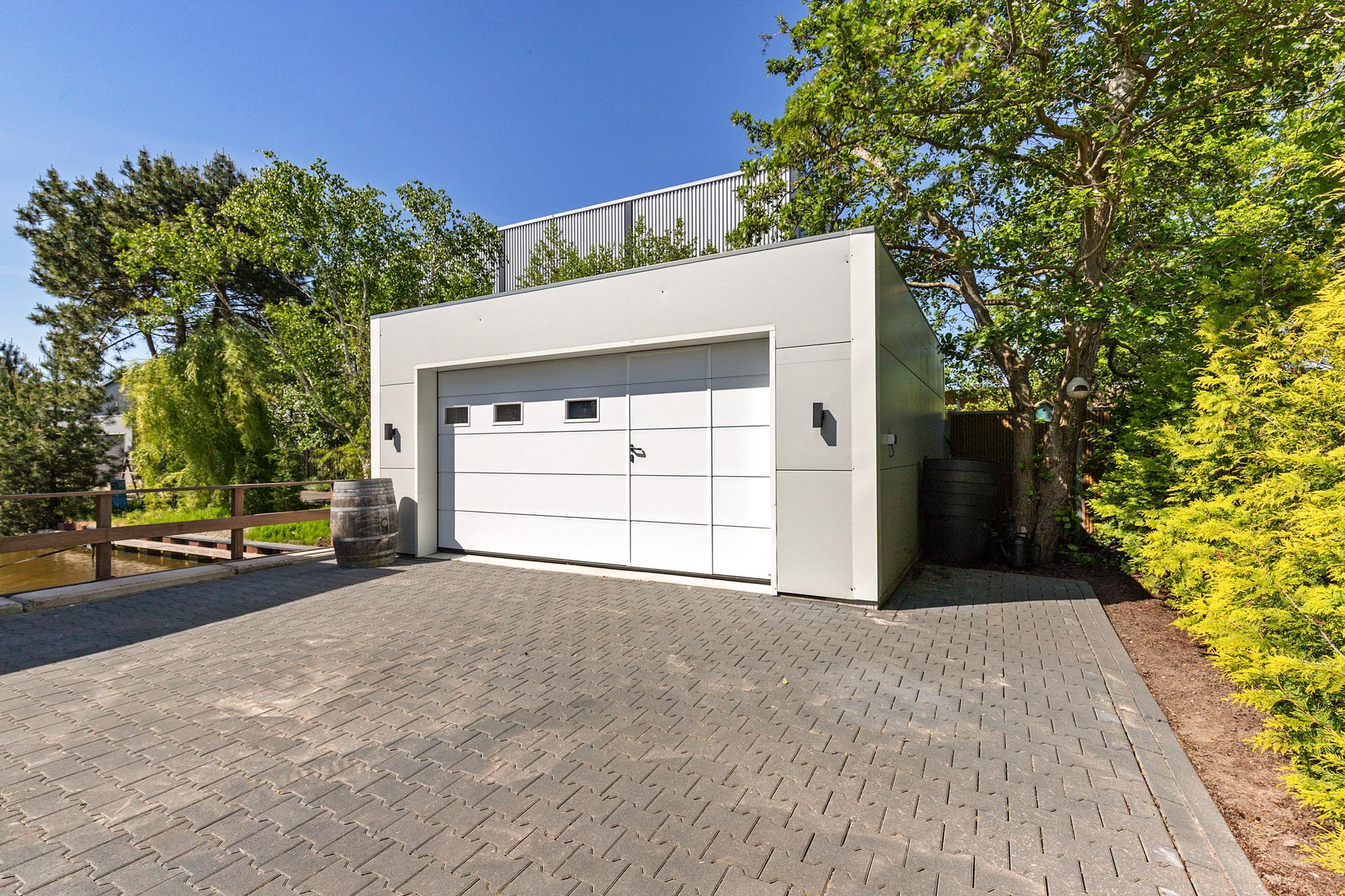 The entire plot is enclosed by a stylish maritime-themed fence and an electric gate. The southeast-facing garden is professionally landscaped with mature (fruit) trees, lush lawn, and vibrant flowering borders. It's a haven for birds, from snipe to jays—there’s even a duck nesting in one of the planters by the waterside terrace.