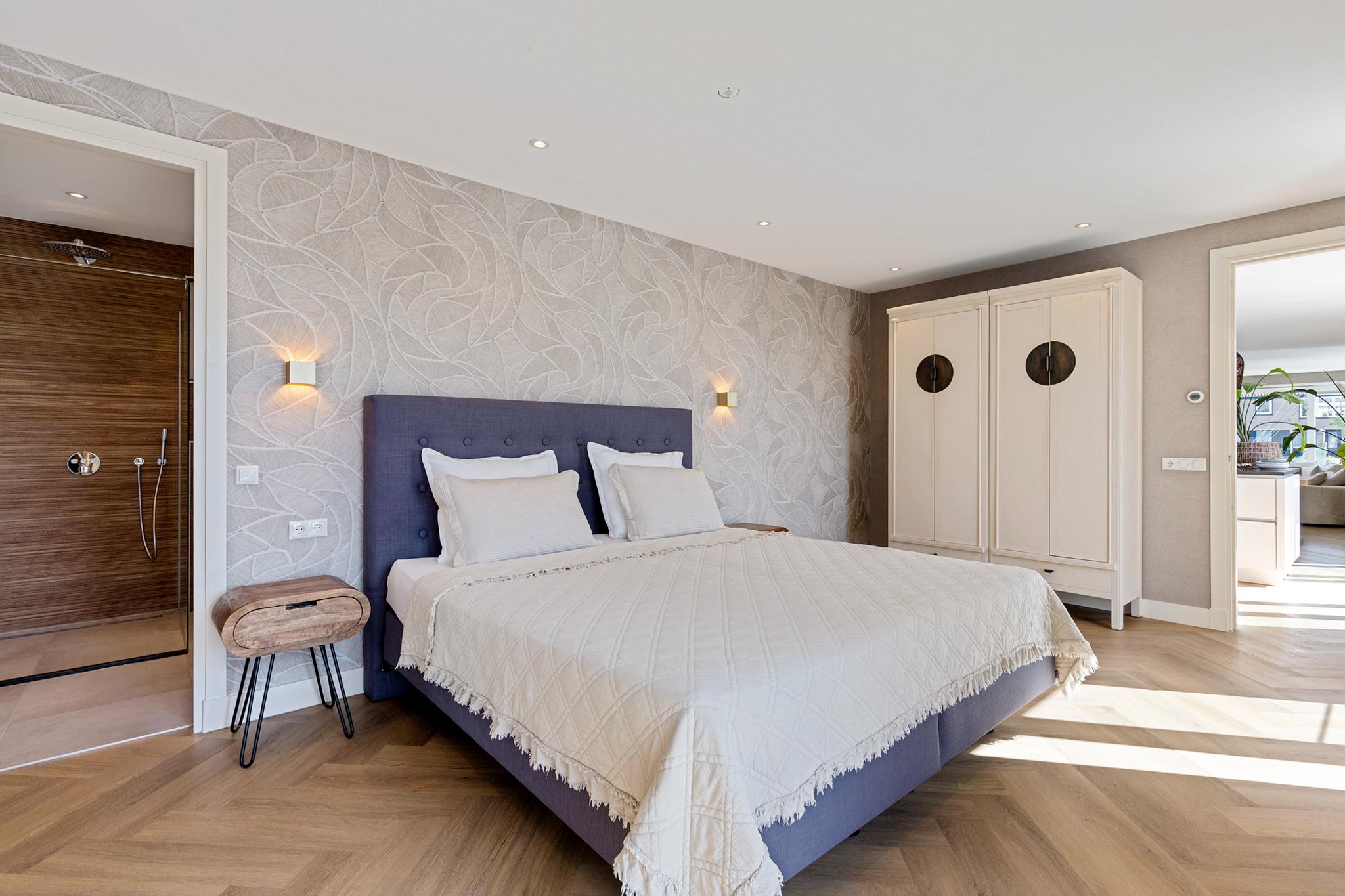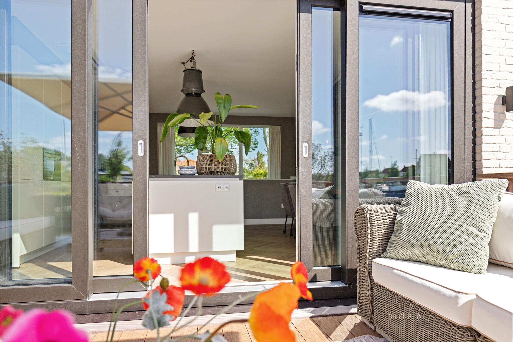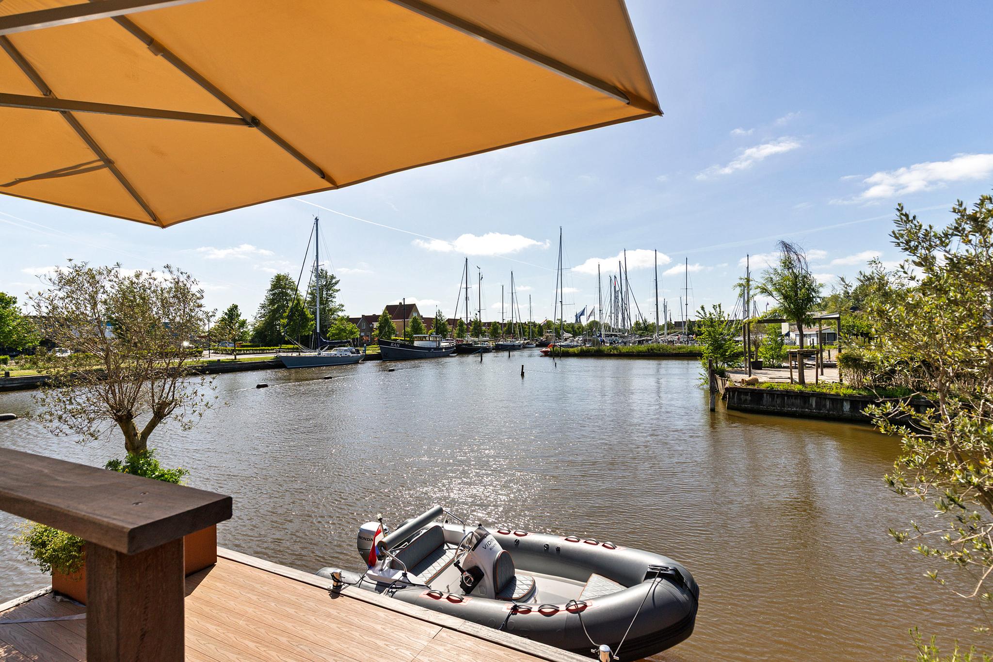 The west-facing sundeck, accessible from the open kitchen, provides a sheltered spot to enjoy life on the water. It’s the perfect place to sit back and watch boats pass by. A spacious private berth alongside the villa accommodates a sailing or motor yacht. The location lies directly on the Standing Mast Route, with access to the open sea and the Frisian Lakes.