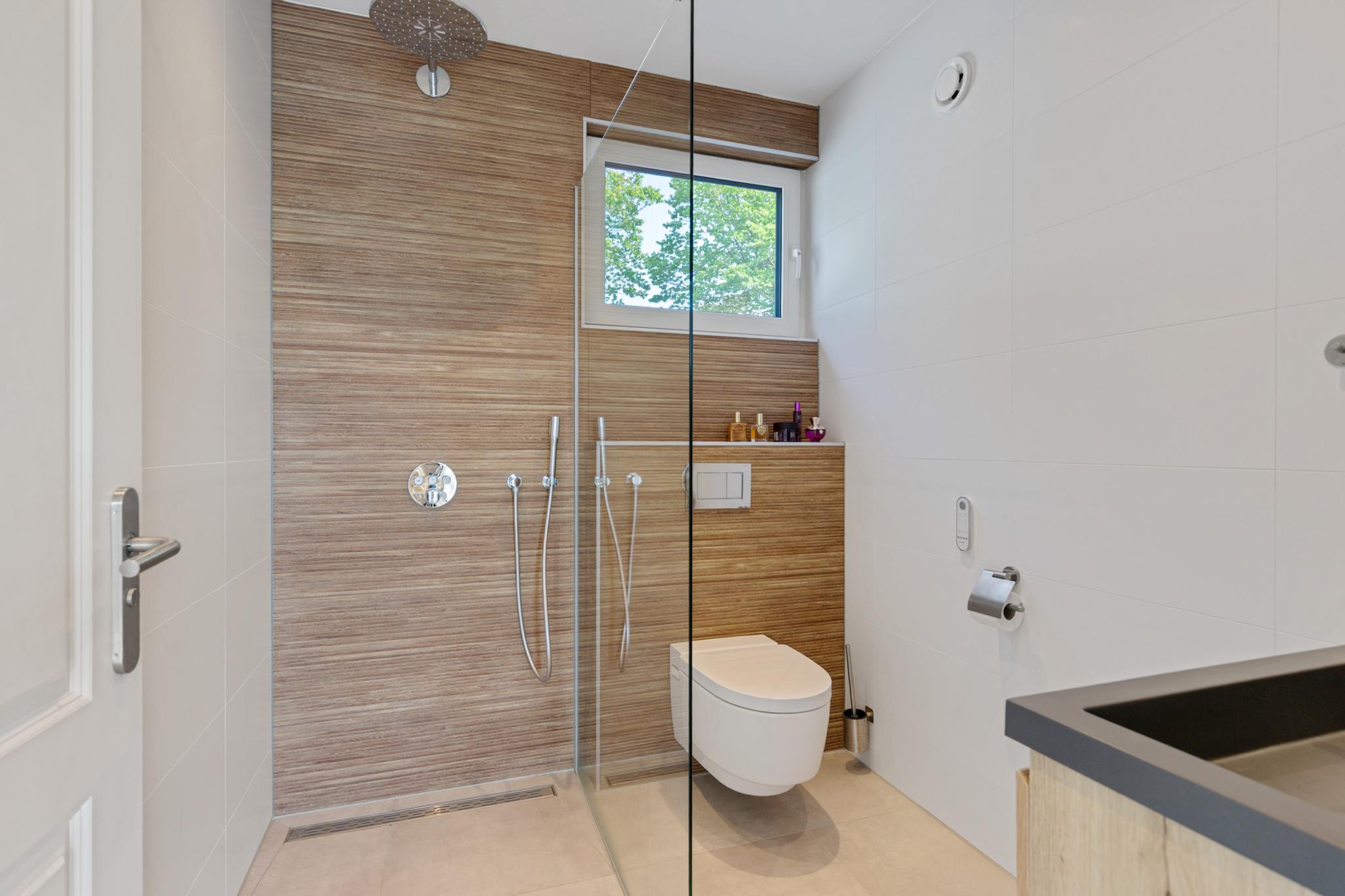Upon entering, a hall with cloakroom and guest toilet welcomes you. Industrial-style glass doors open into the expansive living room—and the view is simply breathtaking. Thanks to three large sliding doors and floor-to-ceiling windows, the connection to the water is immediate. Elevated above the lower level, the open-plan kitchen and living area provide privacy as well as stunning vistas.