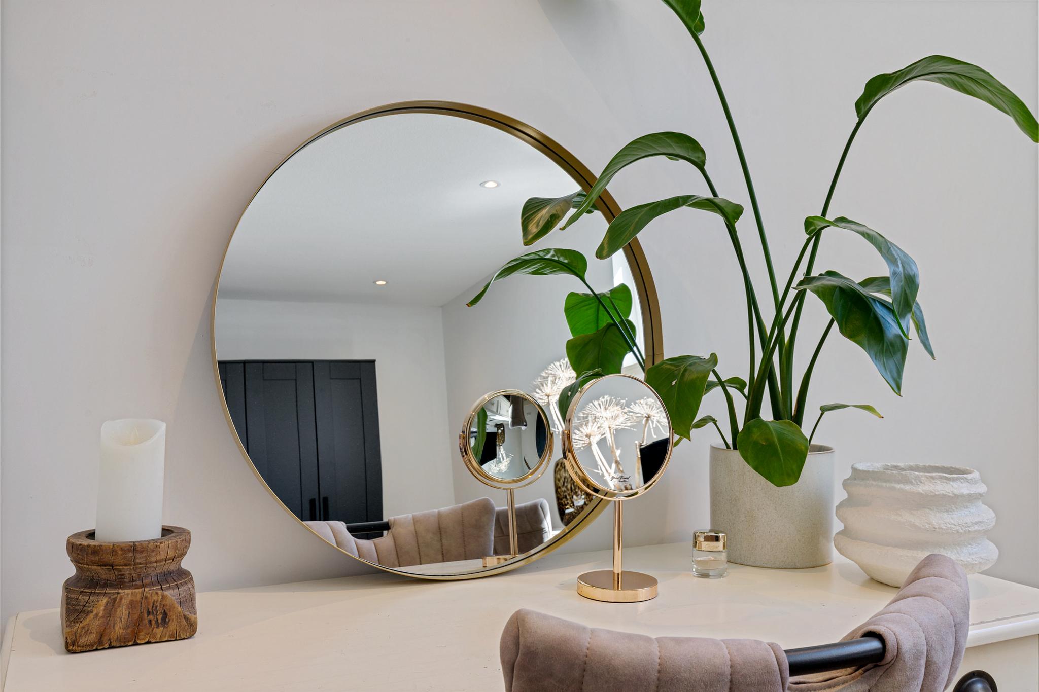 A custom-designed open staircase beside tall windows leads to the lower-level hall, where you’ll find three additional bedrooms, a second luxury bathroom, and a spacious utility room. All bedrooms benefit from generous natural light.