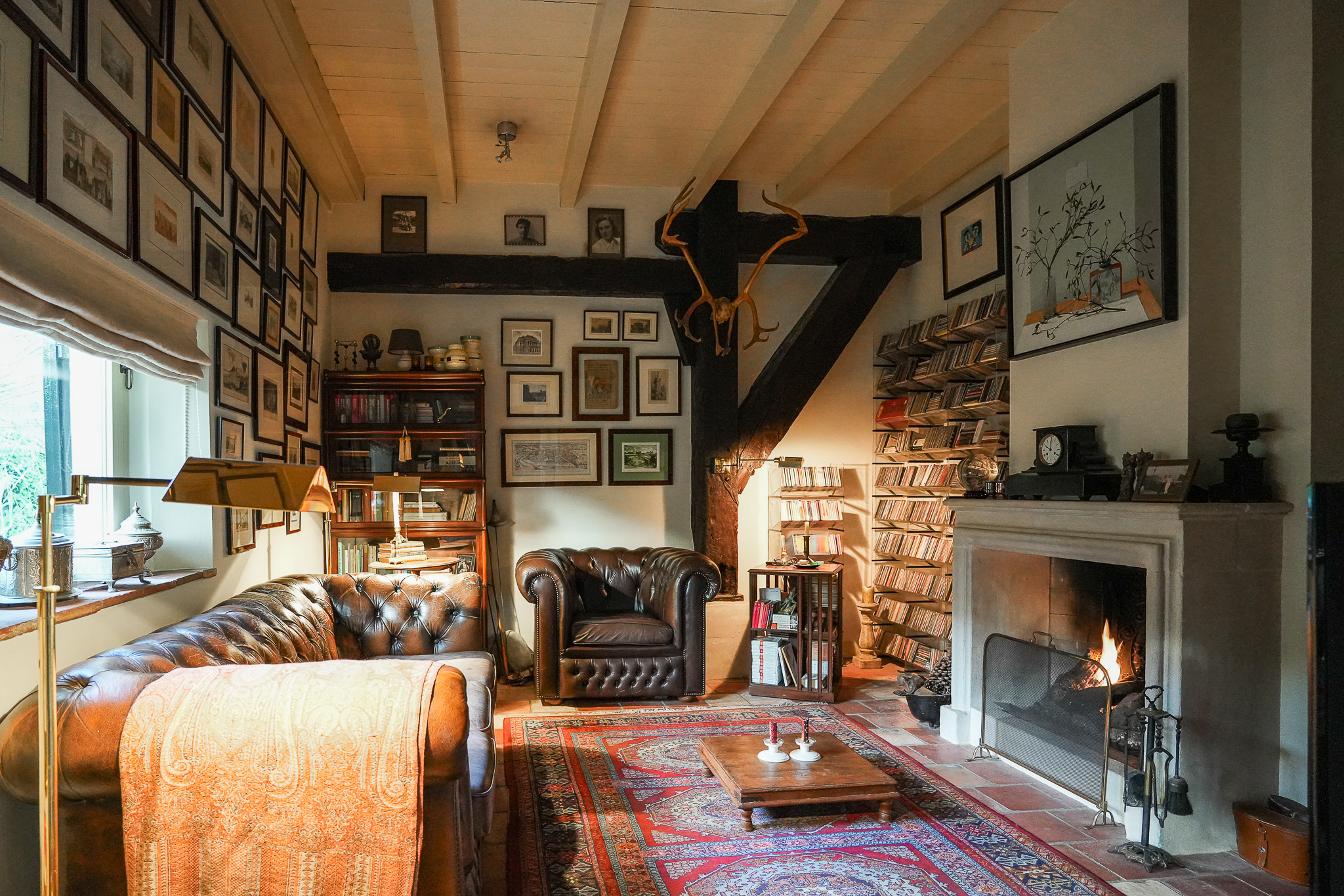 A spacious hall opens to the bright, garden-facing living room in the former barn, a cosy country kitchen with access to the wine cellar, and a central corridor with an adjacent bedroom with open fireplace, dressing room, the first bathroom, and a study overlooking the garden — all on the ground floor.