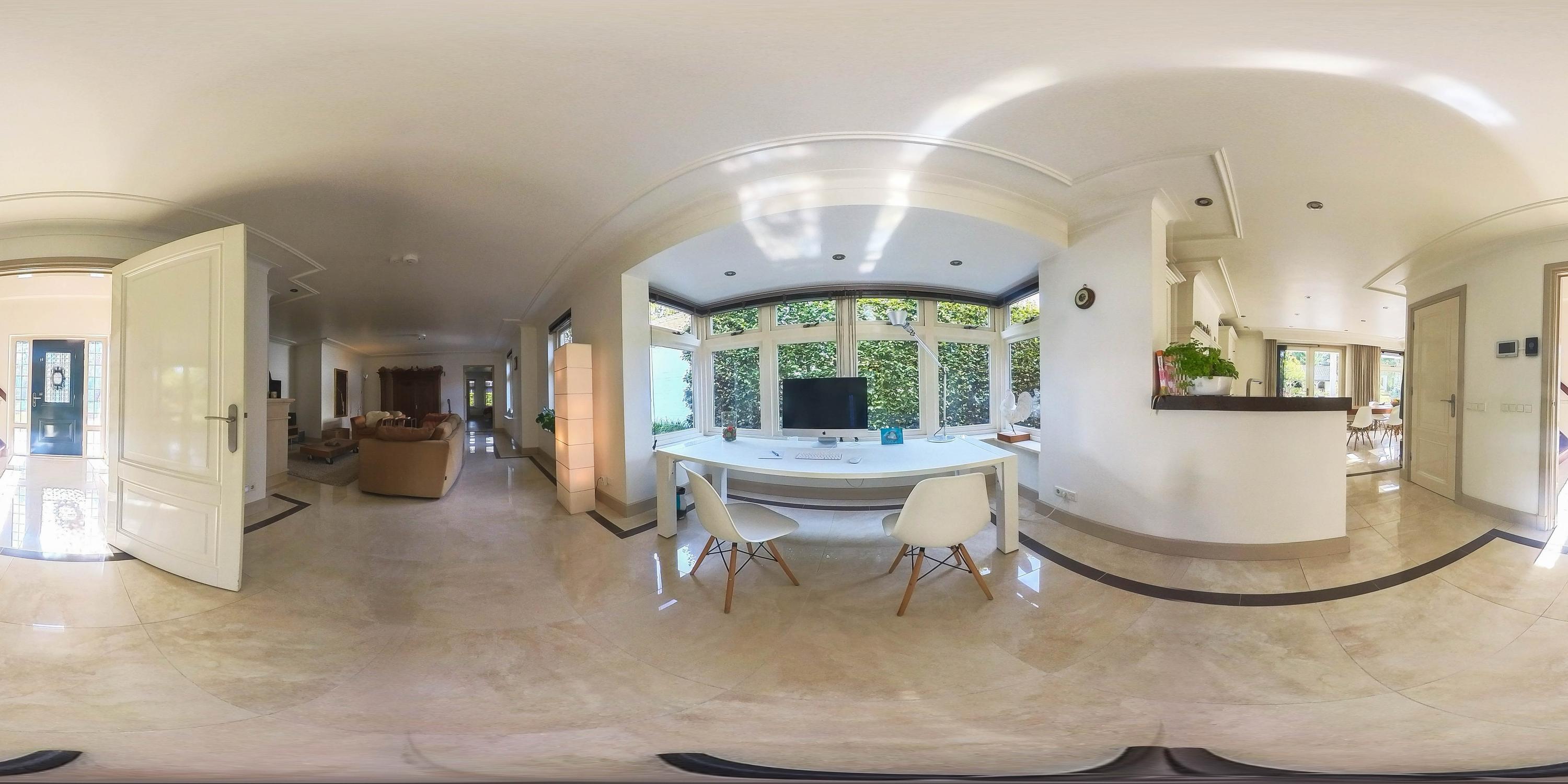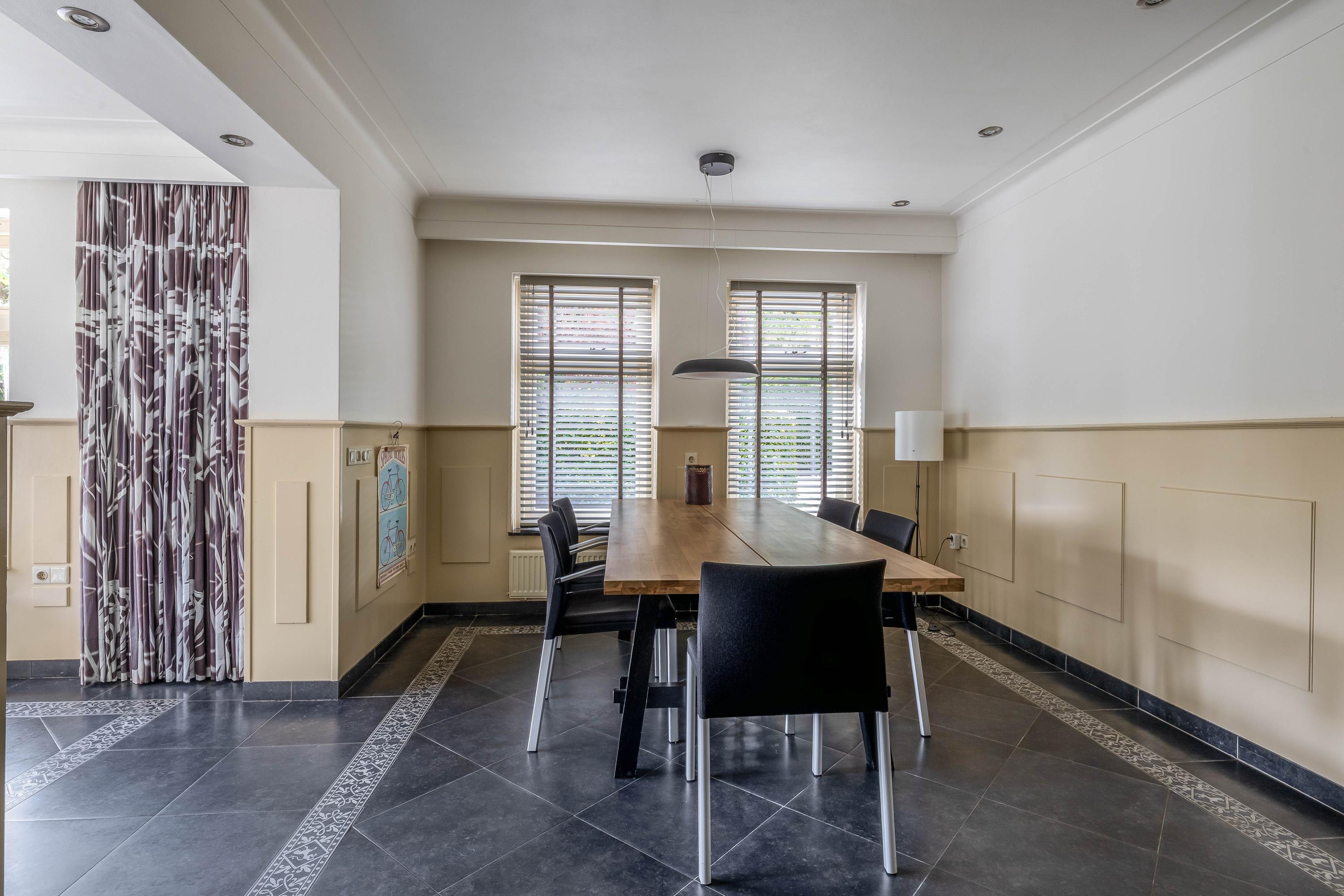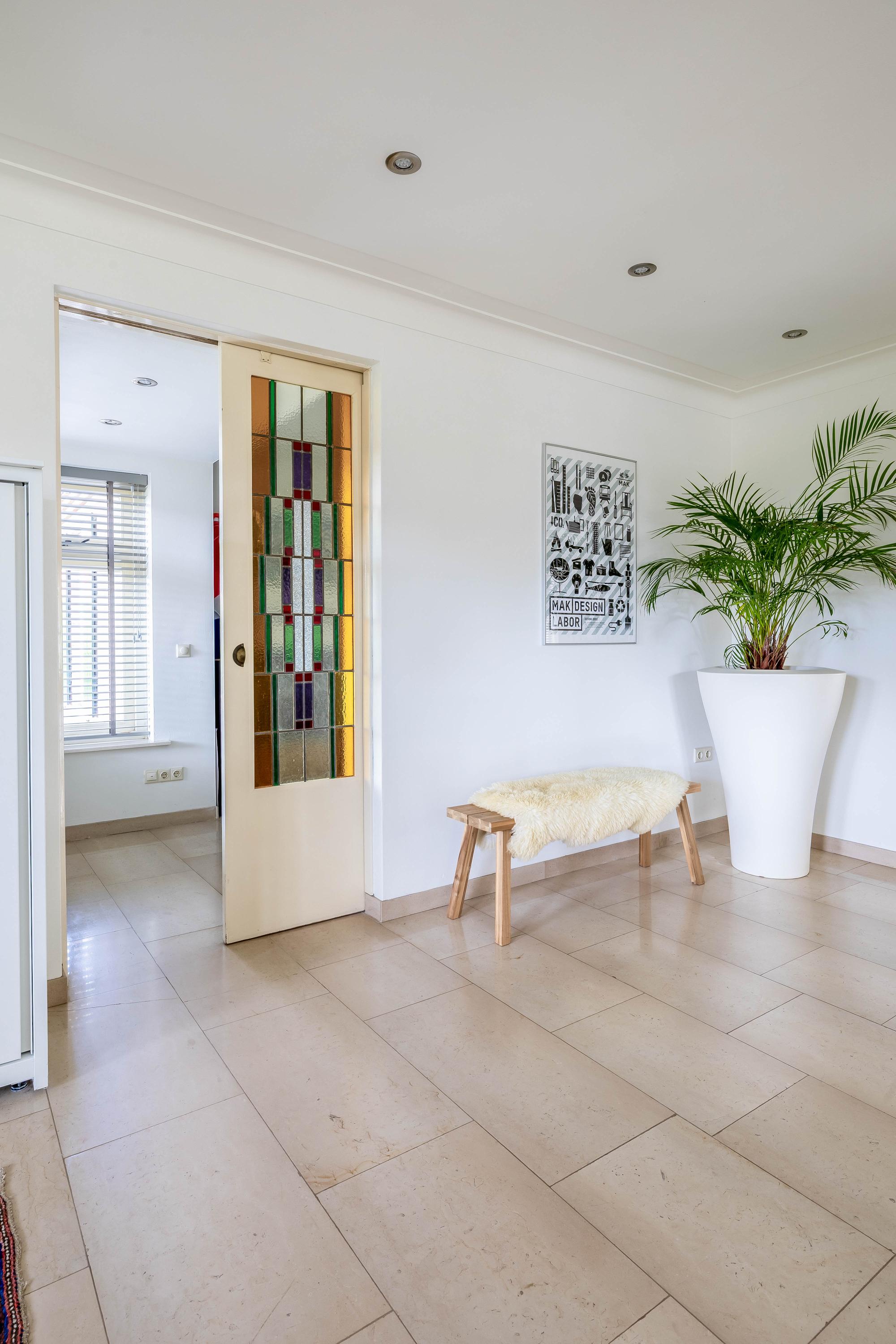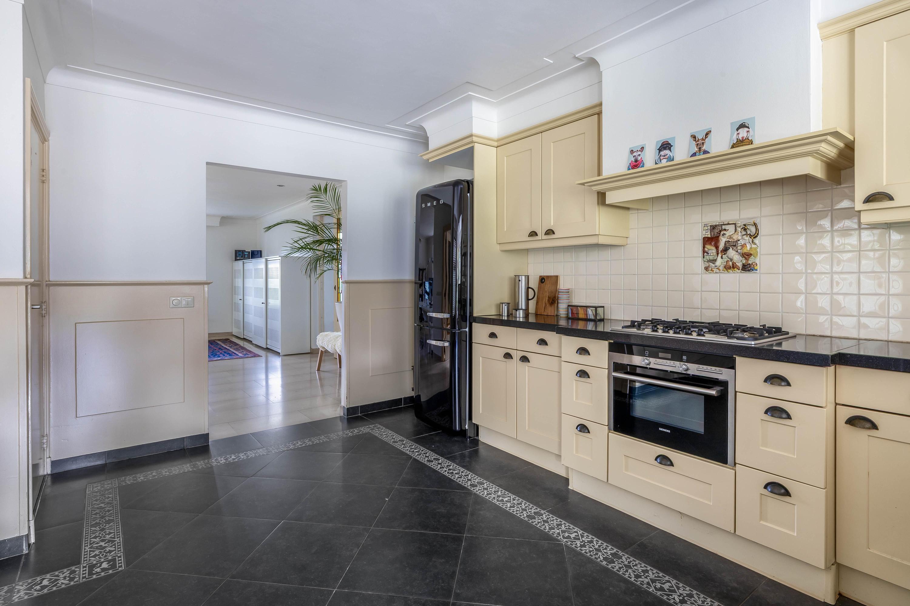 window provides access to the living room. The living room has a marble tiled floor with underfloor heating, stucco walls and a stucco ceiling with decorative mouldings. Thanks to the many windows and a large bay window, the room enjoys plenty of natural light, creating a spacious effect. Adjacent to the living room is a versatile space, ideal for an inspiring workspace or a cosy play area. The space can be closed off with a sliding door with stained glass. The kitchen has a corner layout and is equipped with a 5-burner gas hob, combination microwave/oven, sink, American fridge and dishwasher. Various base and wall cabinets provide storage space. There is enough space to place a dining table. The kitchen has a tiled floor with bis. The walls are partly finished with sleek stucco and partly with wooden panelling. The ceiling has stucco with decorative mouldings. The kitchen is open to the adjoining garden room. Here too, large windows provide a sea of light and a beautiful view of the surrounding garden. A wonderful place to relax! The walls are partly finished with sleek stucco and partly with wooden panelling. The ceiling is also finished with stucco and decorative mouldings. French doors provide access to the garden. There is also access to the utility room from here. The utility room is a practical space, equipped with a sink, a storage cupboard and a fixed cupboard wall with sliding doors. There is also a toilet. A door provides access to the garden. You can also reach the rear of the house from this room.