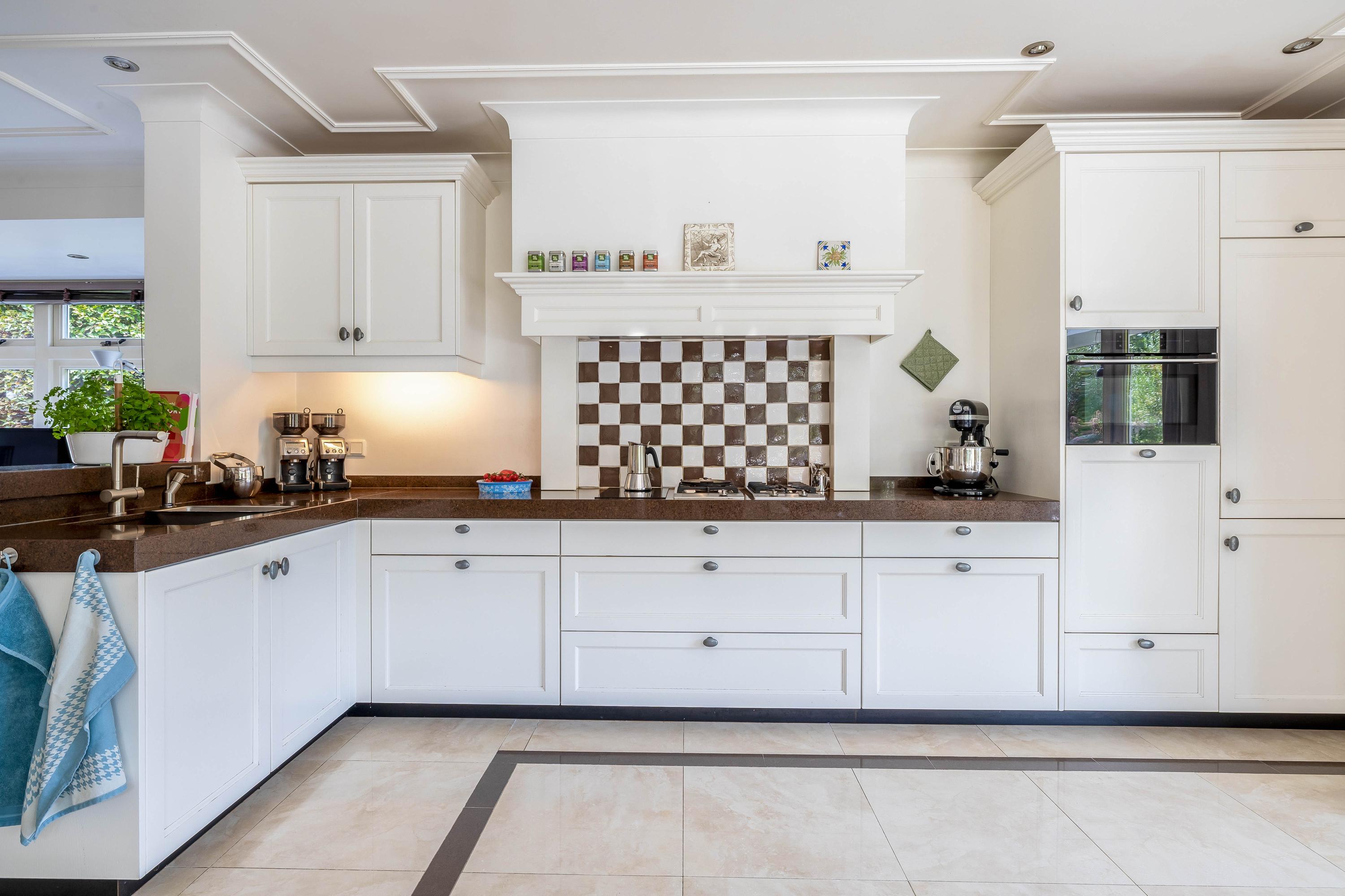 The toilet is fully tiled and equipped with a washbasin and wall-mounted toilet. The attractive living room is accentuated by high-quality ceramic tile flooring with bis and stucco, both on the walls and on the ceiling. The beautiful mouldings give the interior a classic look. The marble fireplace with gas fire provides extra warmth and atmosphere on colder days. A spacious bay window, currently furnished as a workspace, provides extra light in the room. The custom-made kitchen was designed by Hans Kwinten Interiors Projects. This high-quality kitchen is L-shaped and fully equipped with an advanced hob (with a wok burner, two gas burners and two induction burners) and a combi oven that also serves as a steam oven and microwave. In addition, you will find a dishwasher, freezer, refrigerator and a Quooker boiling water tap. French doors and various windows provide a beautiful view of the garden and direct access to the covered terrace and garden. The kitchen provides access to a spacious, man-sized storage cellar. The bedroom with en-suite bathroom and walk-in wardrobe is a delightful space. The floor is finished with laminate. The bathroom is fully tiled and equipped with a Whirlpool bathtub with light therapy, a double sink with a cabinet, a floating toilet and a walk-in shower with a seat. Various niches are an extra nice detail in the room. There is also underfloor heating in the bathroom. The walk-in closet with fixed cupboards and lighting offers optimal clothing storage. From the
