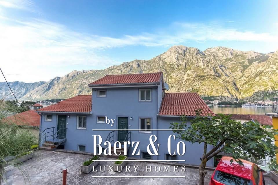 Level 1: living room with a dining table, separated kitchen, 2 bedrooms, a bathroom and 2 terraces. The big terrace has a direct view of the sea and the Kotor Old Town.