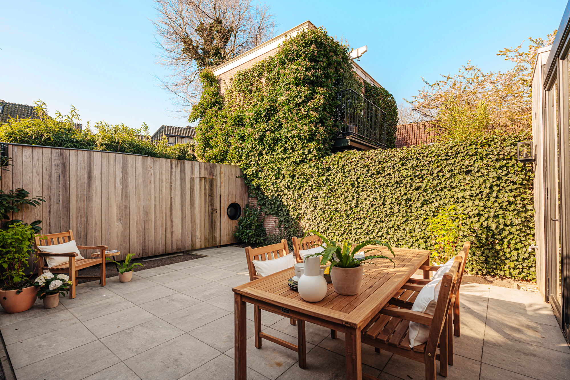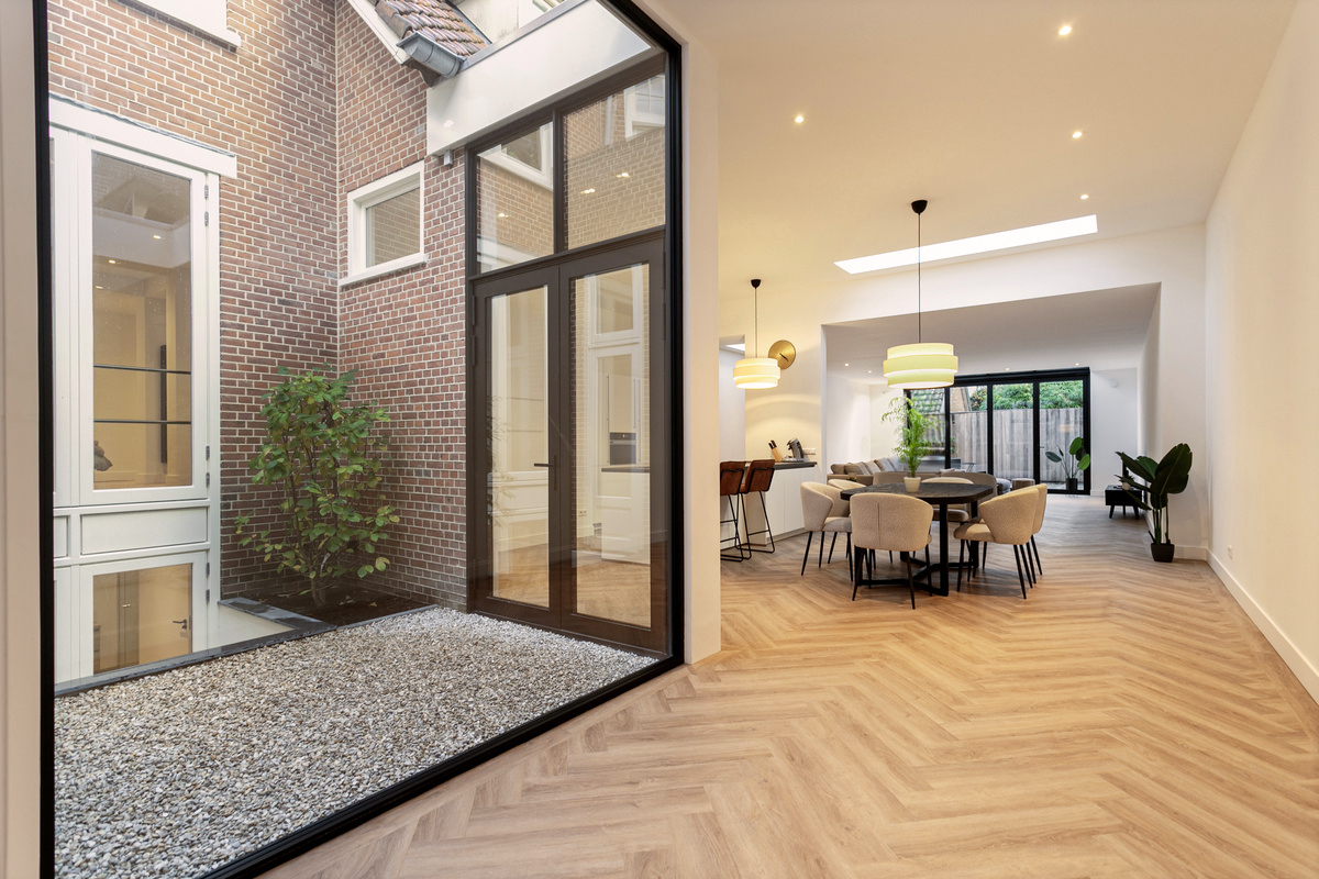 En dan is er nog de buitenruimte: een zonnige tuin van ca. 40 m², ideaal voor ontbijt in de ochtendzon of een ontspannen diner in de avond. Bovendien is er een intieme patio – de perfecte plek voor een bijzonder kunstwerk, prachtig uitgelicht dankzij de aanwezige elektra.