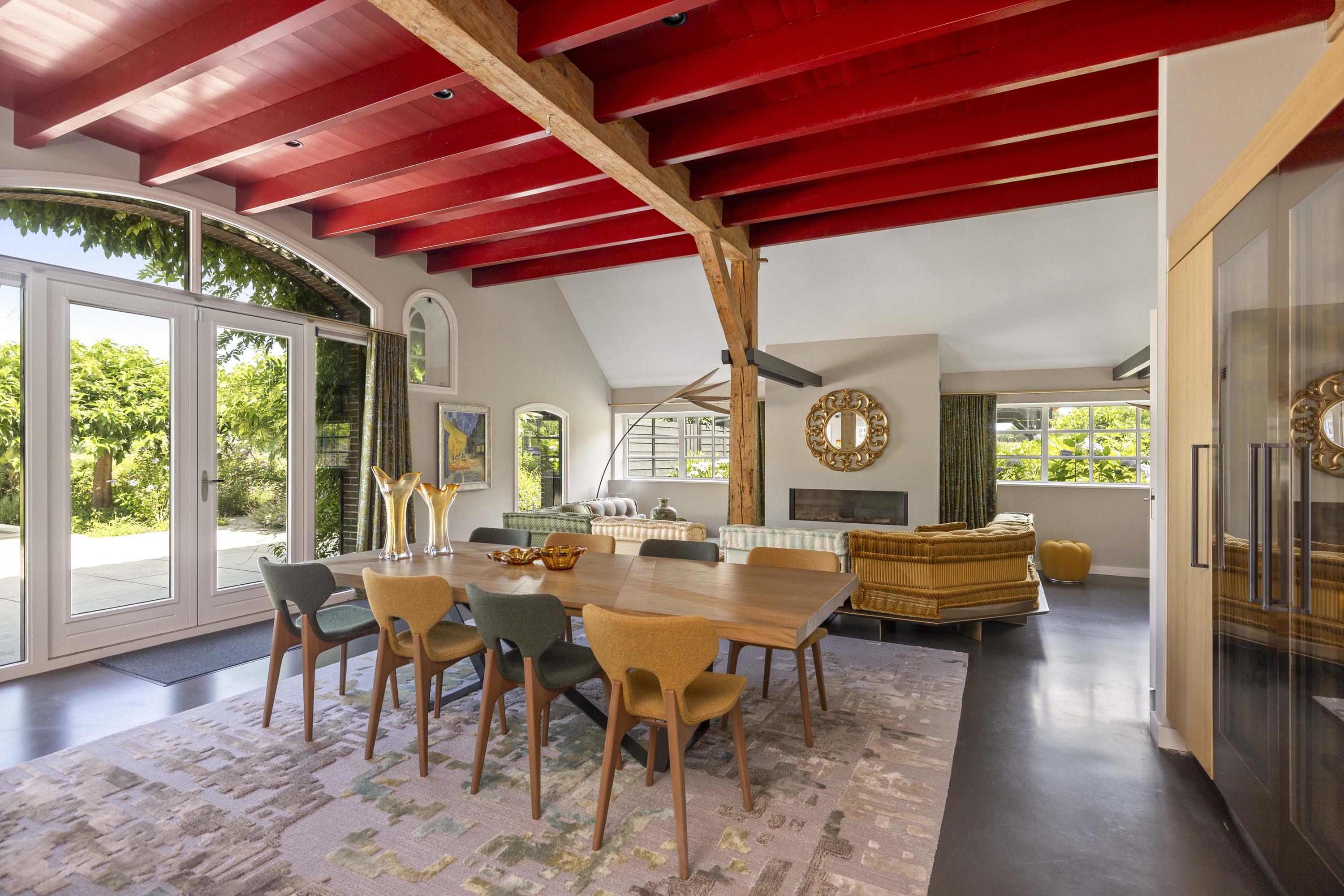 The kitchen-diner, located in the former barn, spans over 70 m² and, with the barn doors now filled with glass, offers a spectacular view of the garden.
