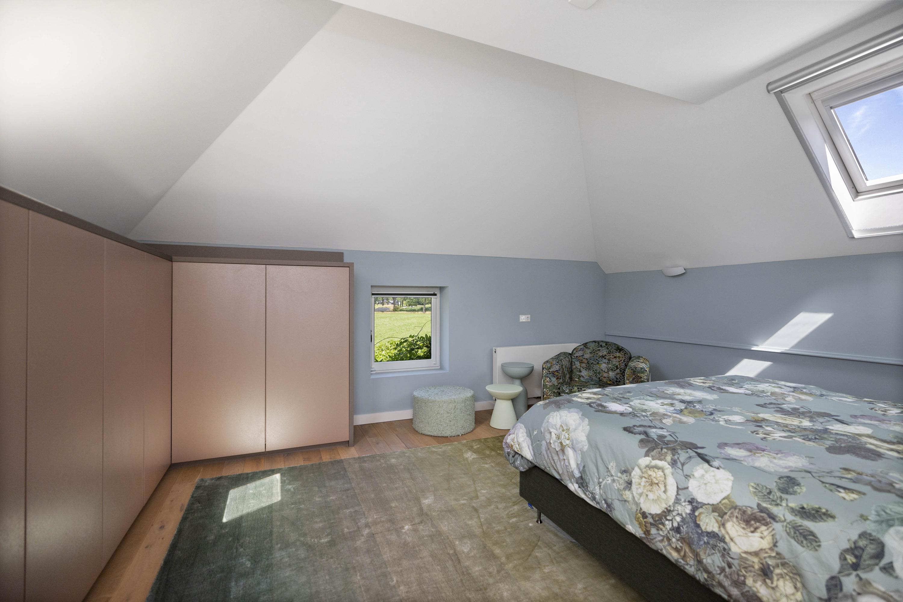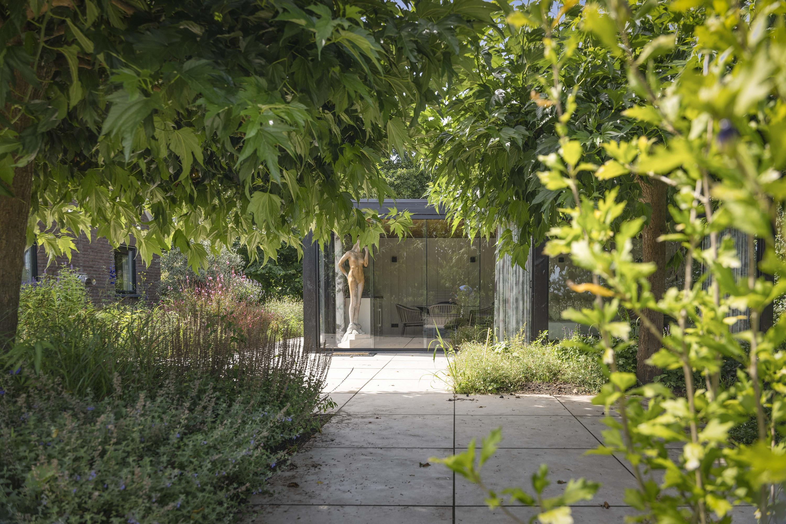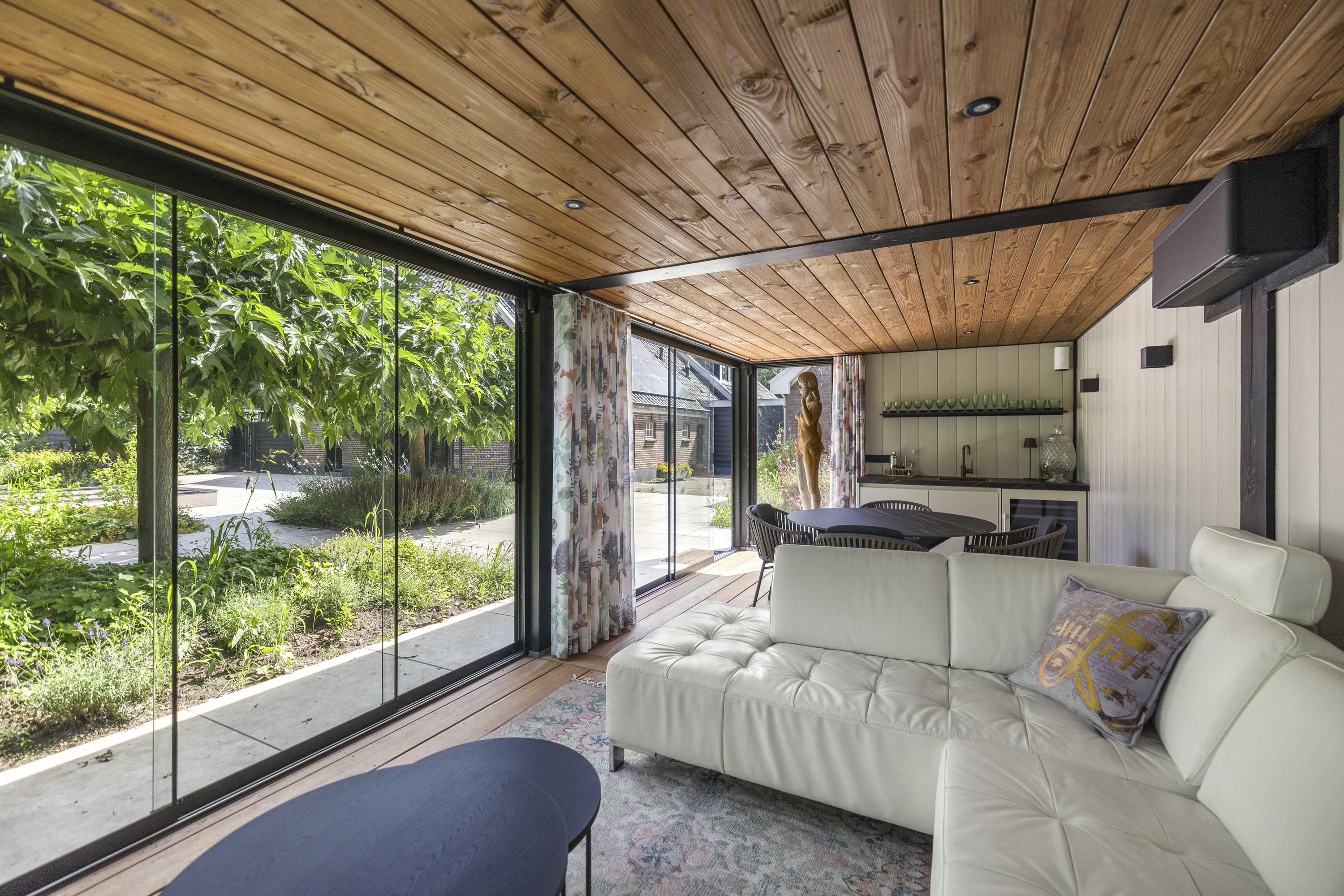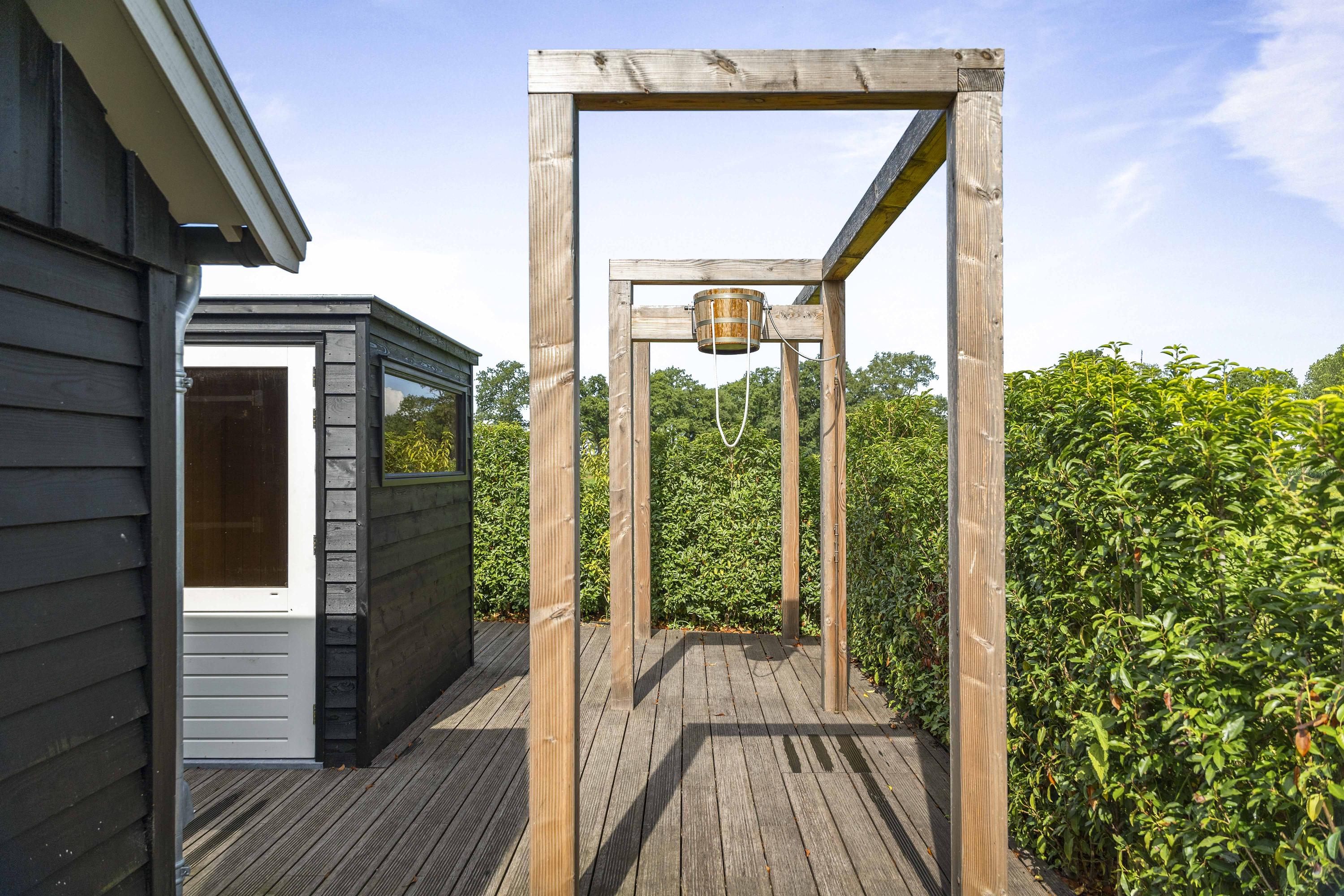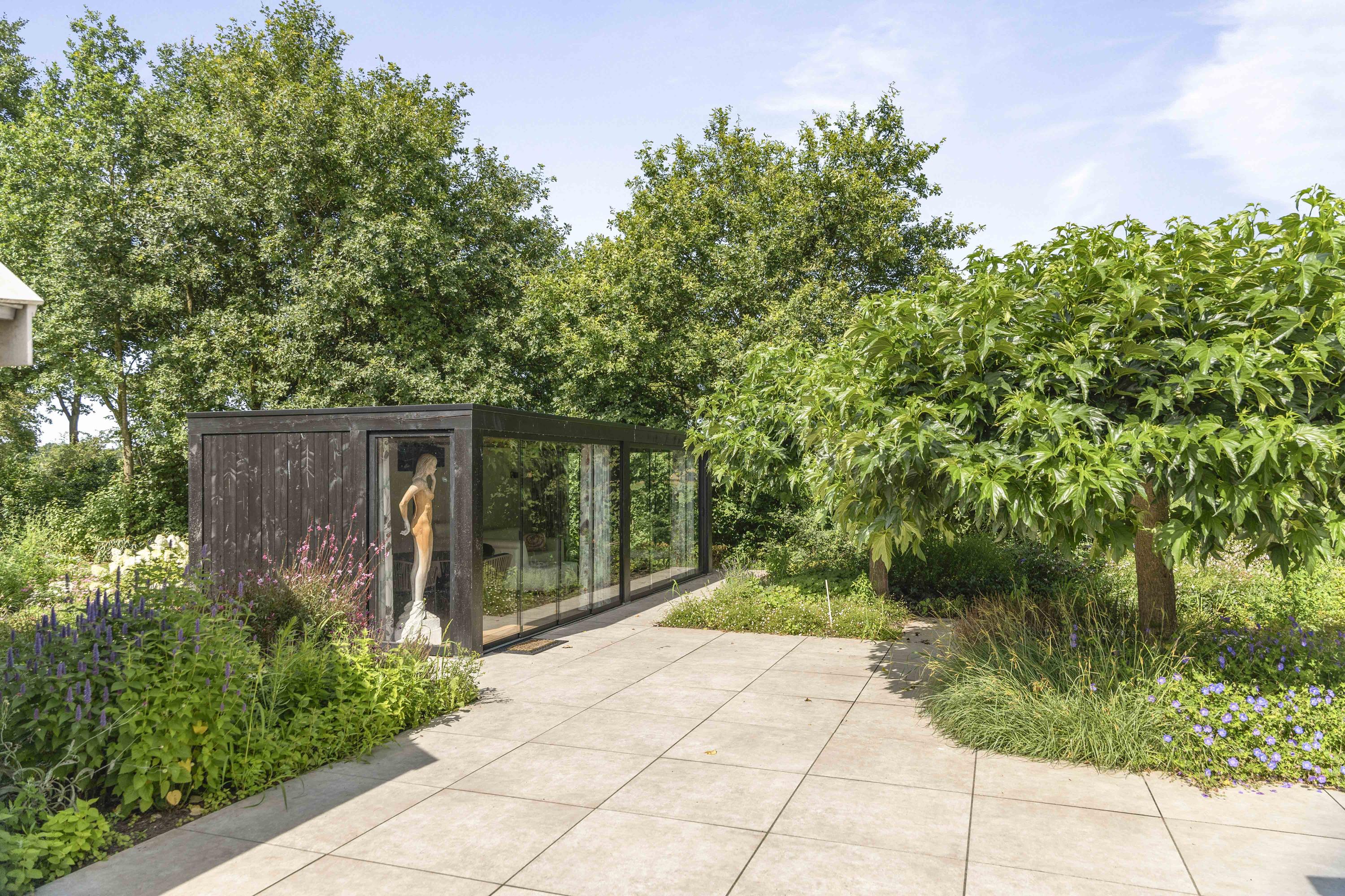 Around the house a wonderful terrace has been laid out, offering space for long tables and convivial summer evenings. Cosy seating areas are scattered throughout the garden. The elegant pond with sculpted friezes forms a striking focal point. Further into the garden are the sauna with outdoor shower (hot/cold water) and tipping bucket, and the stylish garden room with pantry, fridge and wine cooler, offering year-round comfort whether open or enclosed.