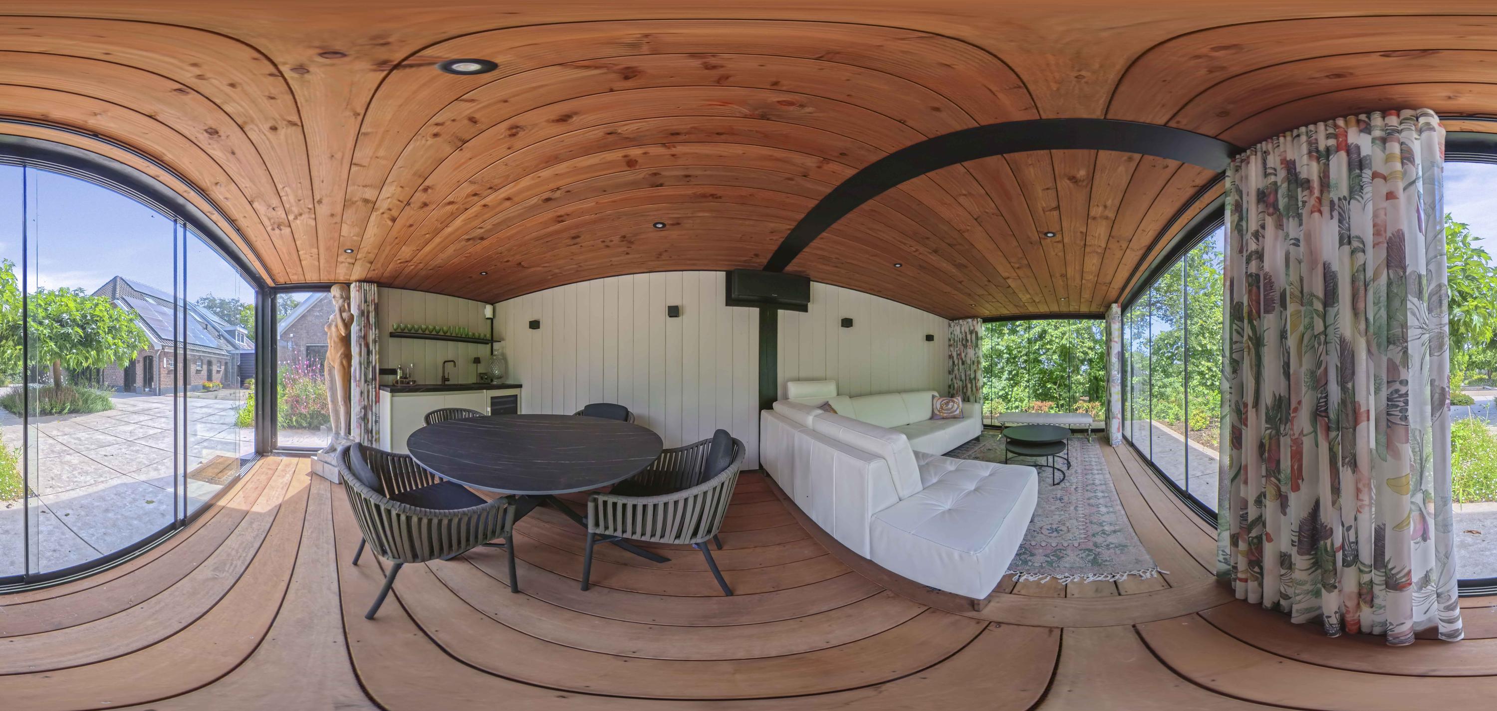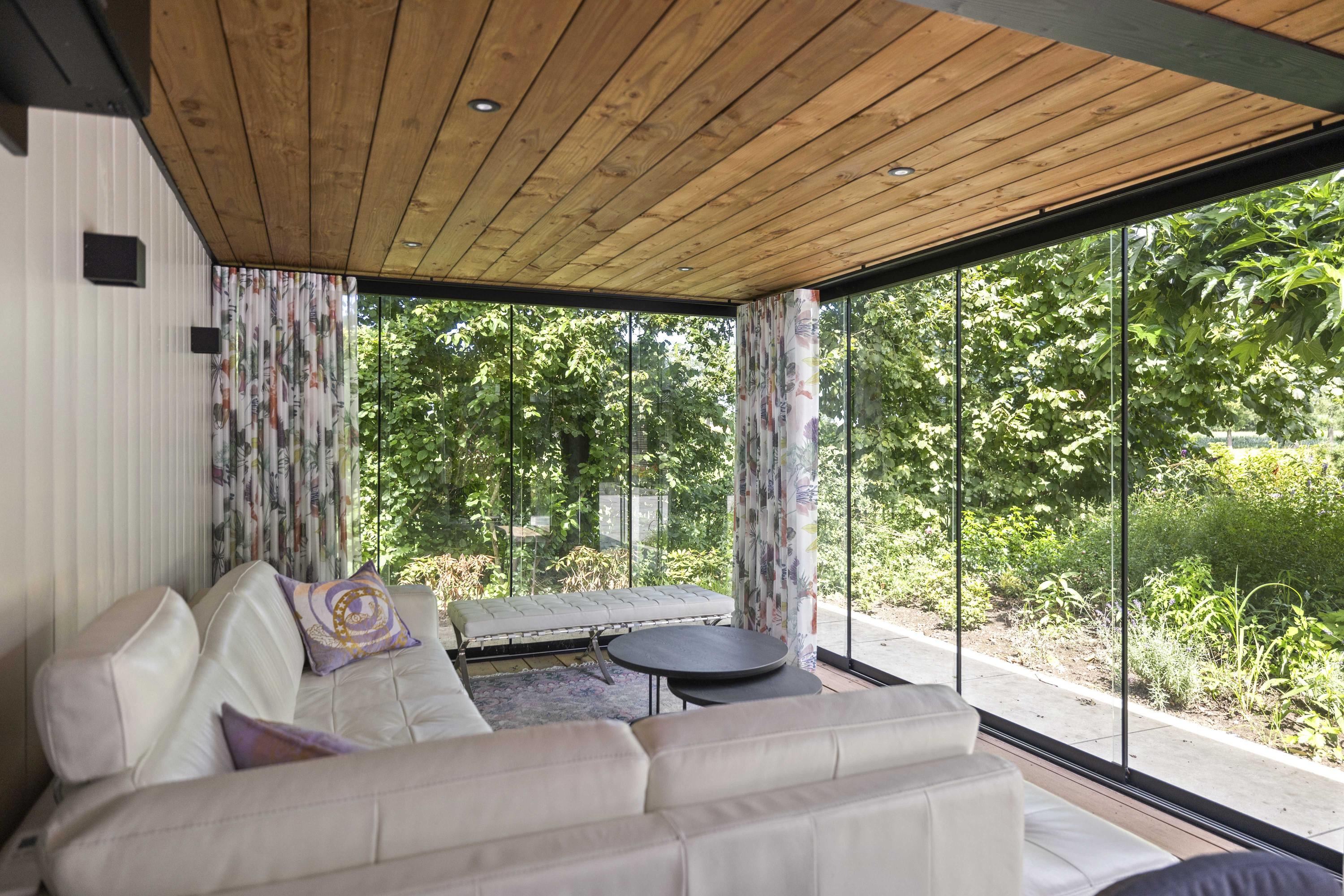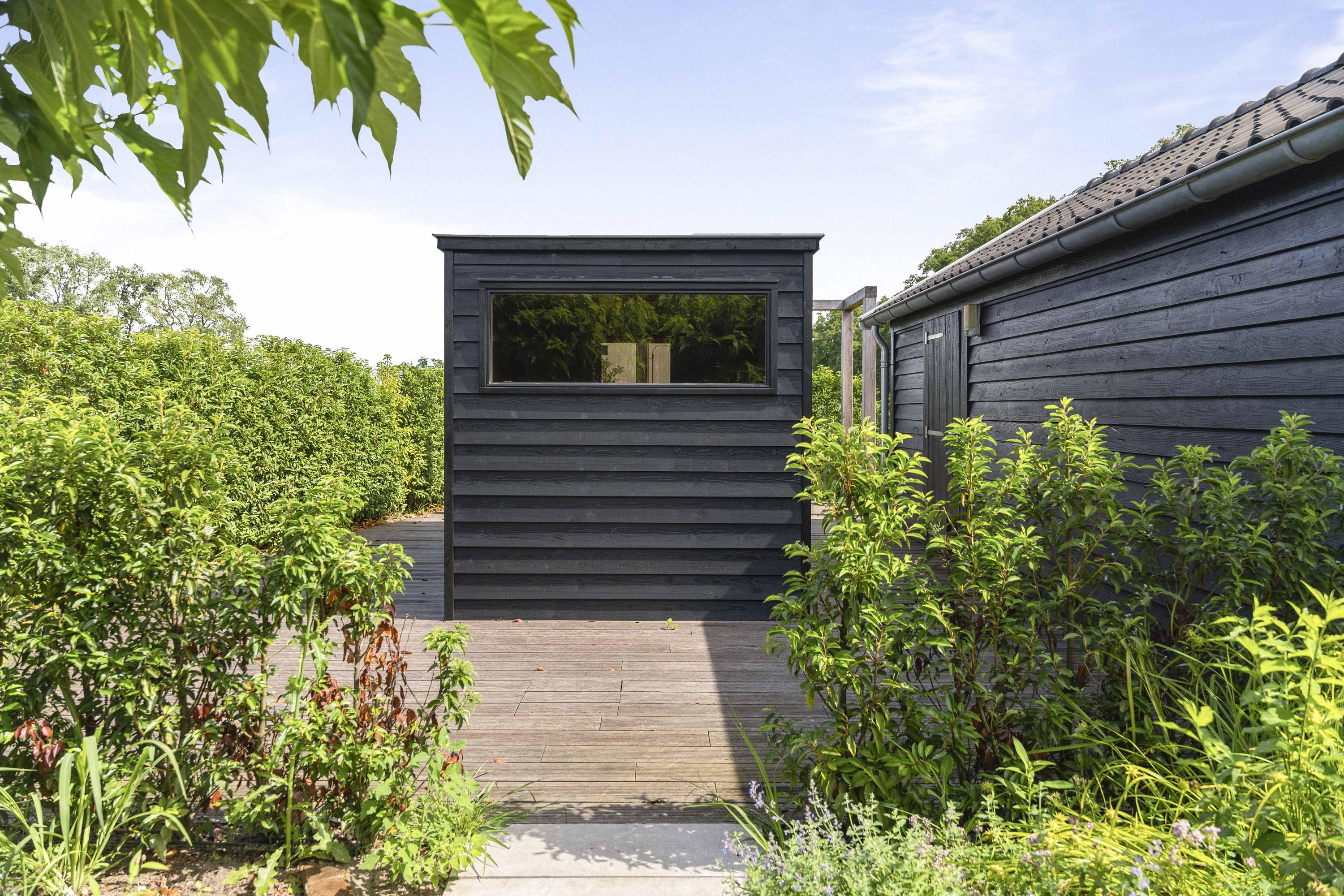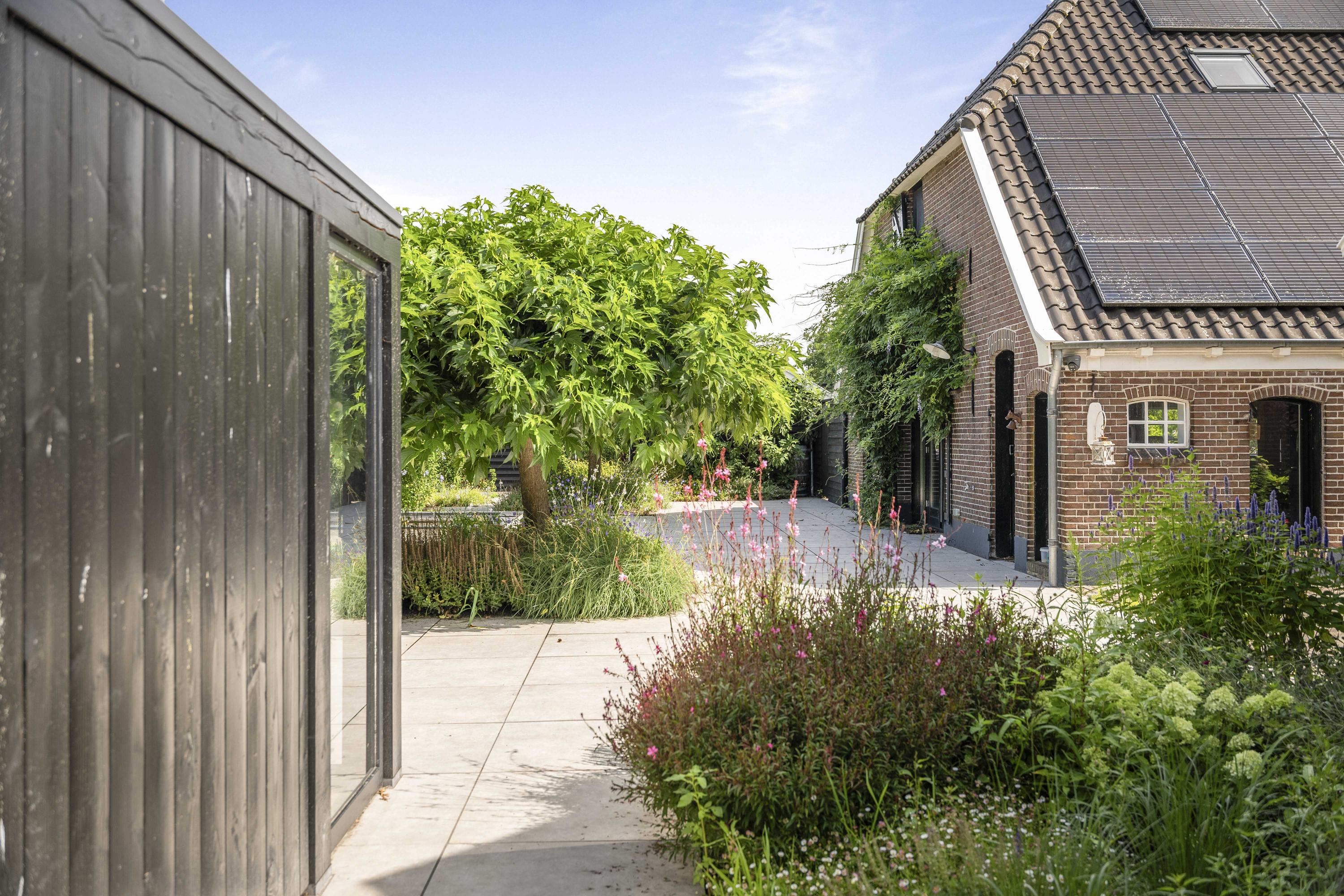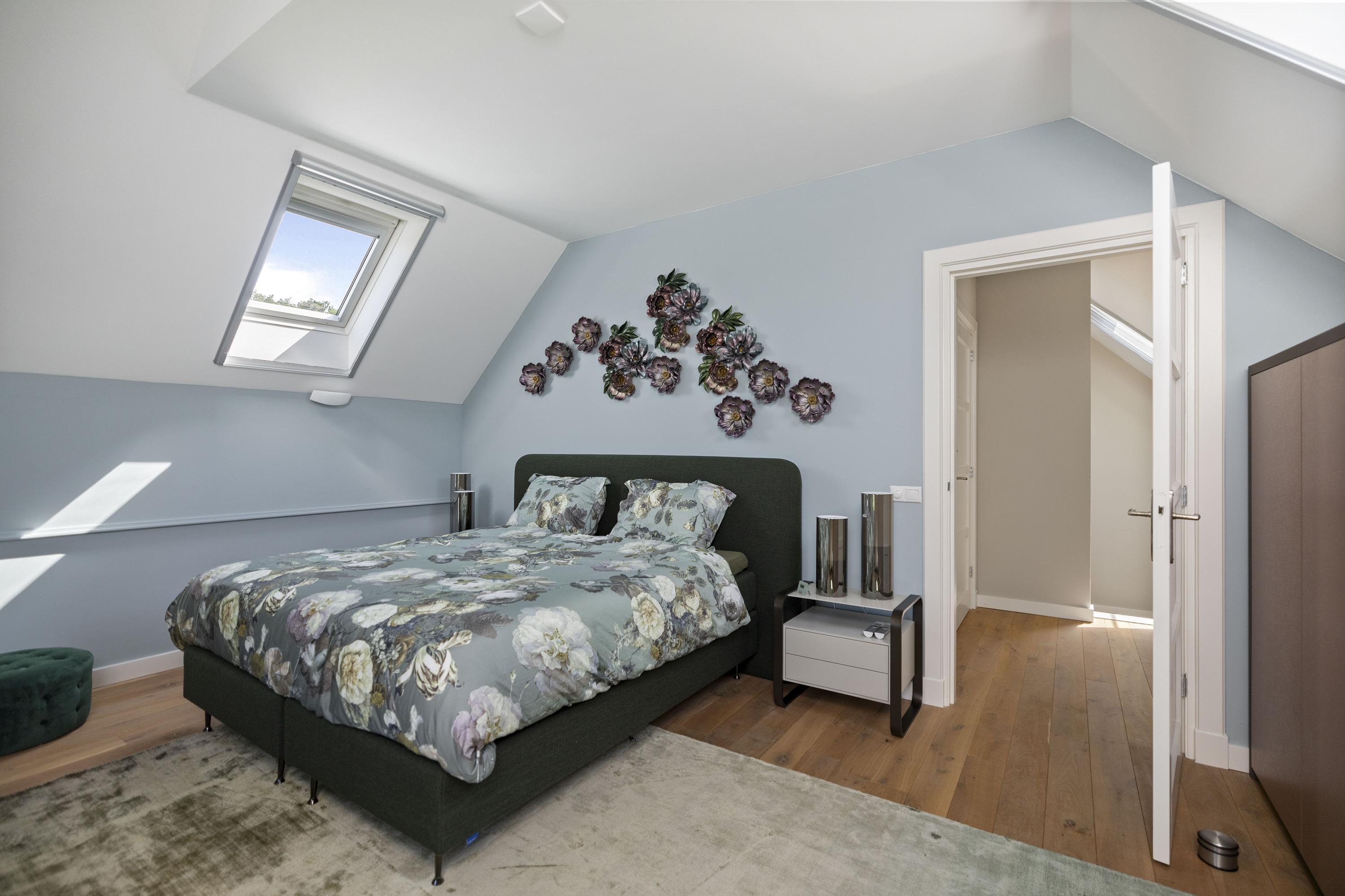 Around the house a wonderful terrace has been laid out, offering space for long tables and convivial summer evenings. Cosy seating areas are scattered throughout the garden. The elegant pond with sculpted friezes forms a striking focal point. Further into the garden are the sauna with outdoor shower (hot/cold water) and tipping bucket, and the stylish garden room with pantry, fridge and wine cooler, offering year-round comfort whether open or enclosed.