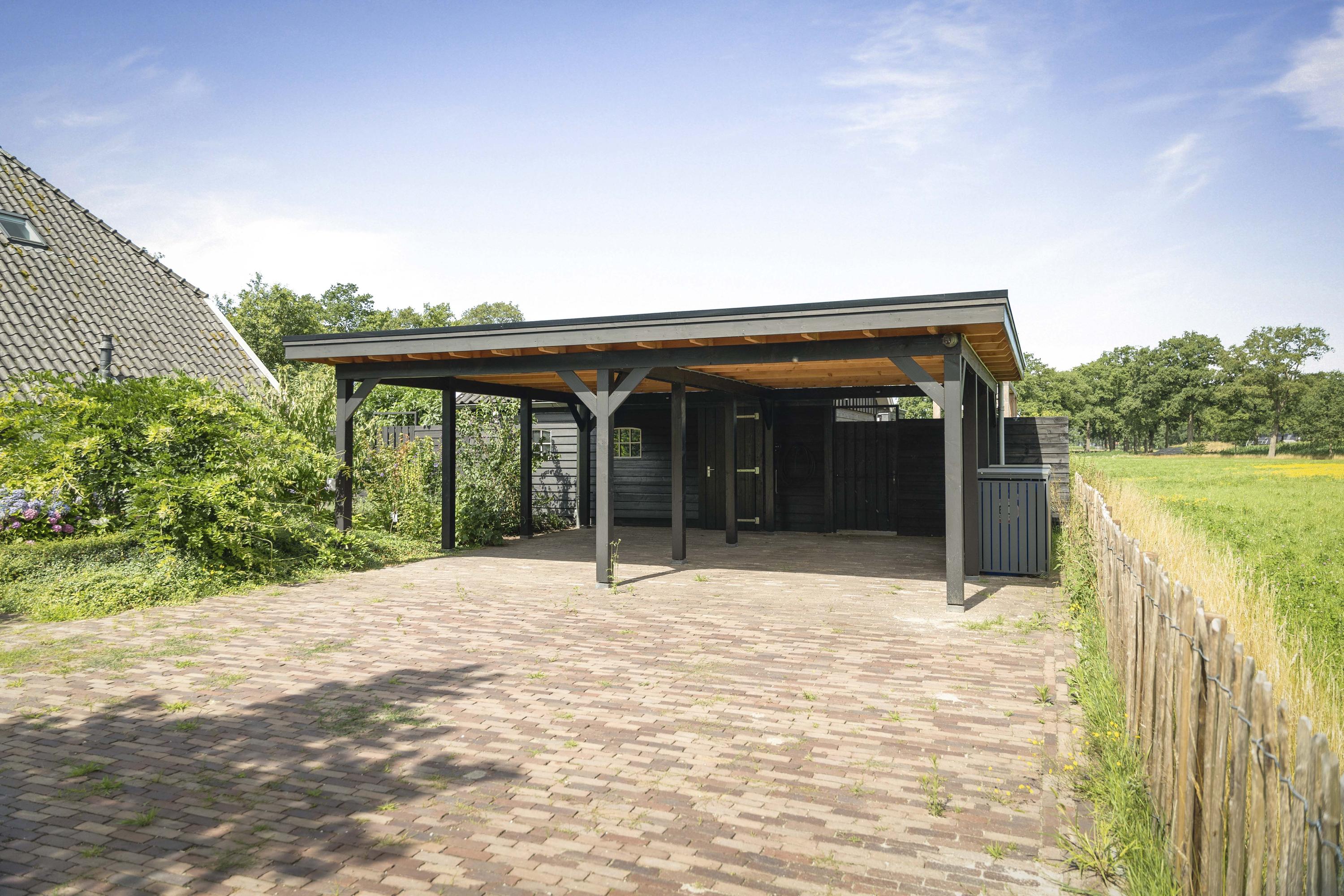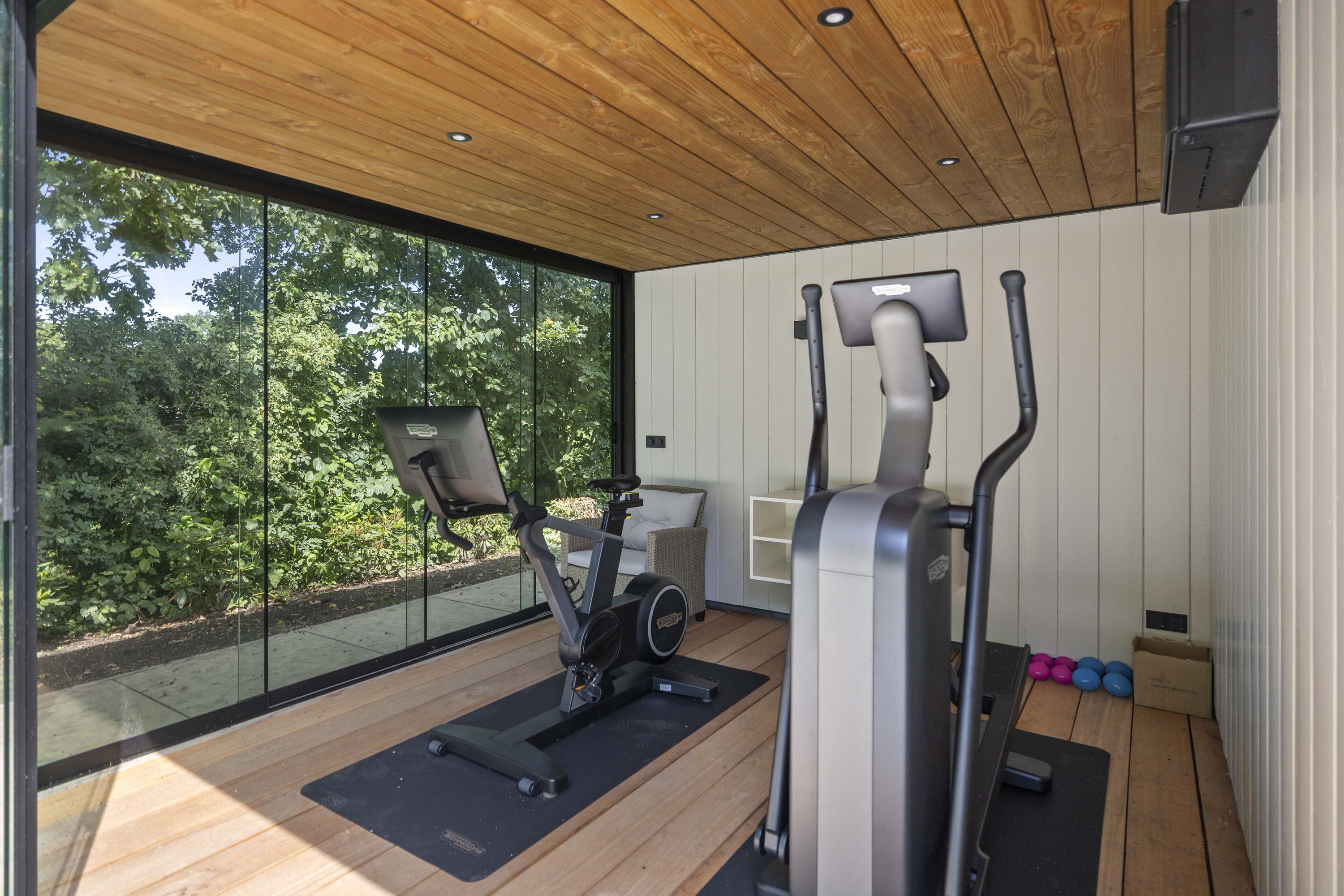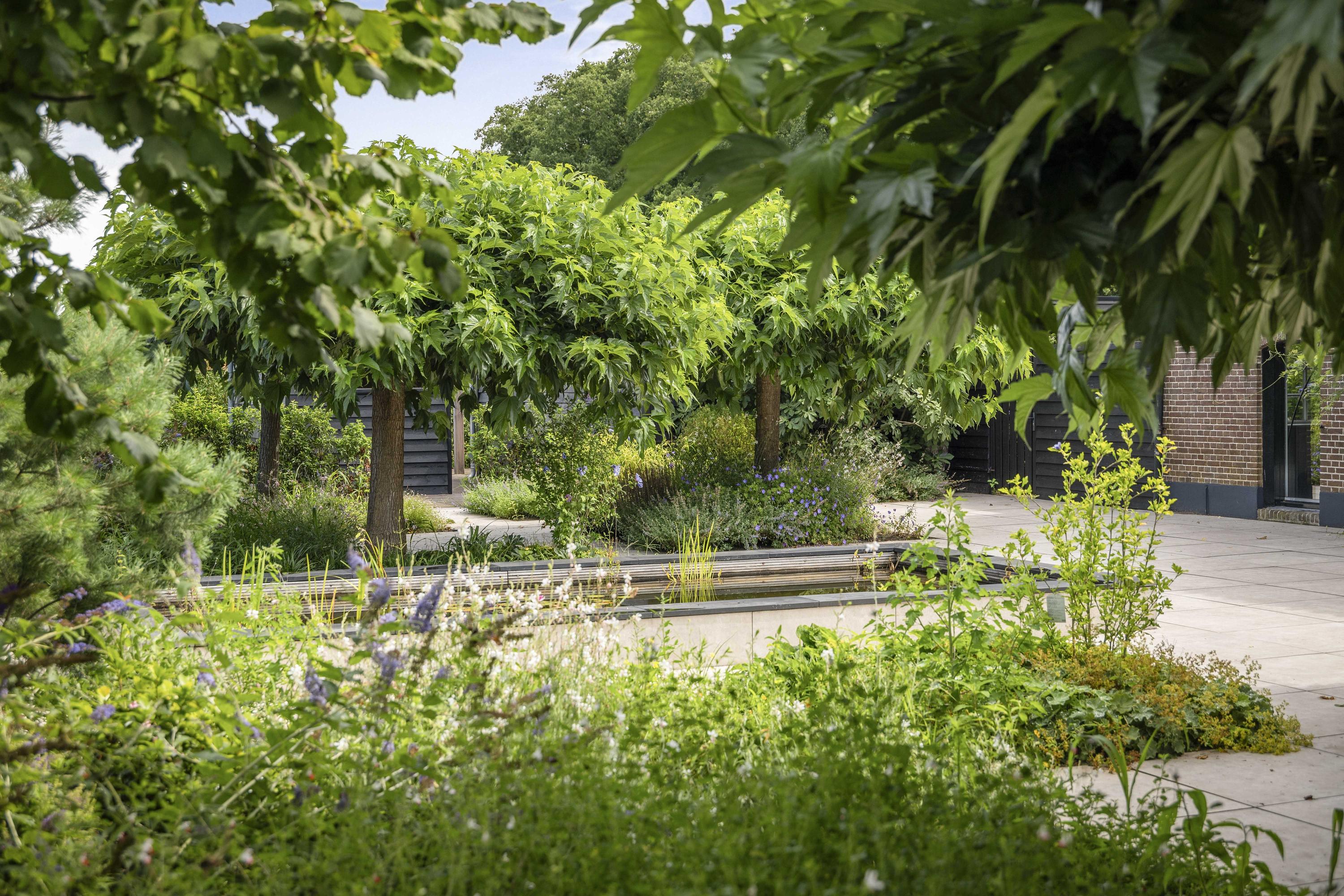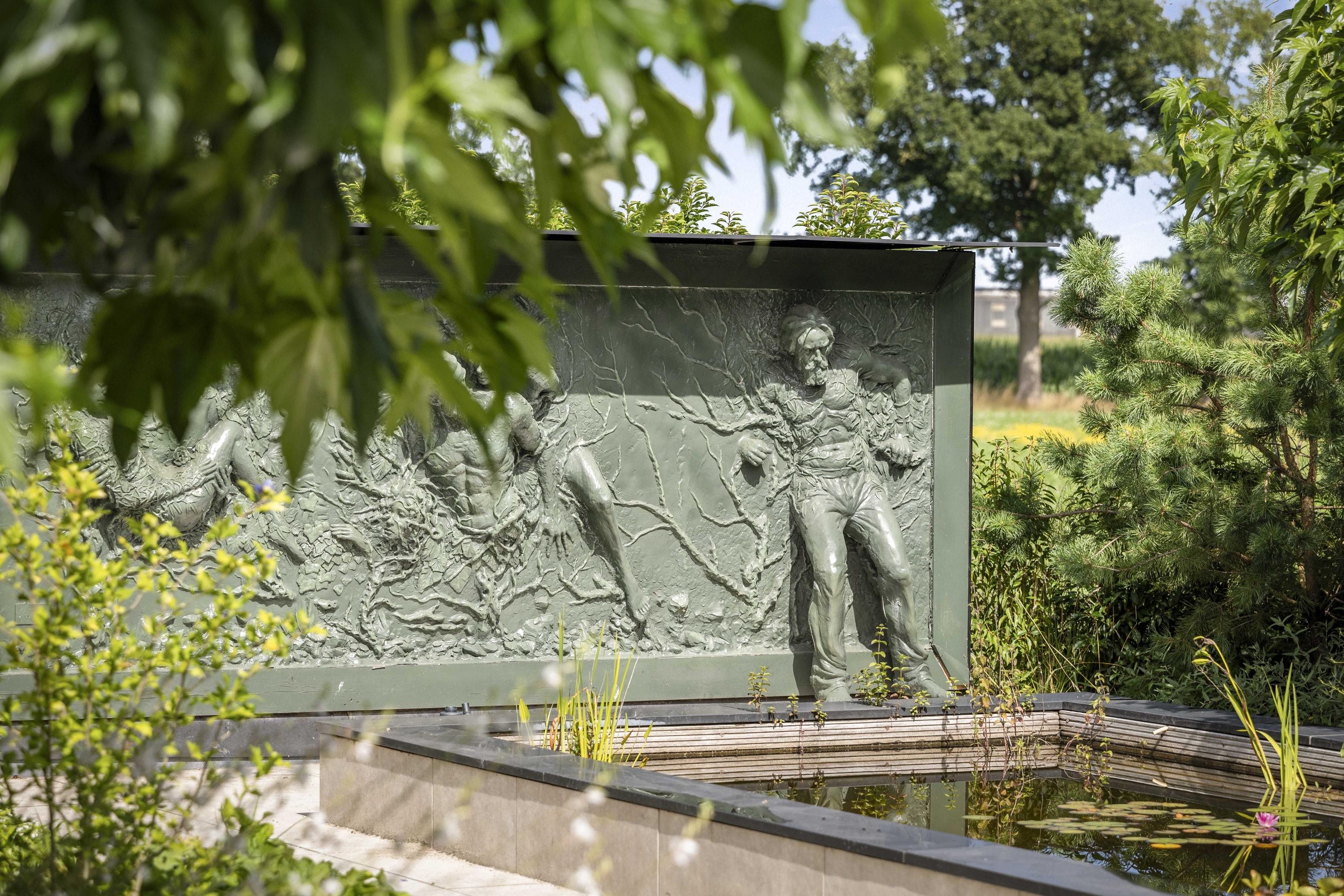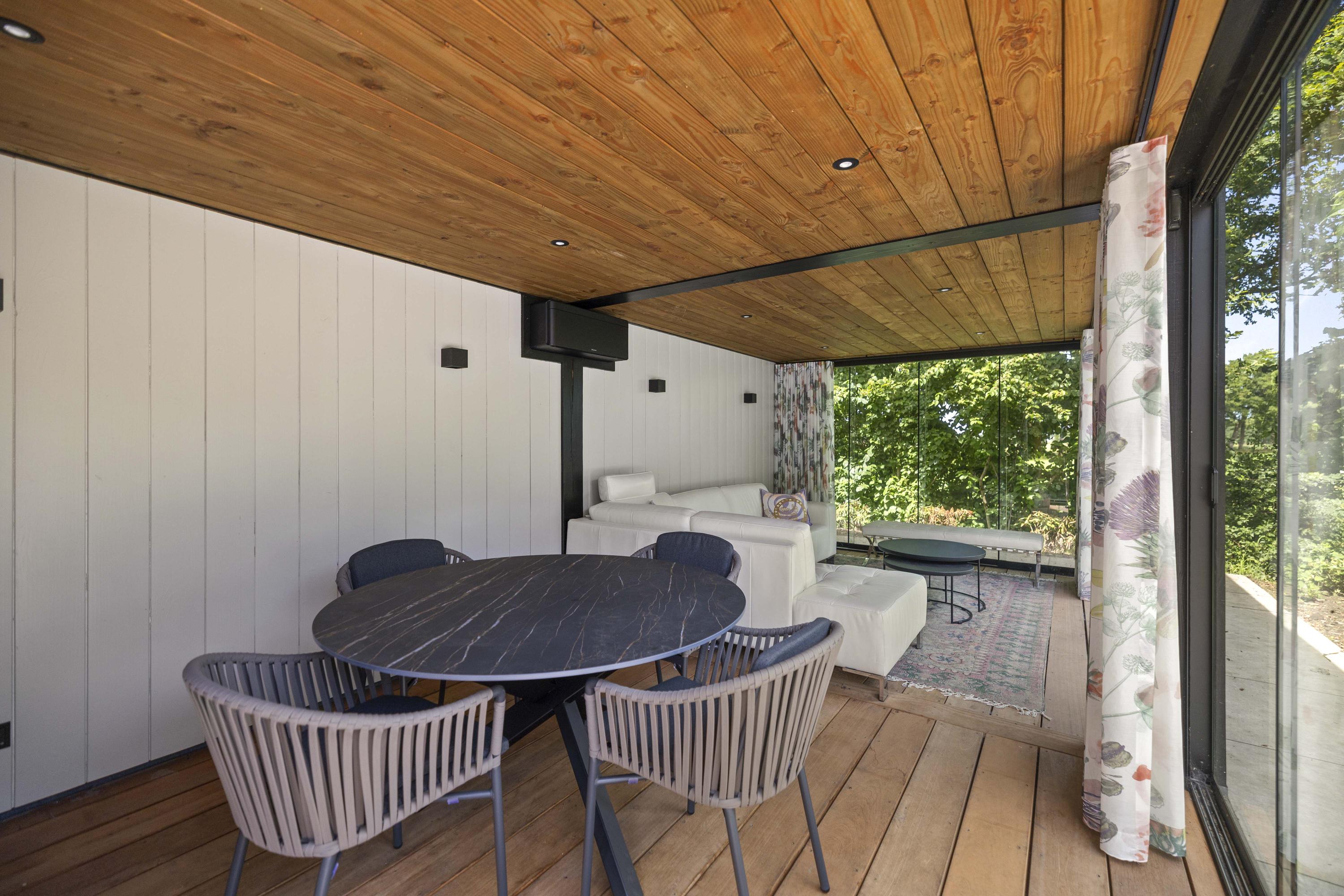 Around the house a wonderful terrace has been laid out, offering space for long tables and convivial summer evenings. Cosy seating areas are scattered throughout the garden. The elegant pond with sculpted friezes forms a striking focal point. Further into the garden are the sauna with outdoor shower (hot/cold water) and tipping bucket, and the stylish garden room with pantry, fridge and wine cooler, offering year-round comfort whether open or enclosed.