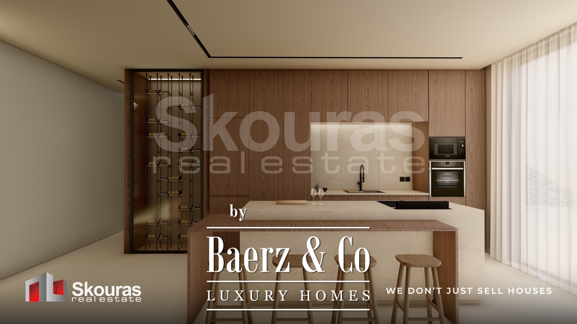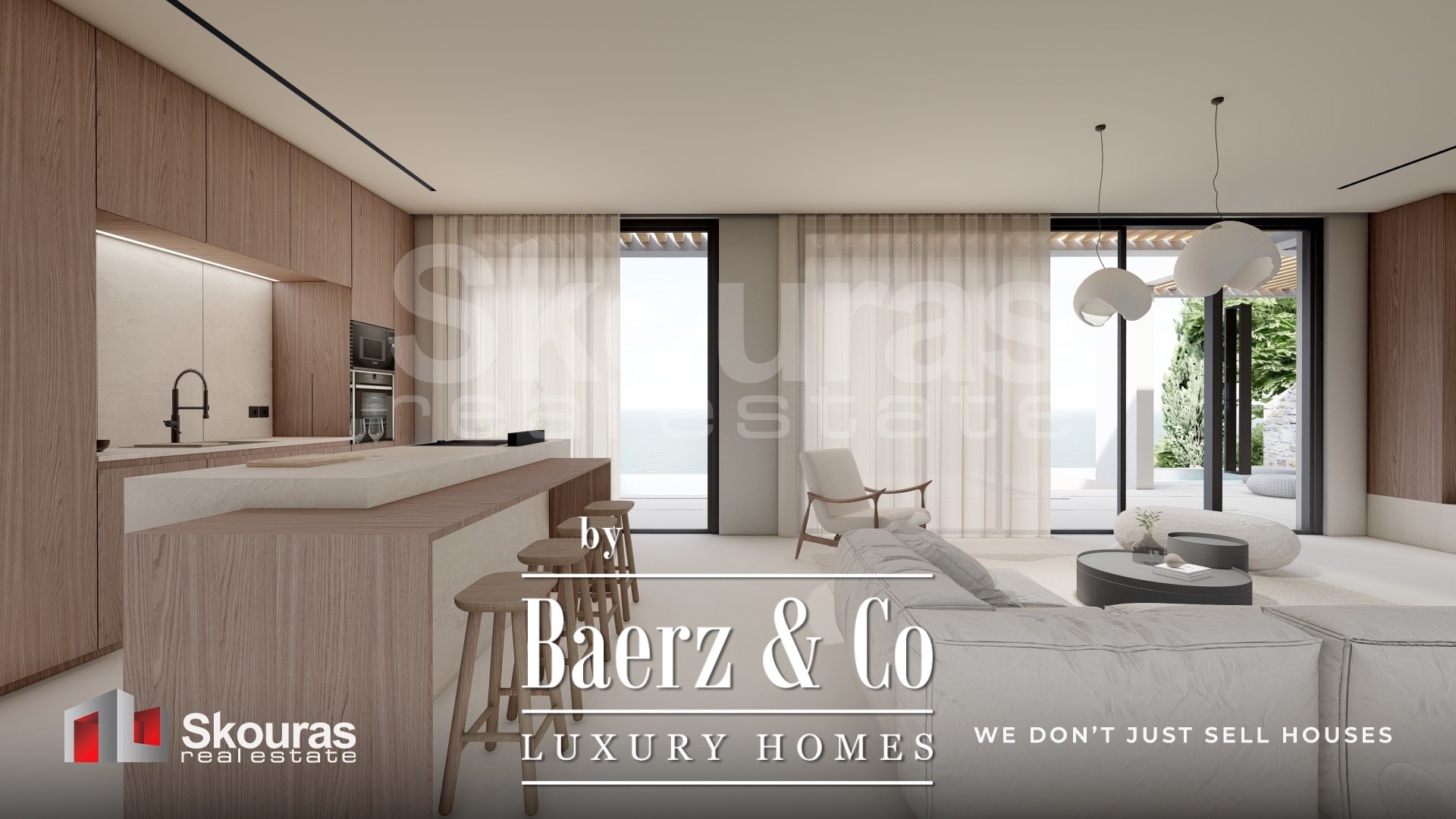 The villa features three generously proportioned bedrooms, each with its own en-suite bathroom and walk-in closet, ensuring both autonomy and refinement for residents and guests. Expansive glazing defines the open-plan living area, drawing in sea views and natural light, while the modern kitchen and dedicated wine cellar create a setting attuned to quiet luxury. Smart home technology elevates the experience of daily living.
