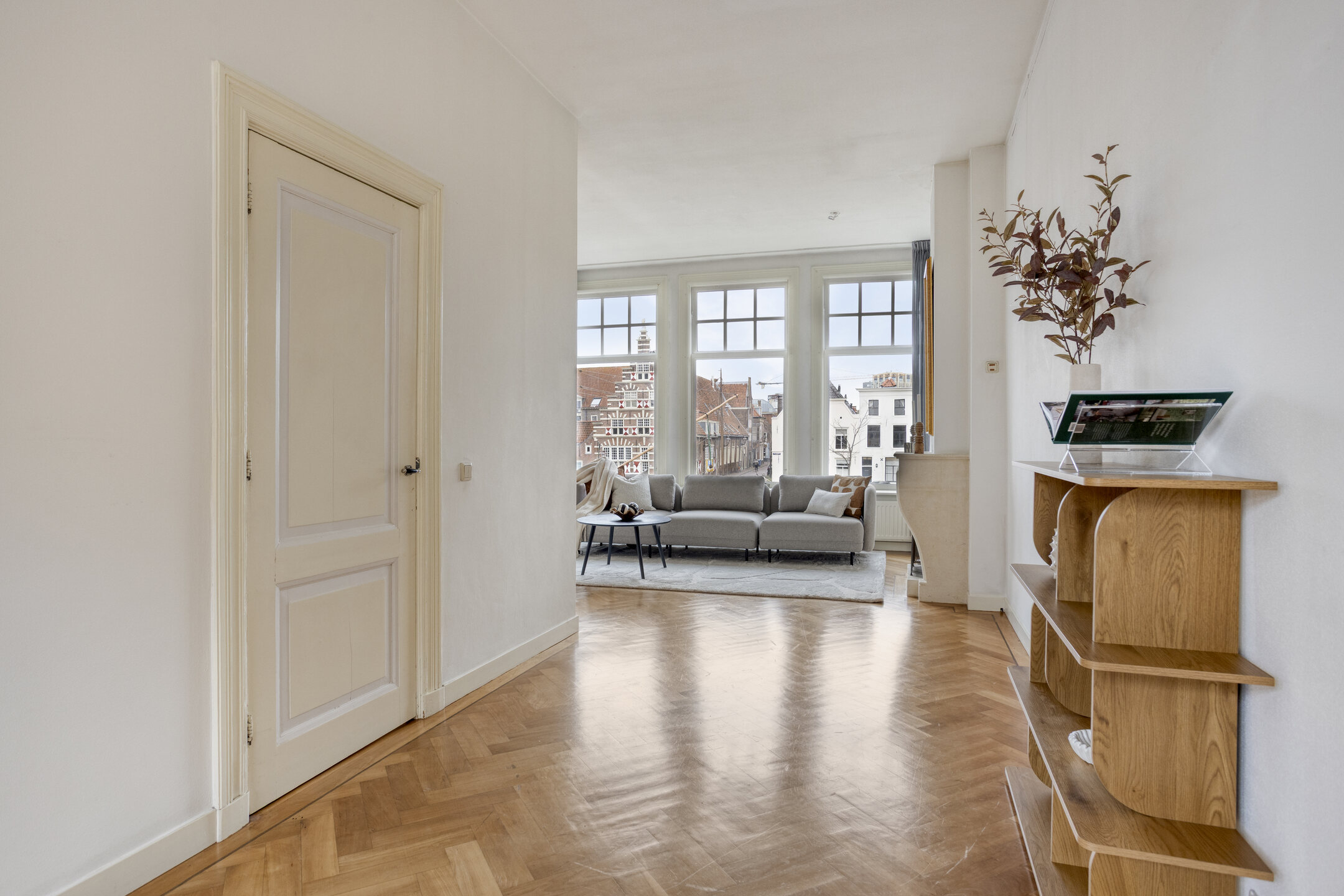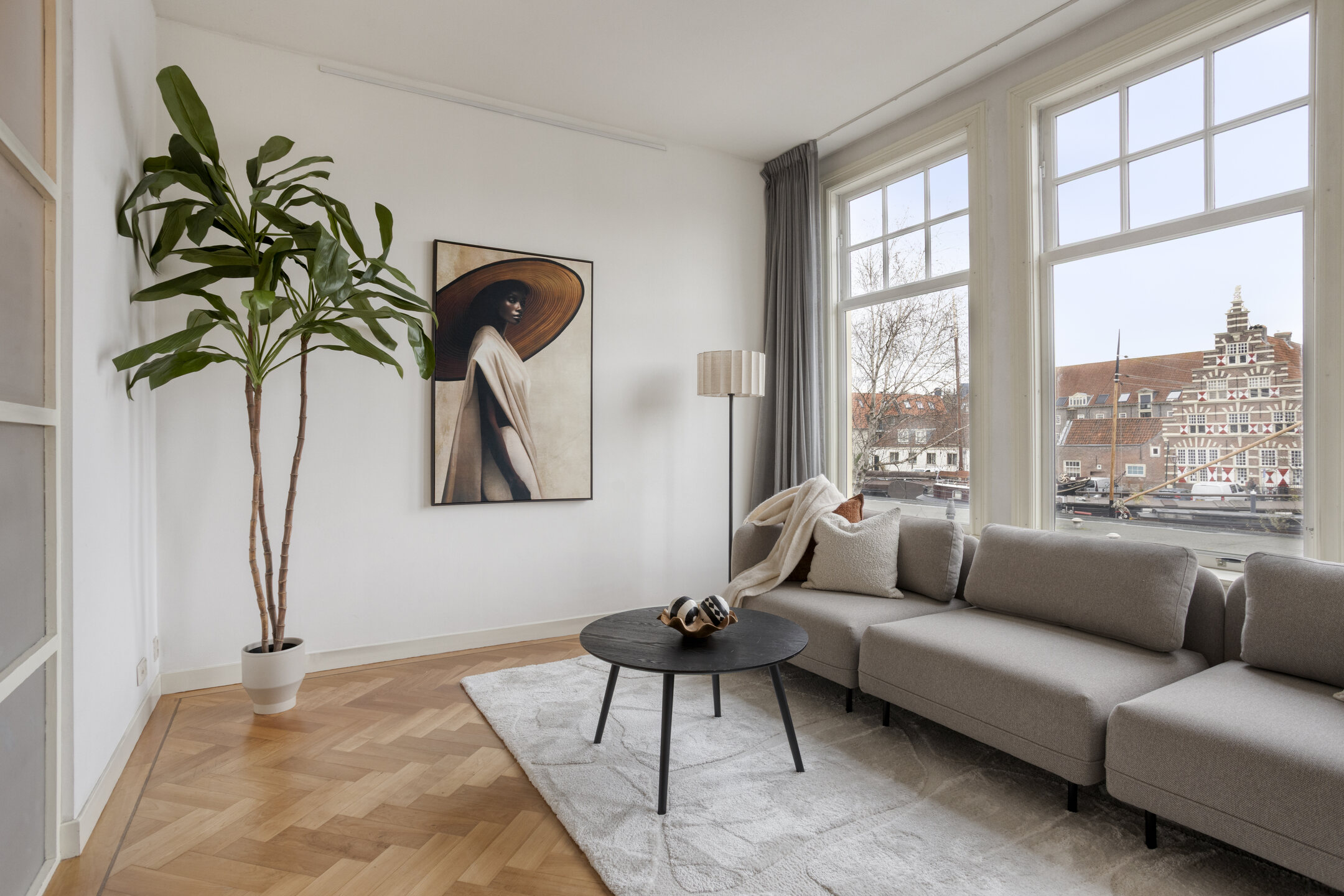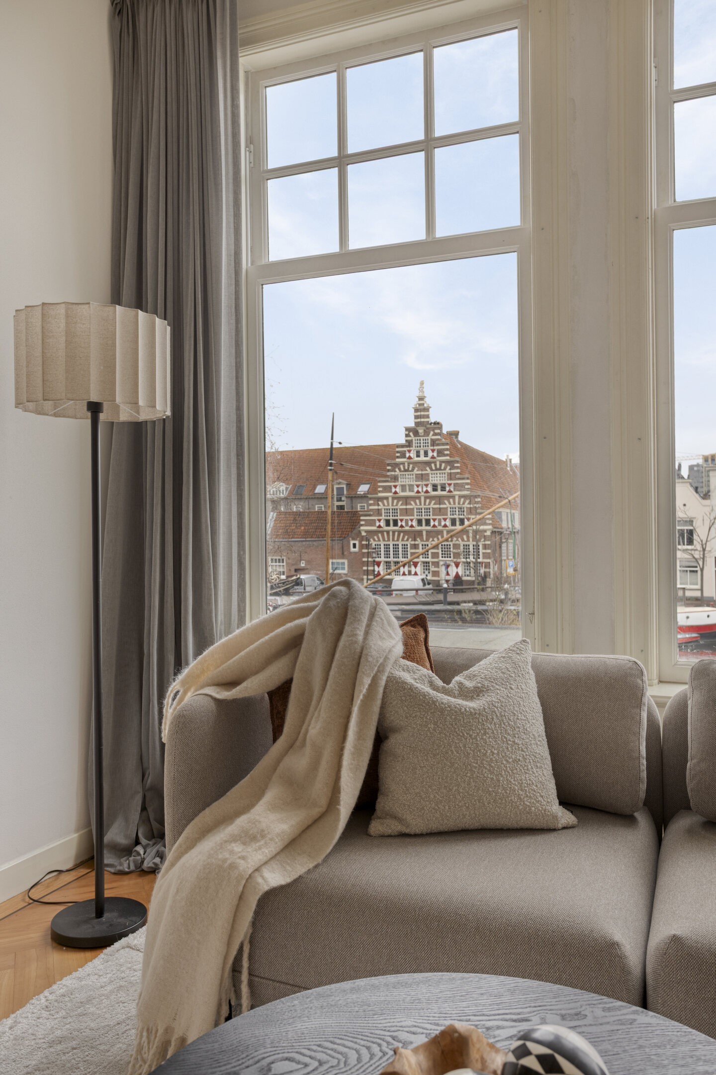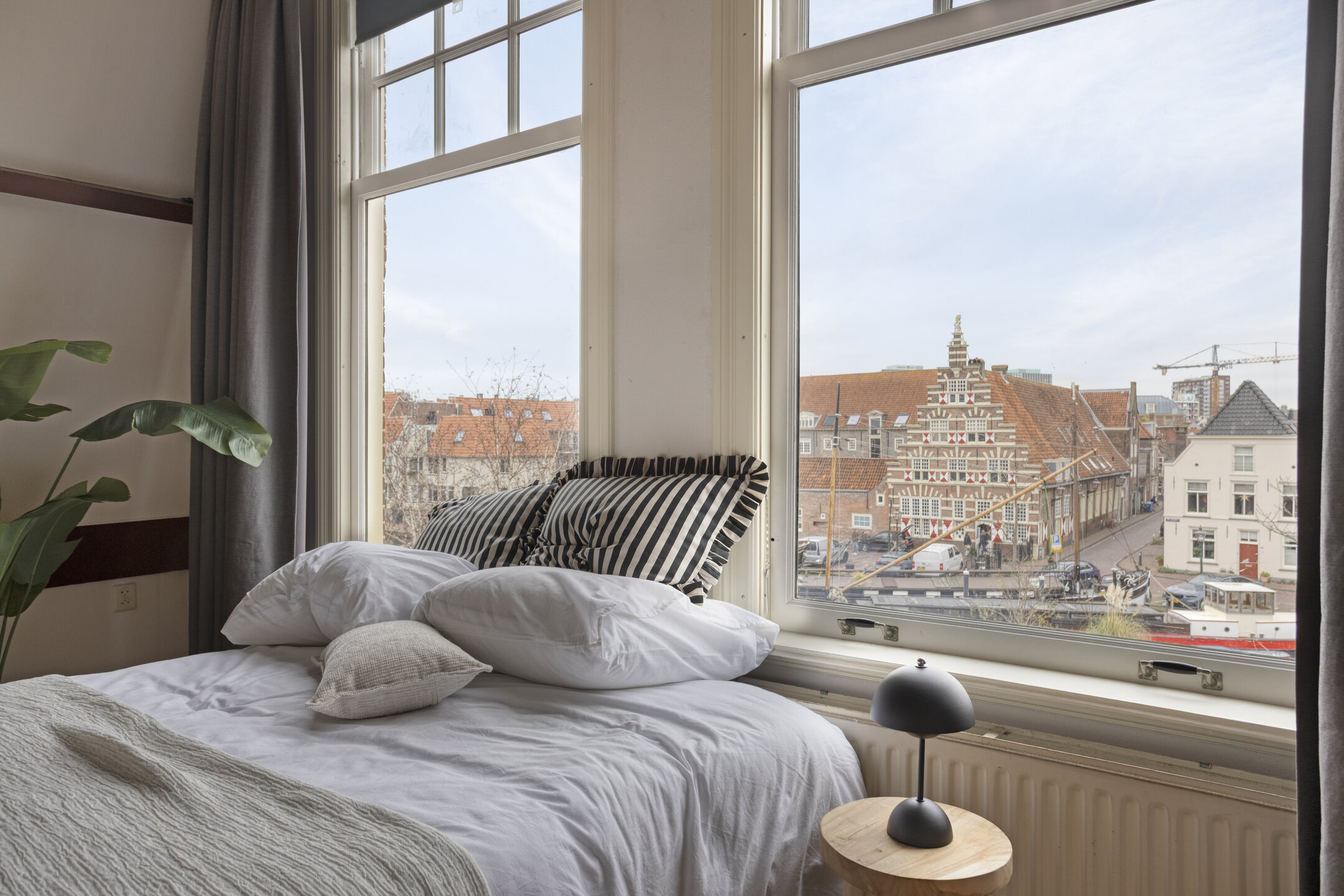 Op de plek waar eeuwen geleden de stadsmuren de stad beschermden, kijk je nu uit over de haven met haar historische schepen en monumentale panden. Het huis draagt nog altijd de charme van de vroege 20e en de 17e eeuw, met royale plafondhoogtes en een overvloed aan natuurlijk licht dat door de ramen naar binnen stroomt.