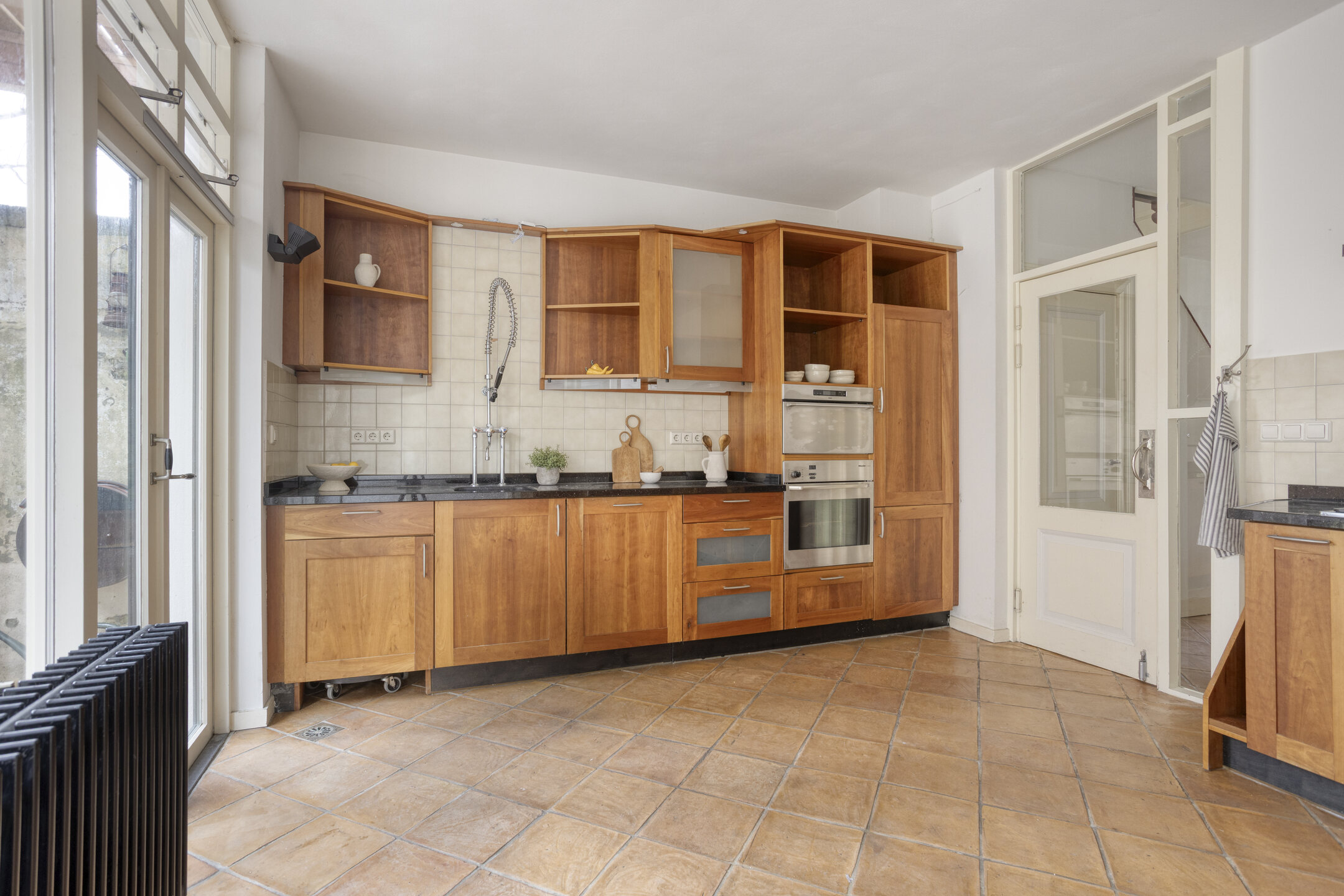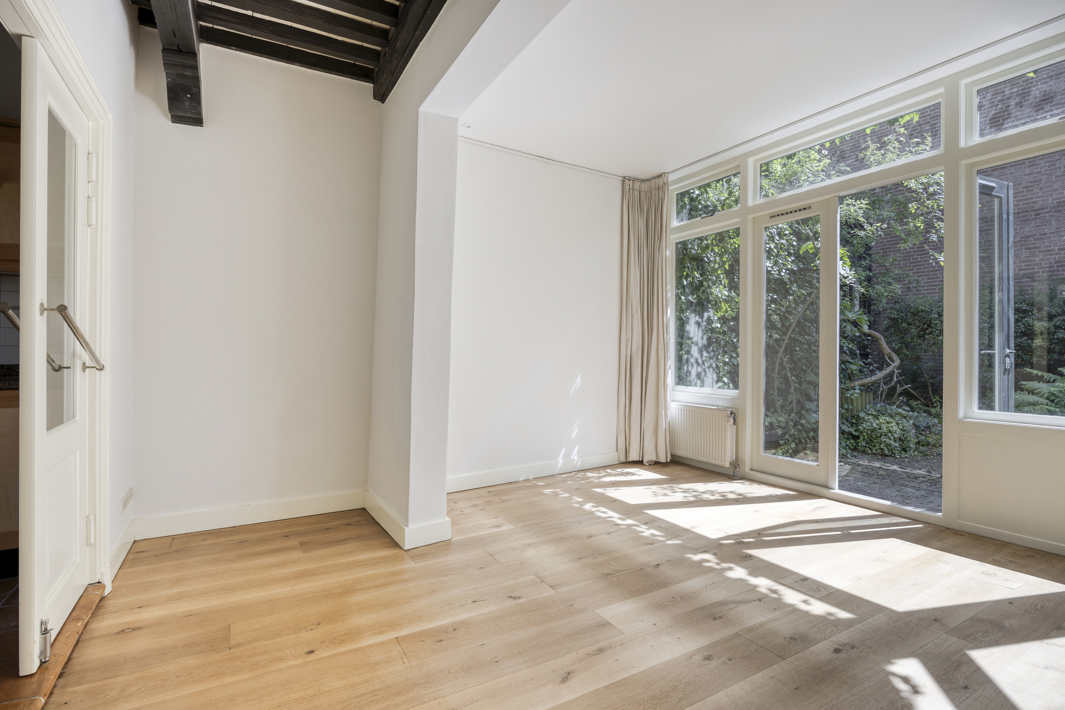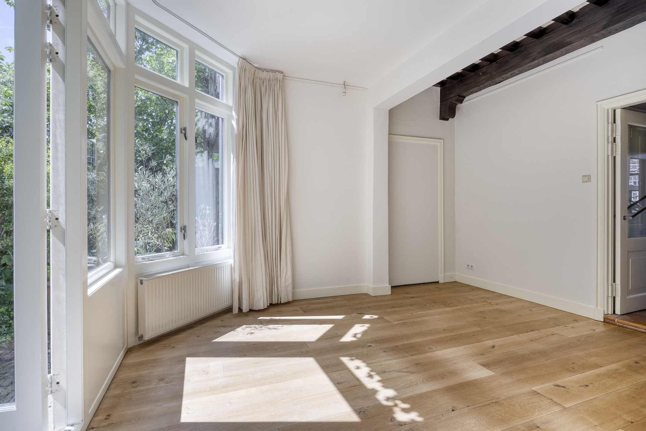 Kamer voorzijde met authentieke details en tuinkamer met openslaande deuren en binnendoor naar nr. 11. Keuken met inbouwapparatuur en badkamer met ligbad. wastafel en wc.