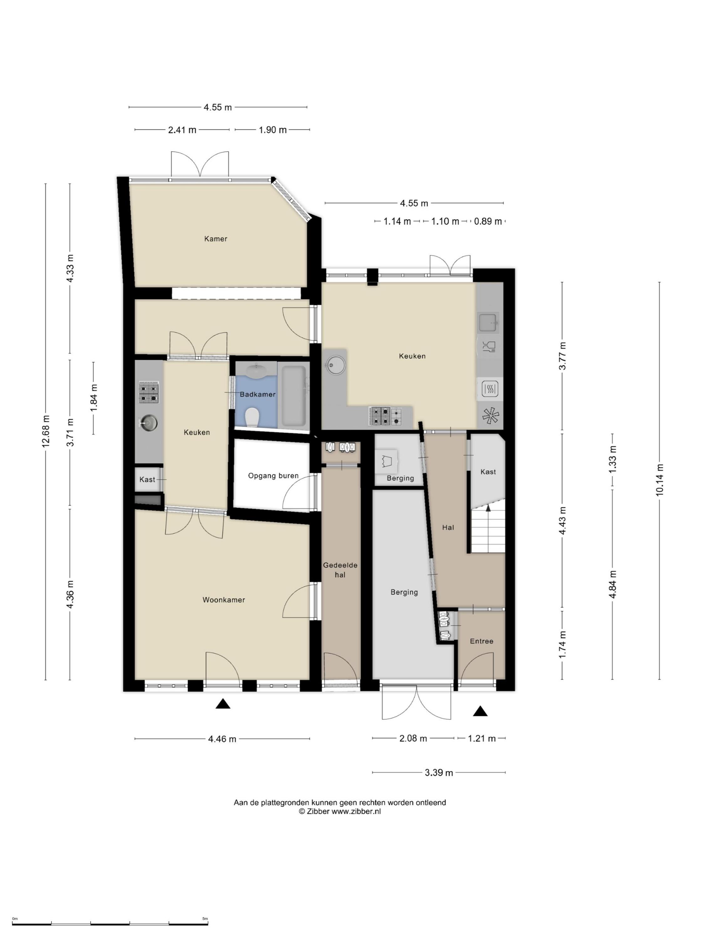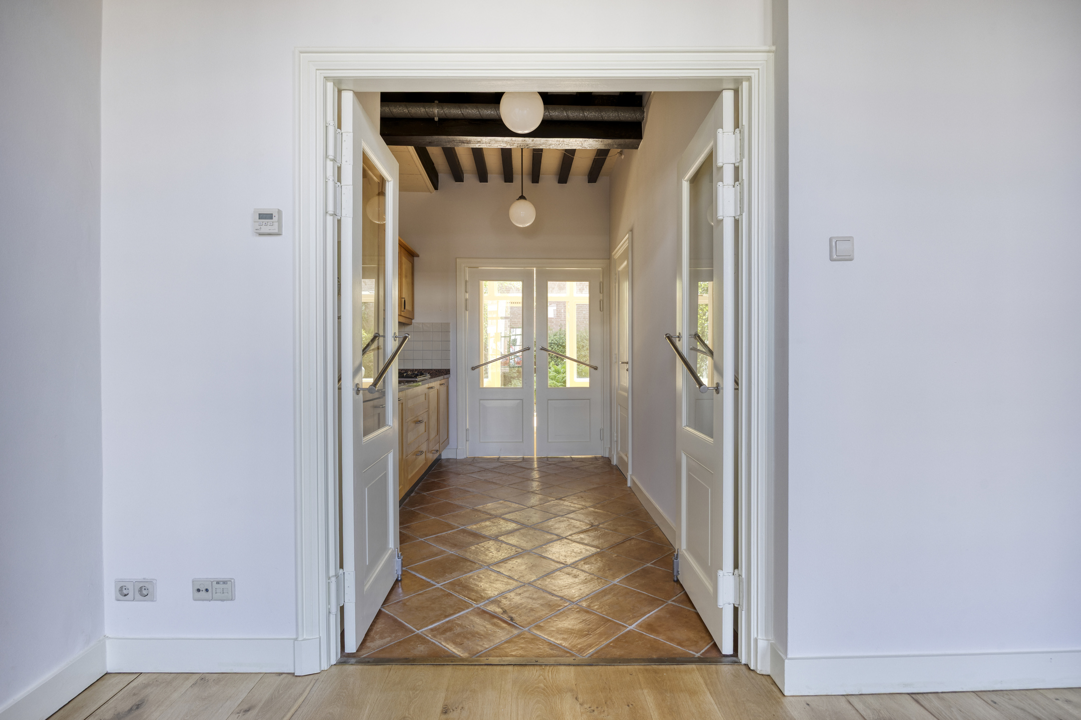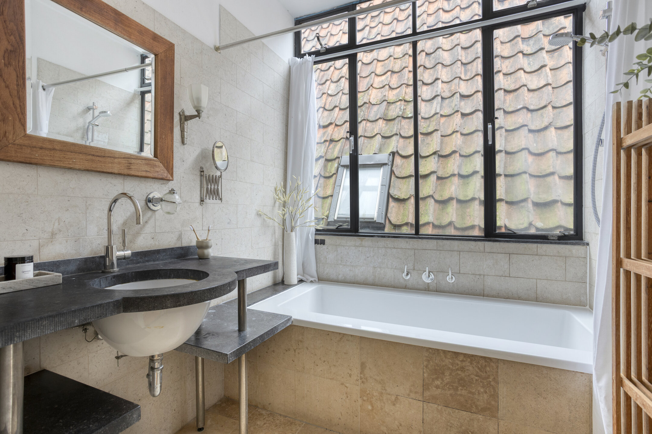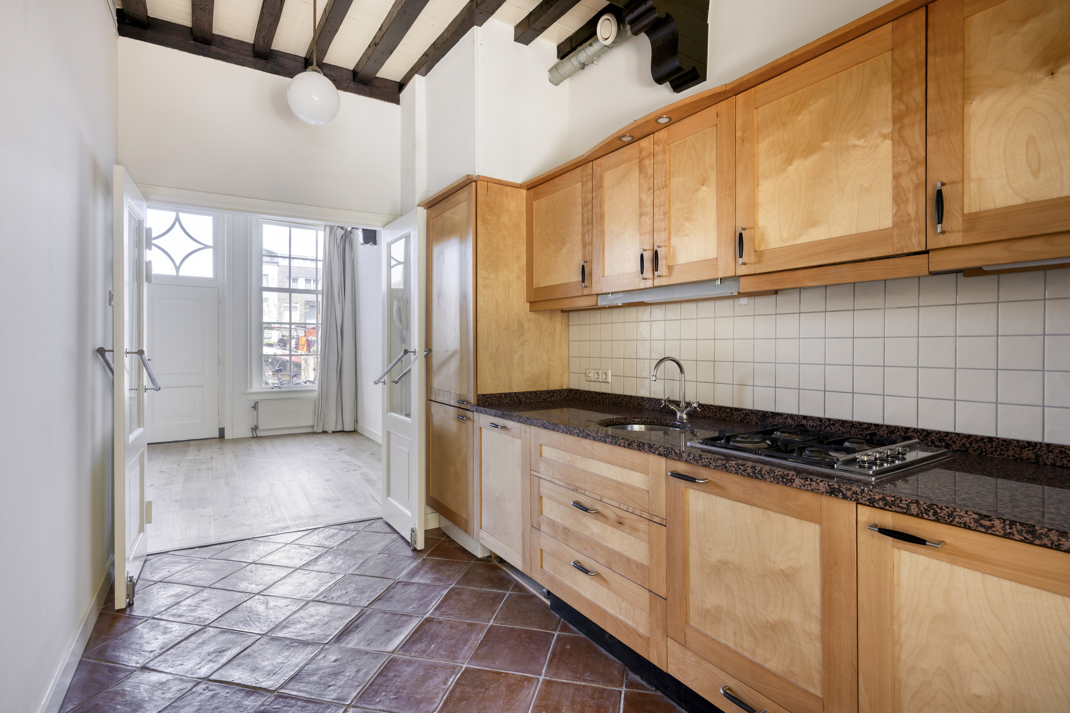 Kamer voorzijde met authentieke details en tuinkamer met openslaande deuren en binnendoor naar nr. 11. Keuken met inbouwapparatuur en badkamer met ligbad. wastafel en wc.