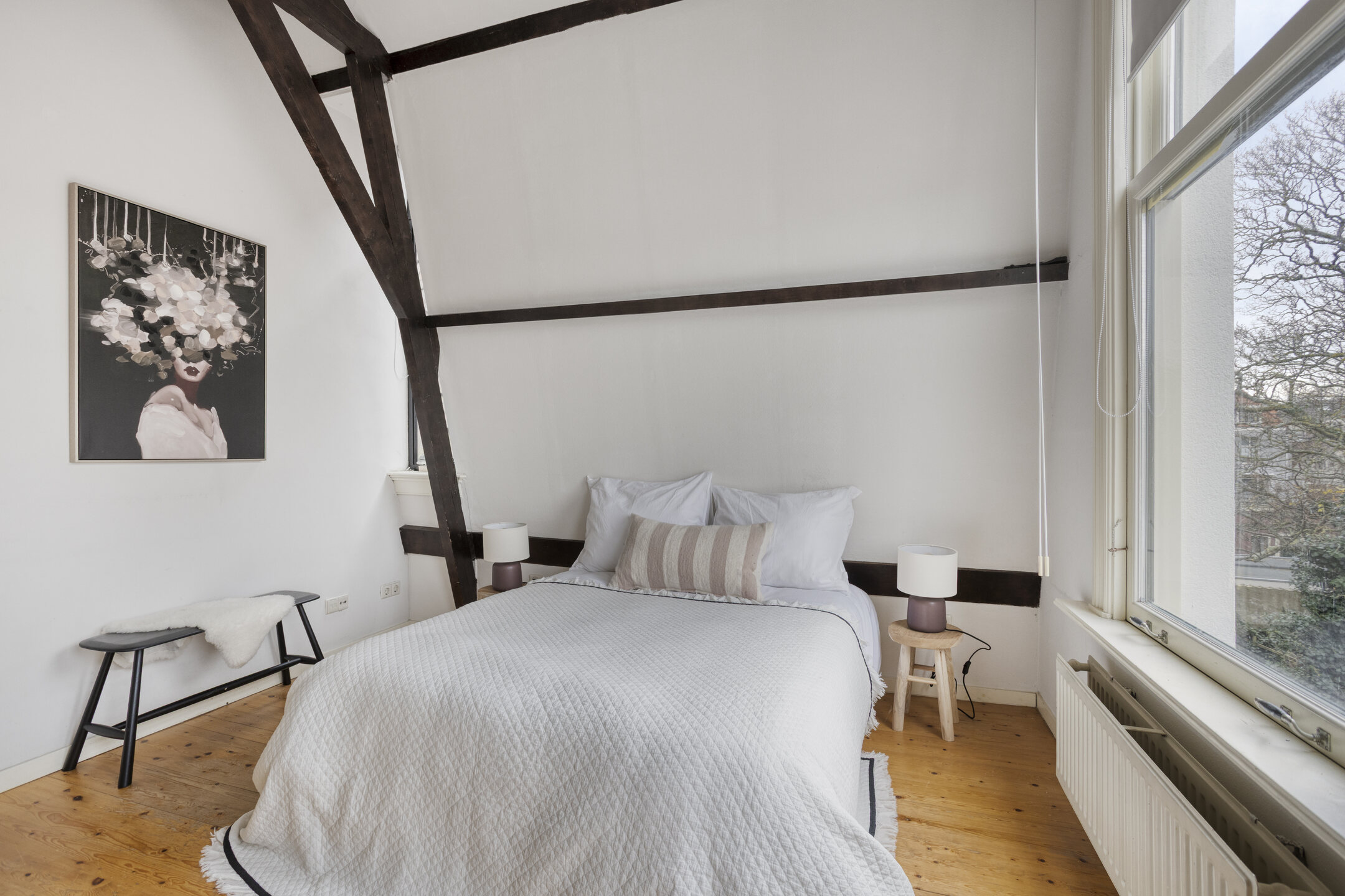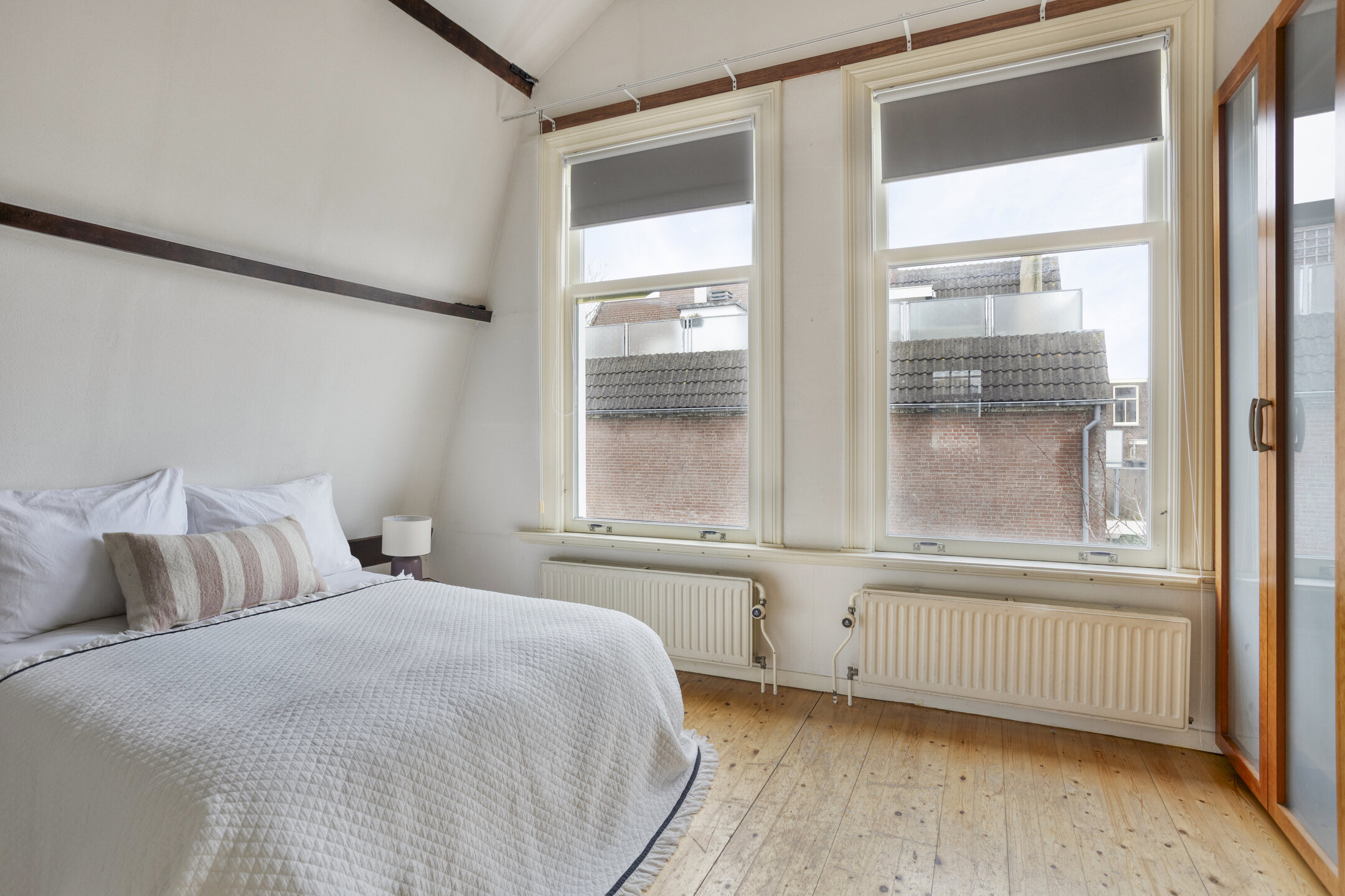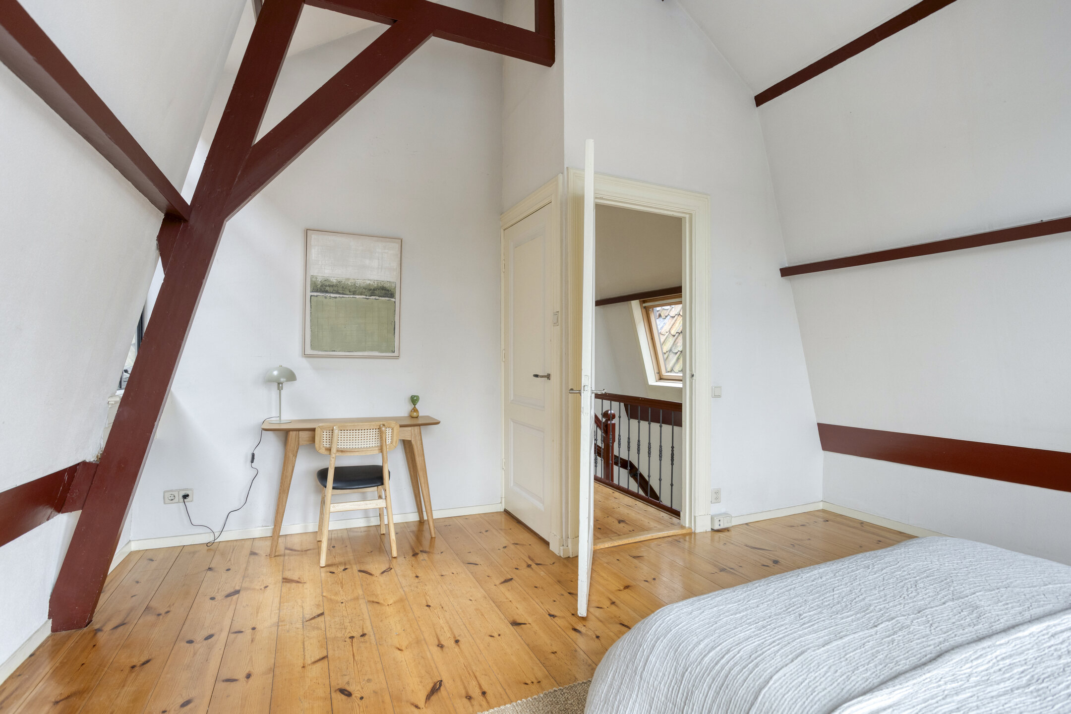 Overloop. Ruime slaapkamers met hoge balkenplafonds aan voor- en achterzijde. Moderne badkamer met douche, wc en wastafel.