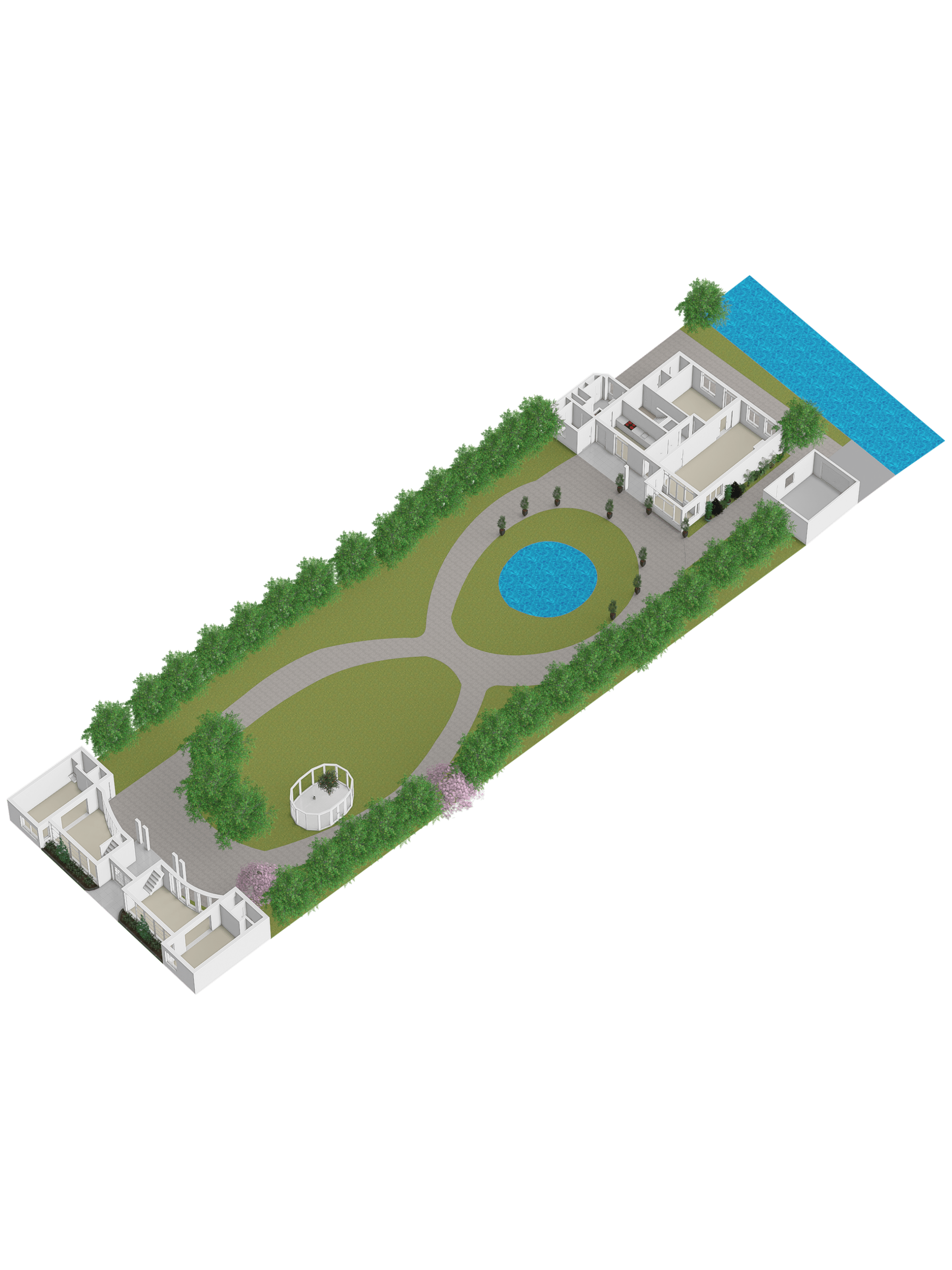 After you have closed the electric gate of the gatehouse behind you, you immediately imagine yourself in a different environment and the peace comes over you. A central lawn with a centuries-old plane tree (1820) forms the heart of the courtyard. Special is the greenhouse with a mandarin tree next to this tree, where you can still sit on a sunny day in the middle of winter. Both to the left and right of the lawn is a gravel path, where you can drive directly to the house if you want. There are now a few corners and seats where you can enjoy the sun or shade at different times of the day. A little further on is a pond that is equipped with a water supply system with Rhine water, with the entrance to the house behind it, flanked on the left by a veranda and on the right by a sunny conservatory. Here too, you can enjoy this large garden all year round.