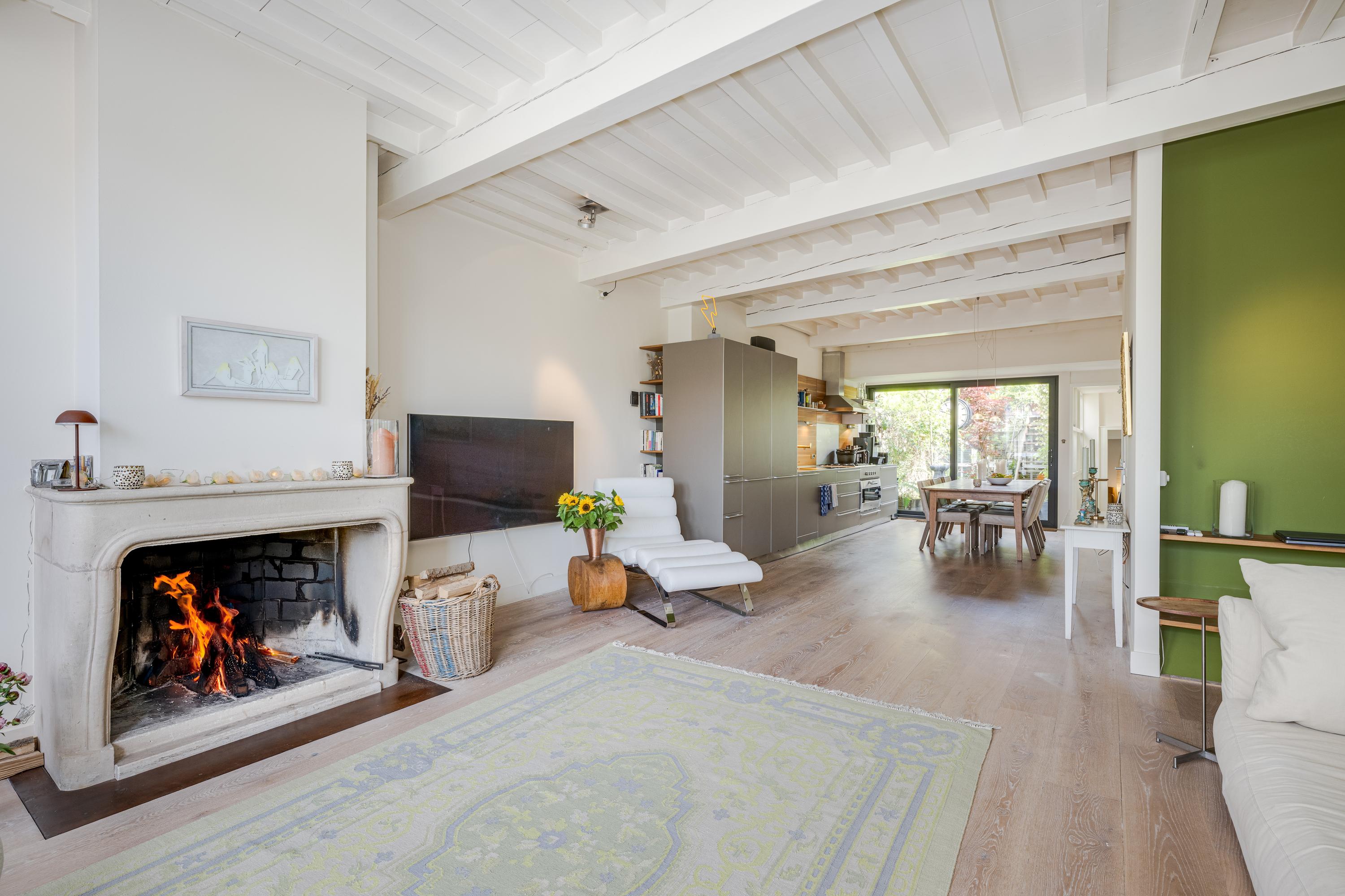 Charming and bright living room with an inviting fireplace and beautiful canal views. Open to the spacious kitchen/diner, equipped with all the usual appliances. Sliding doors provide access to the green, sheltered courtyard garden; an oasis of tranquility in the heart of the city. Separate toilet with a hand basin. From the landing, access to a second, charming multifunctional (living) room.