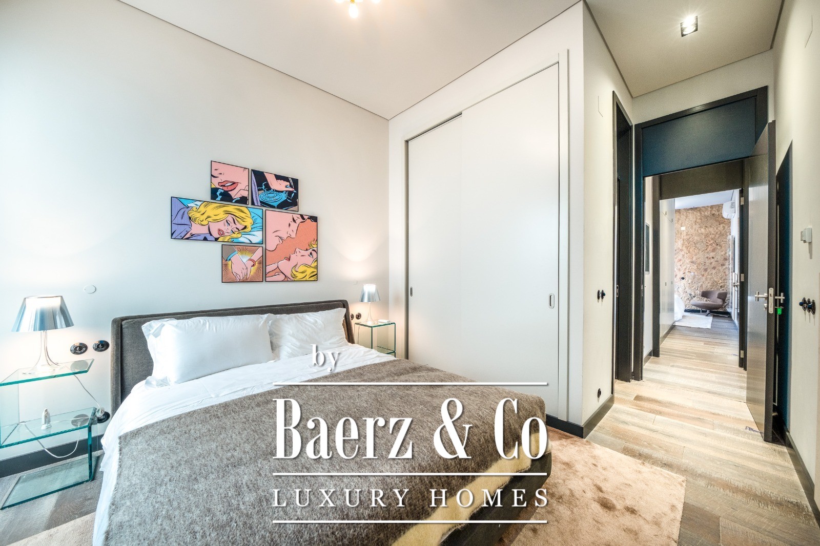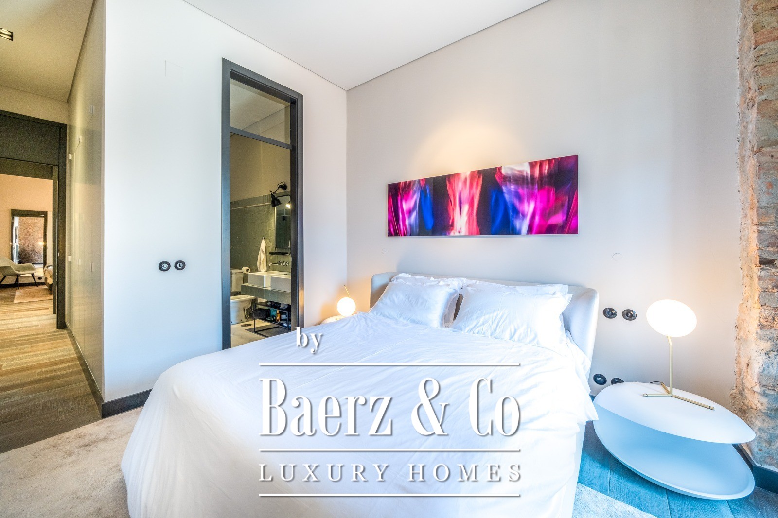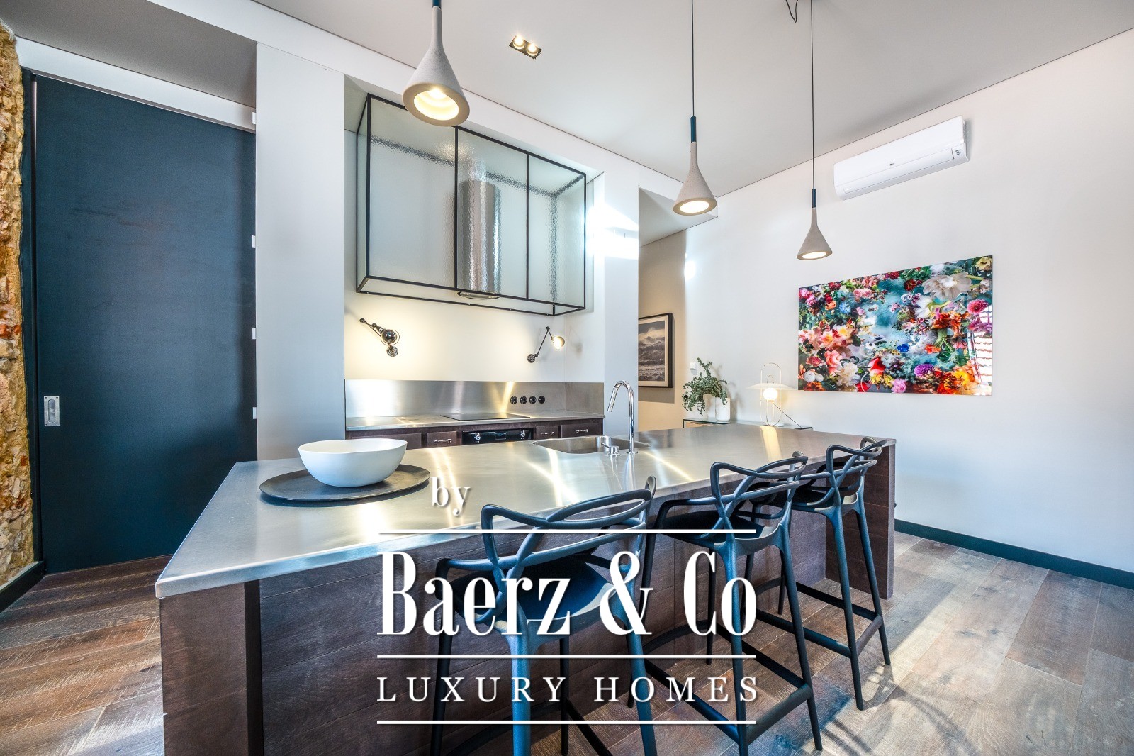 Located on a quiet cul-de-sac in Cais do Sodré, one of Lisbon’s most vibrant and historic neighborhoods, this 173 m² two-bedroom apartment offers a loft-style design with a distinct contemporary touch. Set on the second floor of a 19th-century building with elevator access, it underwent a full renovation in 2019 with meticulous attention to detail and high-quality materials.The generous living area impresses with 3.7 m high ceilings, a striking 14 m exposed stone wall, and large arched windows that fill the space with natural light thanks to its south and east orientation. The kitchen is seamlessly integrated with the living room, combining design and functionality with stainless steel countertops, oak cabinetry, and statement lighting.The living experience extends