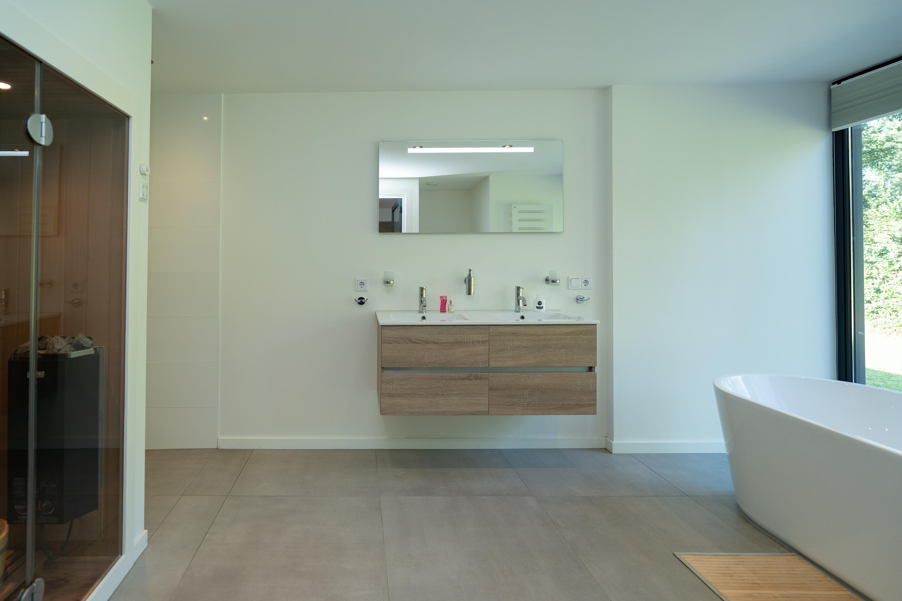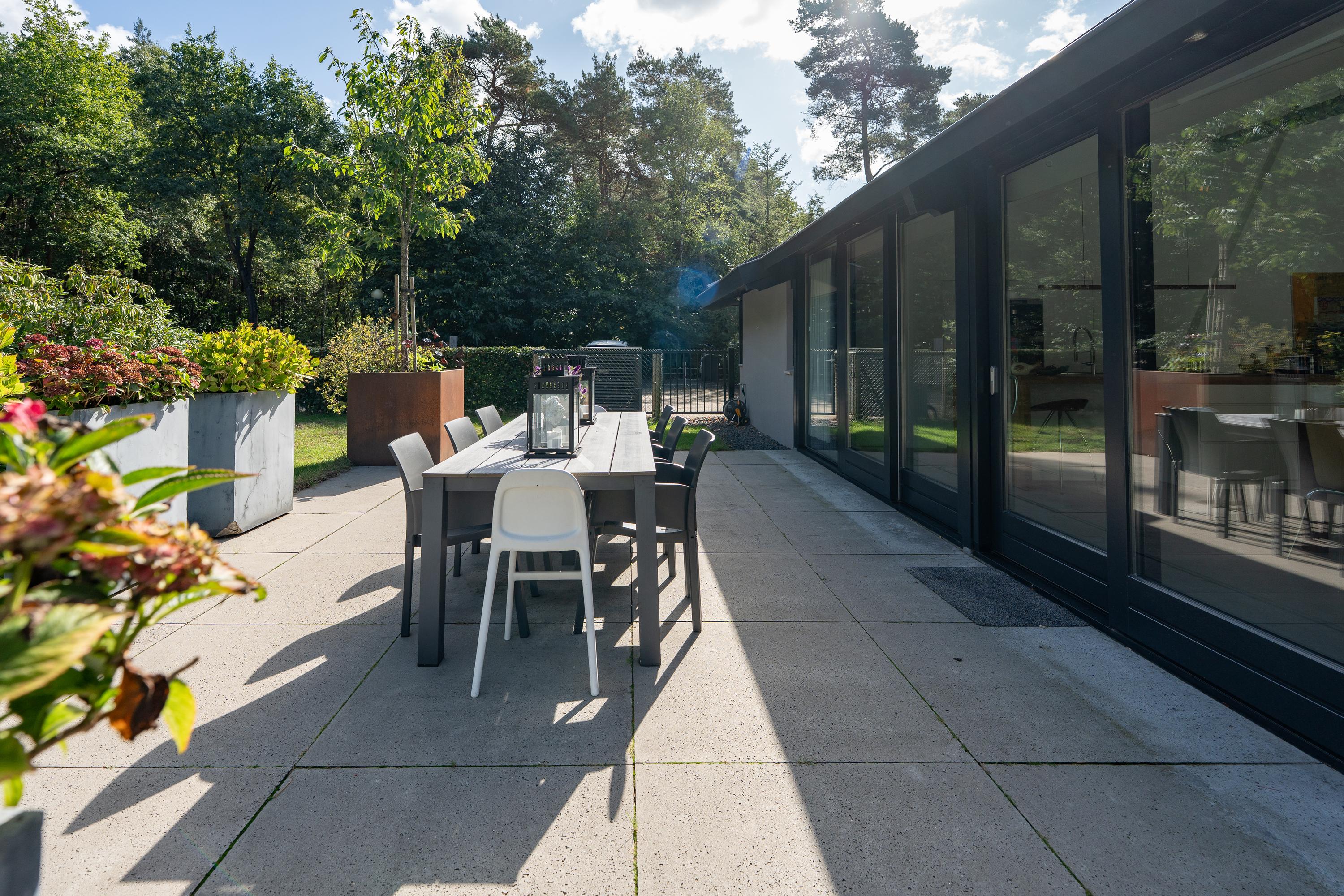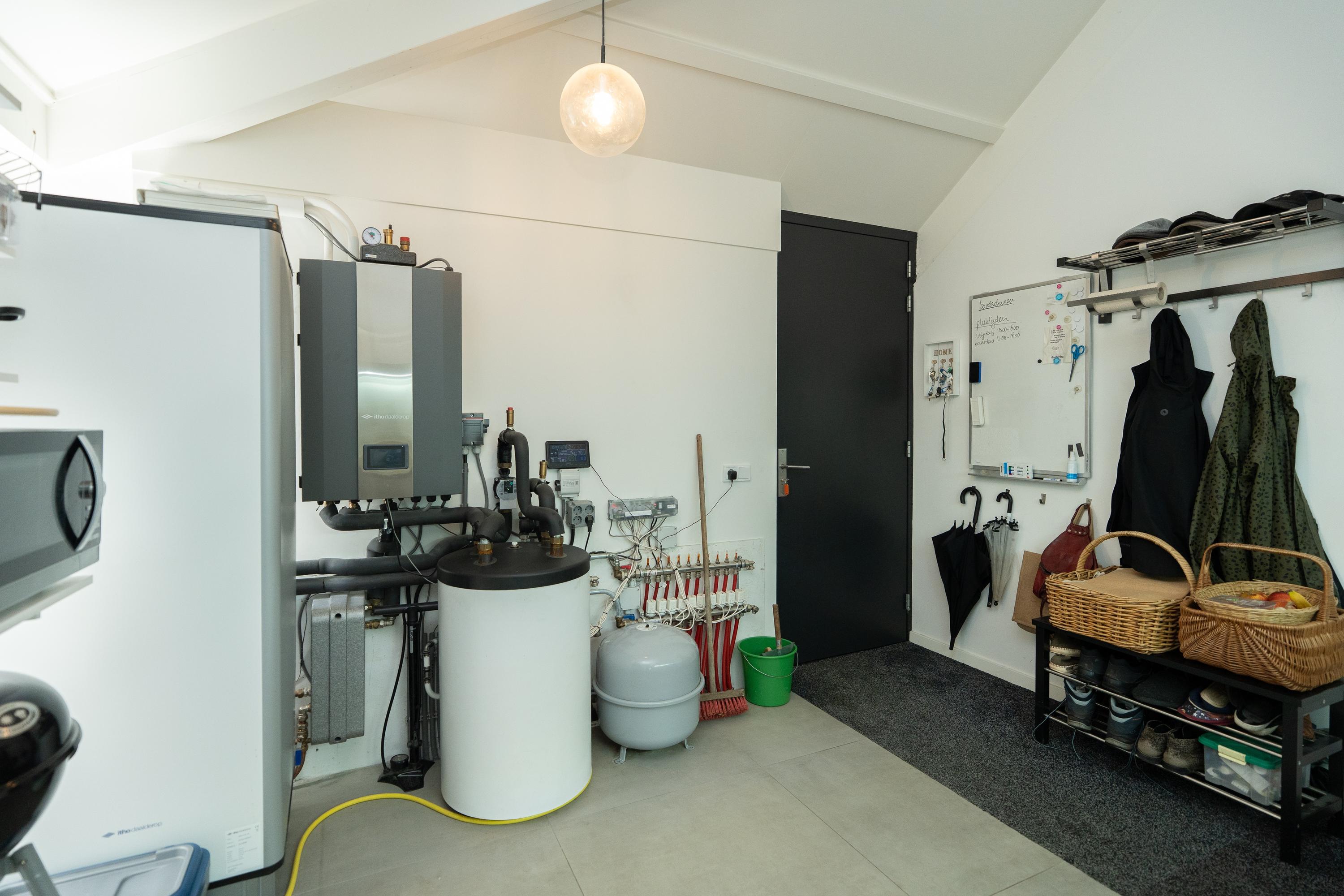 Entrance hall, spacious hall that immediately emphasises the spacious character of the house. The hall contains the meter cupboard, loft and the first toilet with washbasin. A spacious living room with high ceiling, where the many windows on all sides provide beautiful light and an open atmosphere. There are sliding doors to the front and back gardens at both the front and rear. There is also a spacious indoor storage room under the stairs and the staircase itself is beautifully concealed. Modern open kitchen with a large cooking island. The tall cabinets are beautifully concealed in the wall and the kitchen is equipped with various luxury built-in appliances. The utility room is located at the front of the house and has a kitchen unit, heat pump and boiler, and an extra outside door.