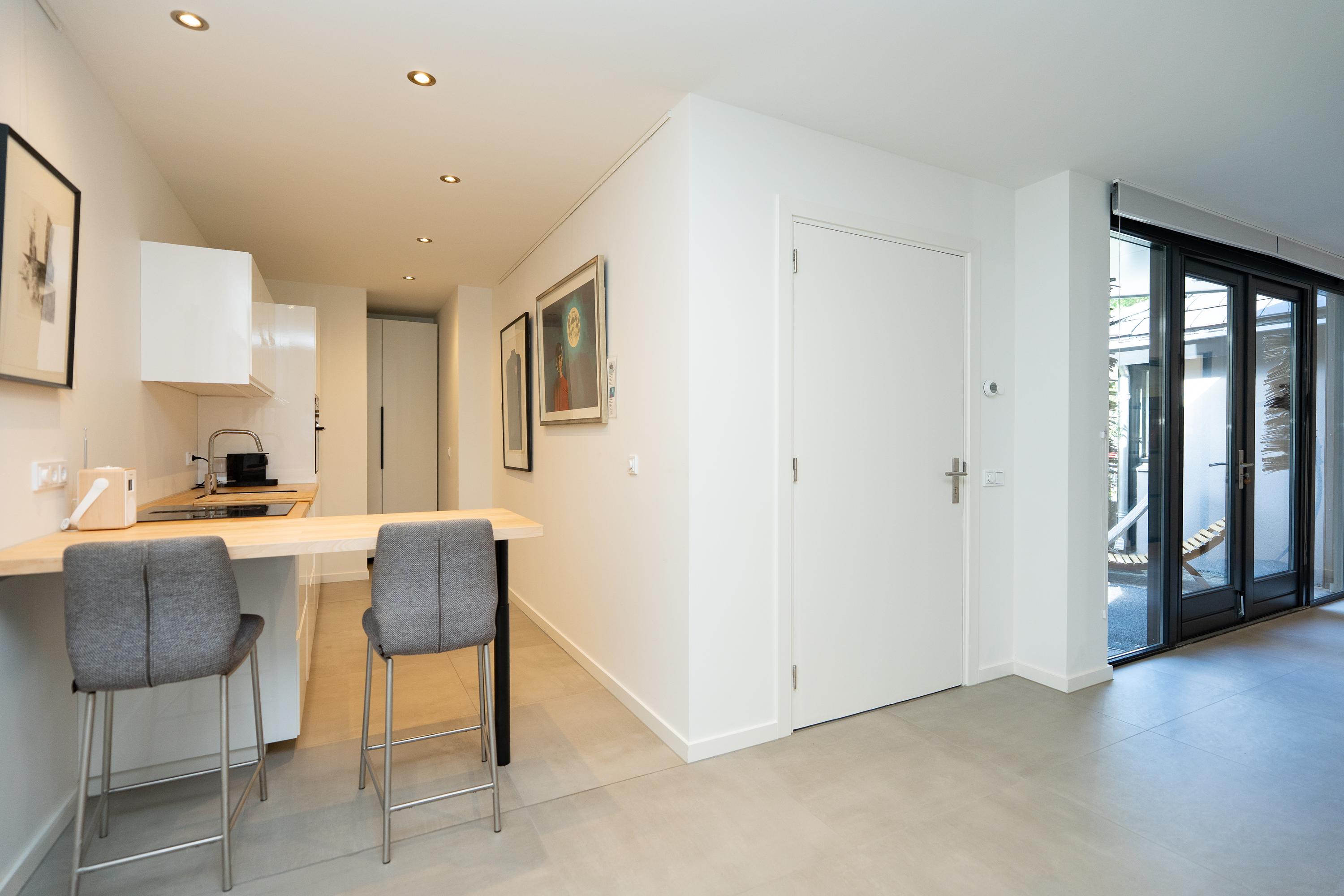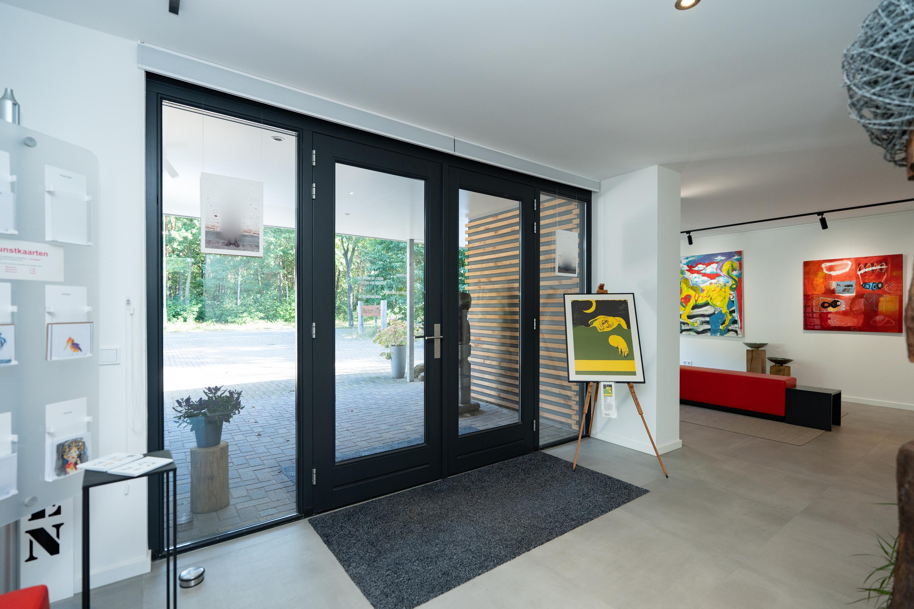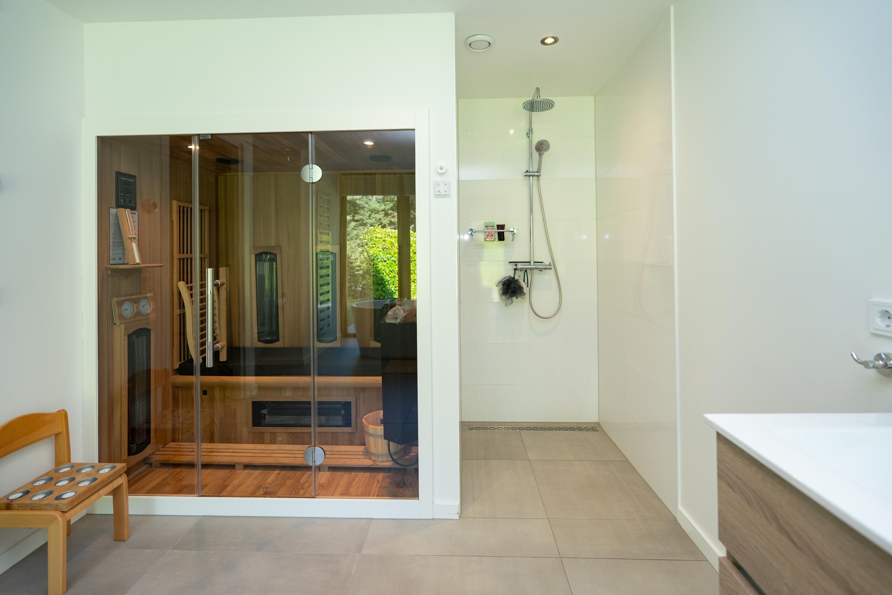 Entrance hall, spacious hall that immediately emphasises the spacious character of the house. The hall contains the meter cupboard, loft and the first toilet with washbasin. A spacious living room with high ceiling, where the many windows on all sides provide beautiful light and an open atmosphere. There are sliding doors to the front and back gardens at both the front and rear. There is also a spacious indoor storage room under the stairs and the staircase itself is beautifully concealed. Modern open kitchen with a large cooking island. The tall cabinets are beautifully concealed in the wall and the kitchen is equipped with various luxury built-in appliances. The utility room is located at the front of the house and has a kitchen unit, heat pump and boiler, and an extra outside door.