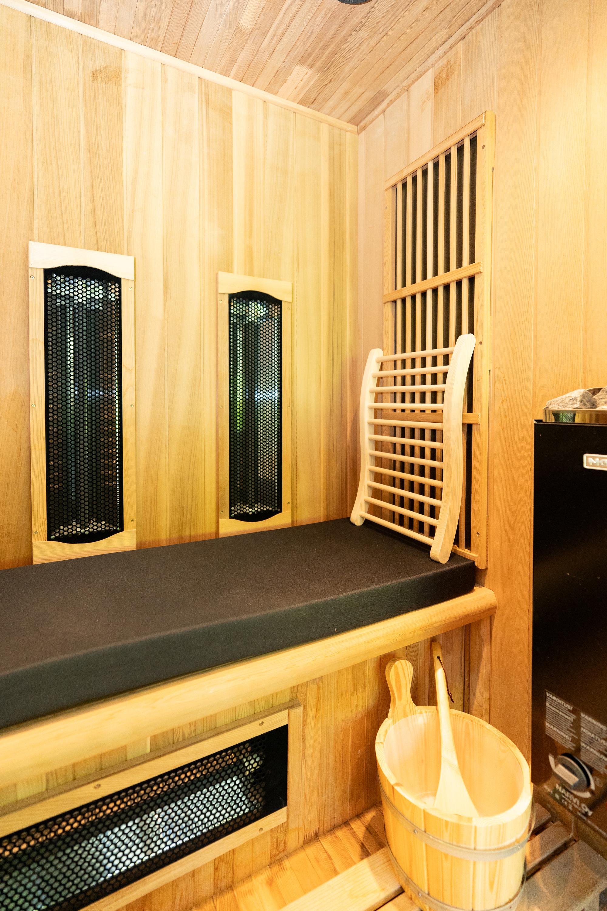 There are a total of three bedrooms and a multifunctional study on the ground floor. The study is currently used as a gallery. The master bedroom has a spacious walk-in closet and an adjoining very spacious bathroom with a combination sauna, freestanding bathtub, shower, double sink, and toilet. Here you can relax and enjoy the green surroundings while bathing. The second bathroom is located near the other bedrooms and is equipped with a shower, double sink and toilet.