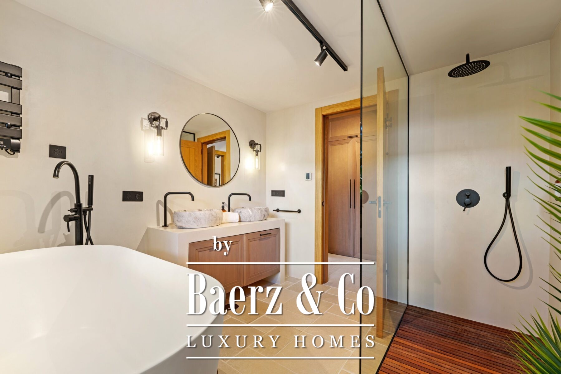 The interior design is a harmonious fusion of sophistication and warmth, combining neutral tones, natural textures, and bespoke furnishings to create a serene yet luxurious atmosphere. Handpicked décor pieces, artisanal lighting, and thoughtfully integrated shelving add character and charm, while large windows frame the captivating views and invite abundant daylight into every space. The result is a home that feels both contemporary and timeless, with a refined aesthetic that enhances its architectural beauty.