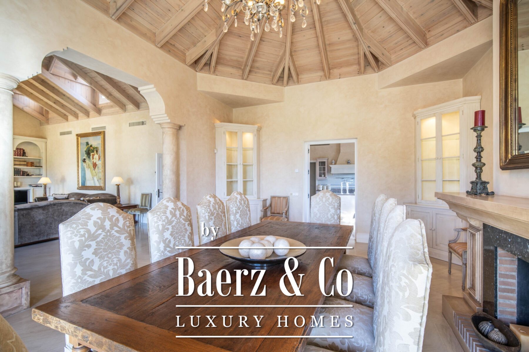 The residence comprises five spacious bedrooms and five bathrooms, complemented by two additional guest toilets. The interior is meticulously designed, featuring a fully furnished layout with porcelain floors and a fully fitted kitchen. The main living spaces include a welcoming living room with a fireplace, a formal dining room, a guest room, and a dedicated office room. The villa also benefits from a guest apartment, providing privacy and comfort for visitors.