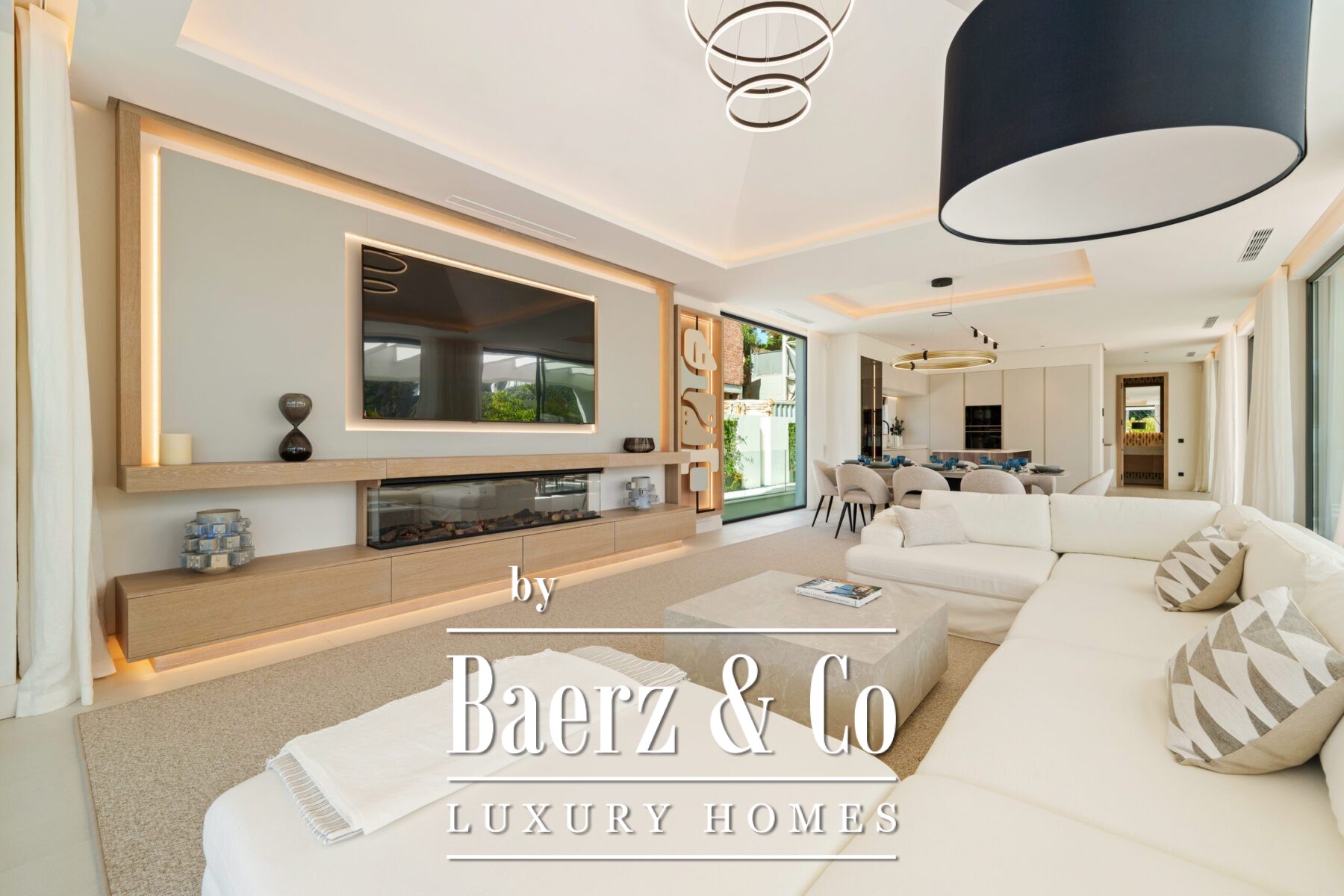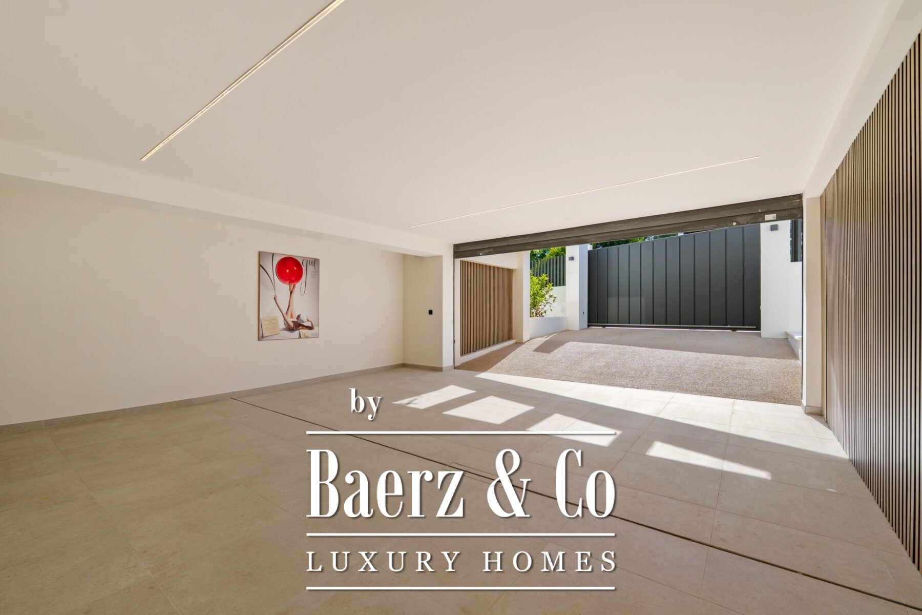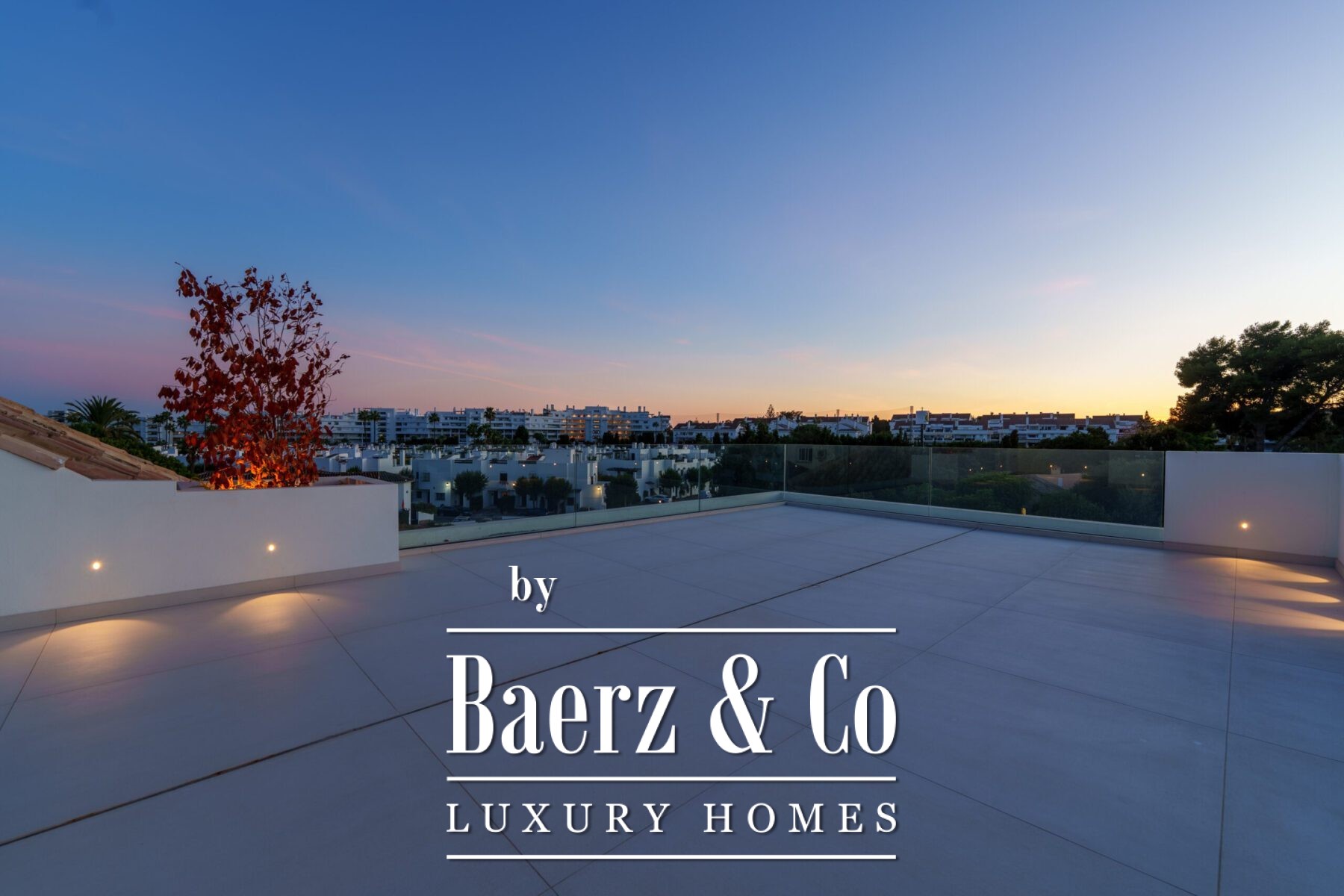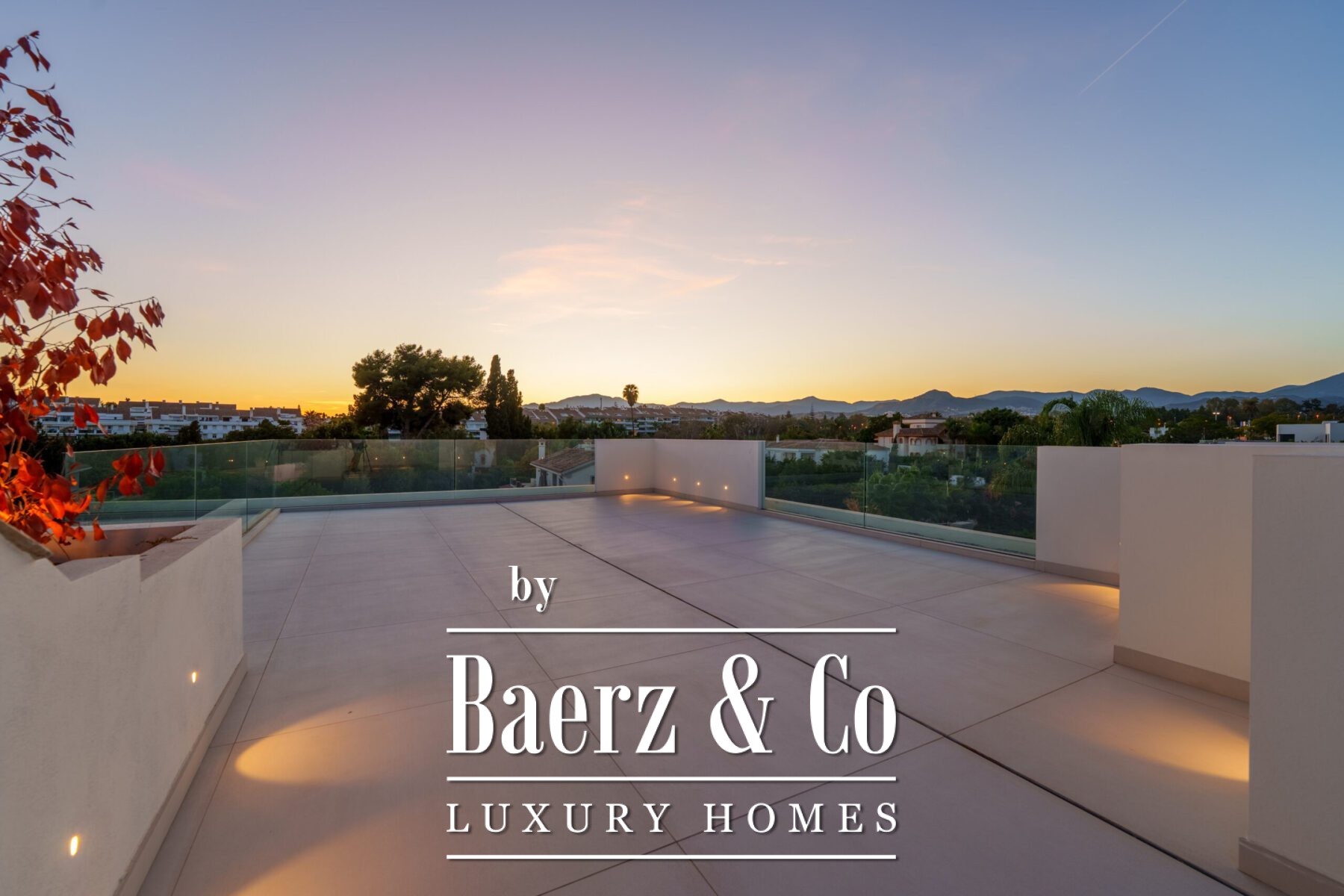 This contemporary villa in the sought-after neighborhood of San Pedro de Alcántara combines sleek architecture with luxurious amenities. Set behind clean white walls and landscaped greenery, the property offers a private oasis with a sparkling pool bordered by a stylish wooden deck and an expansive covered terrace for dining and lounging. Generous outdoor spaces, including a rooftop solarium, create the perfect setting for relaxation and entertaining.