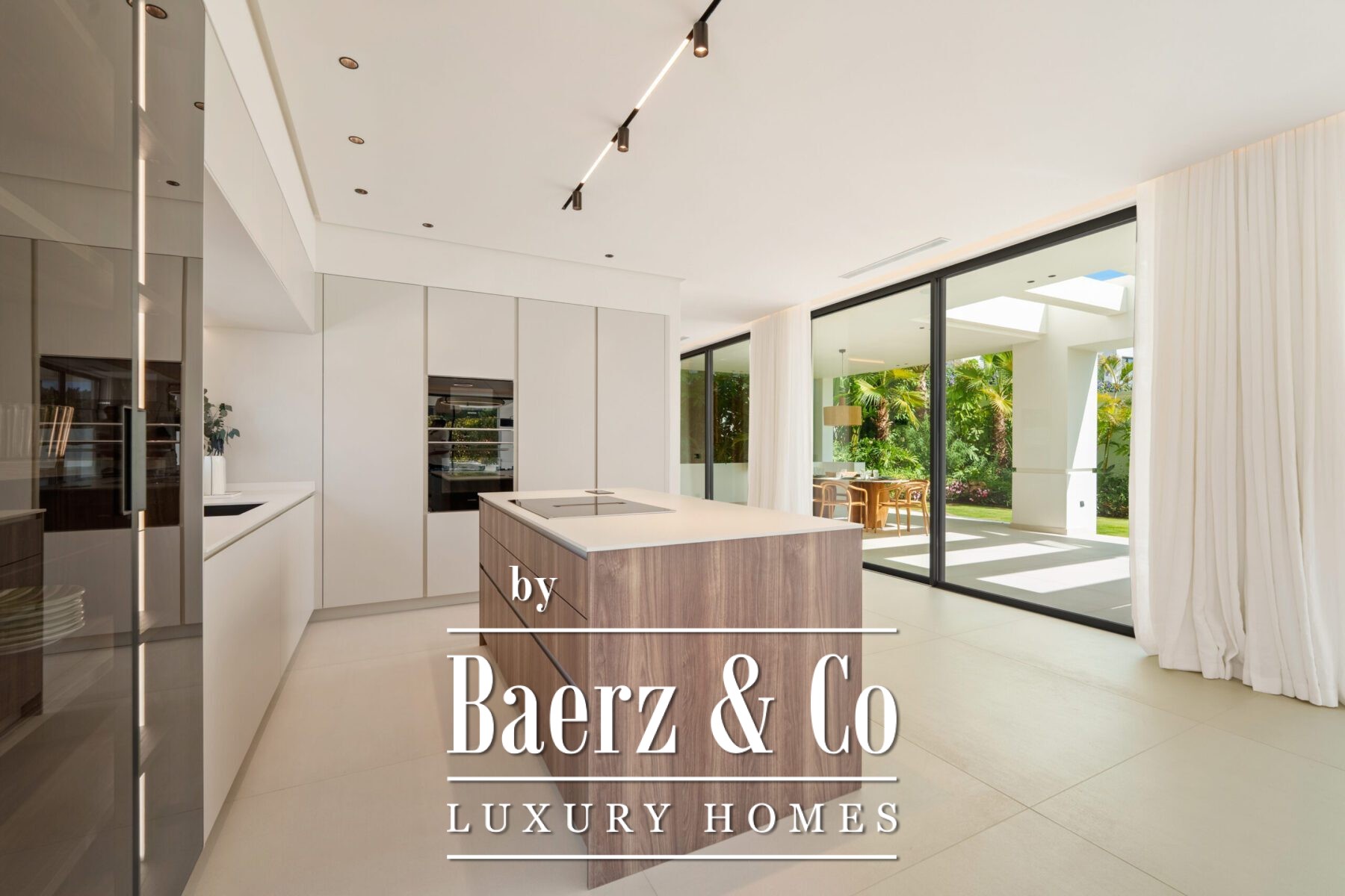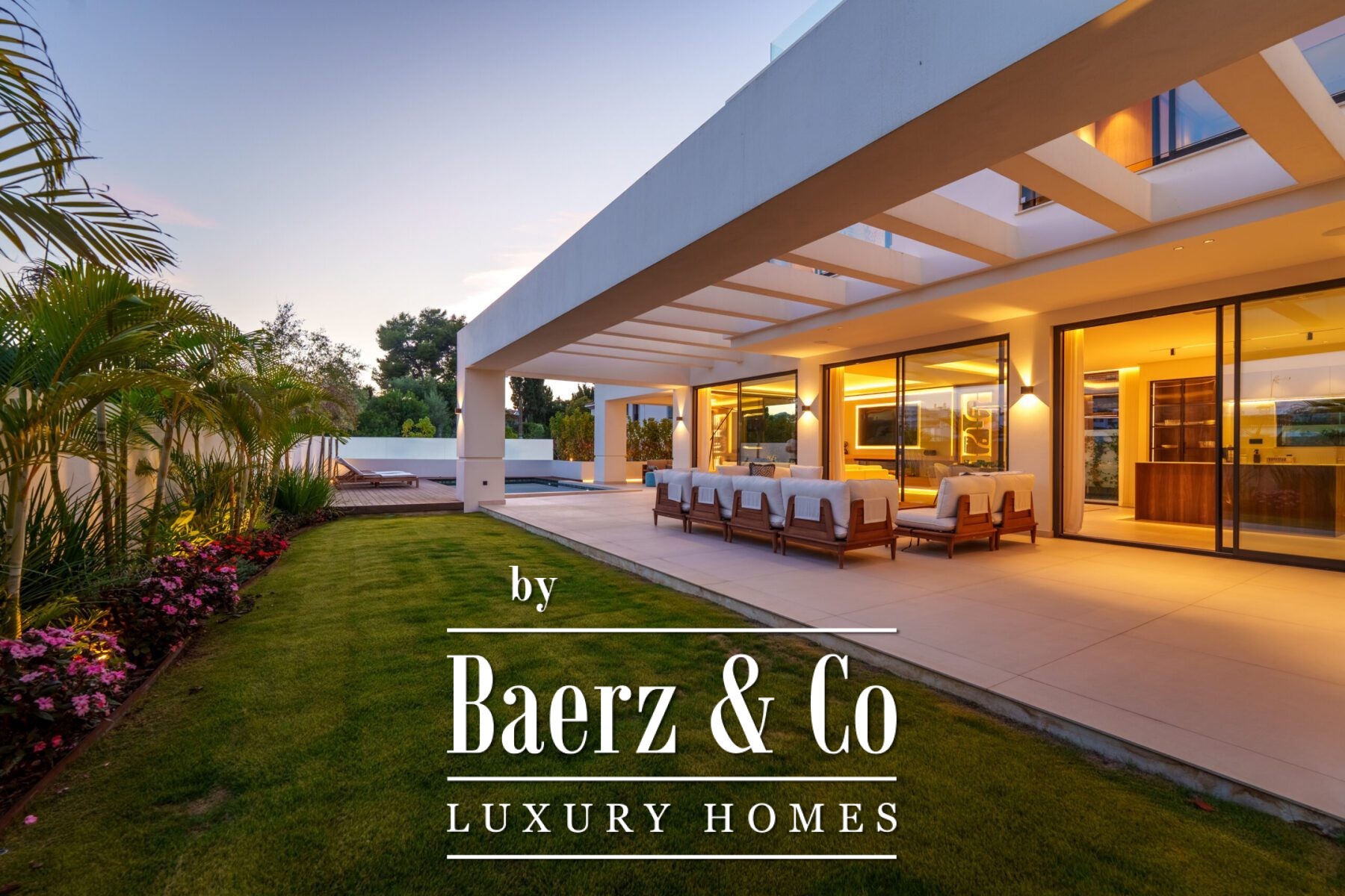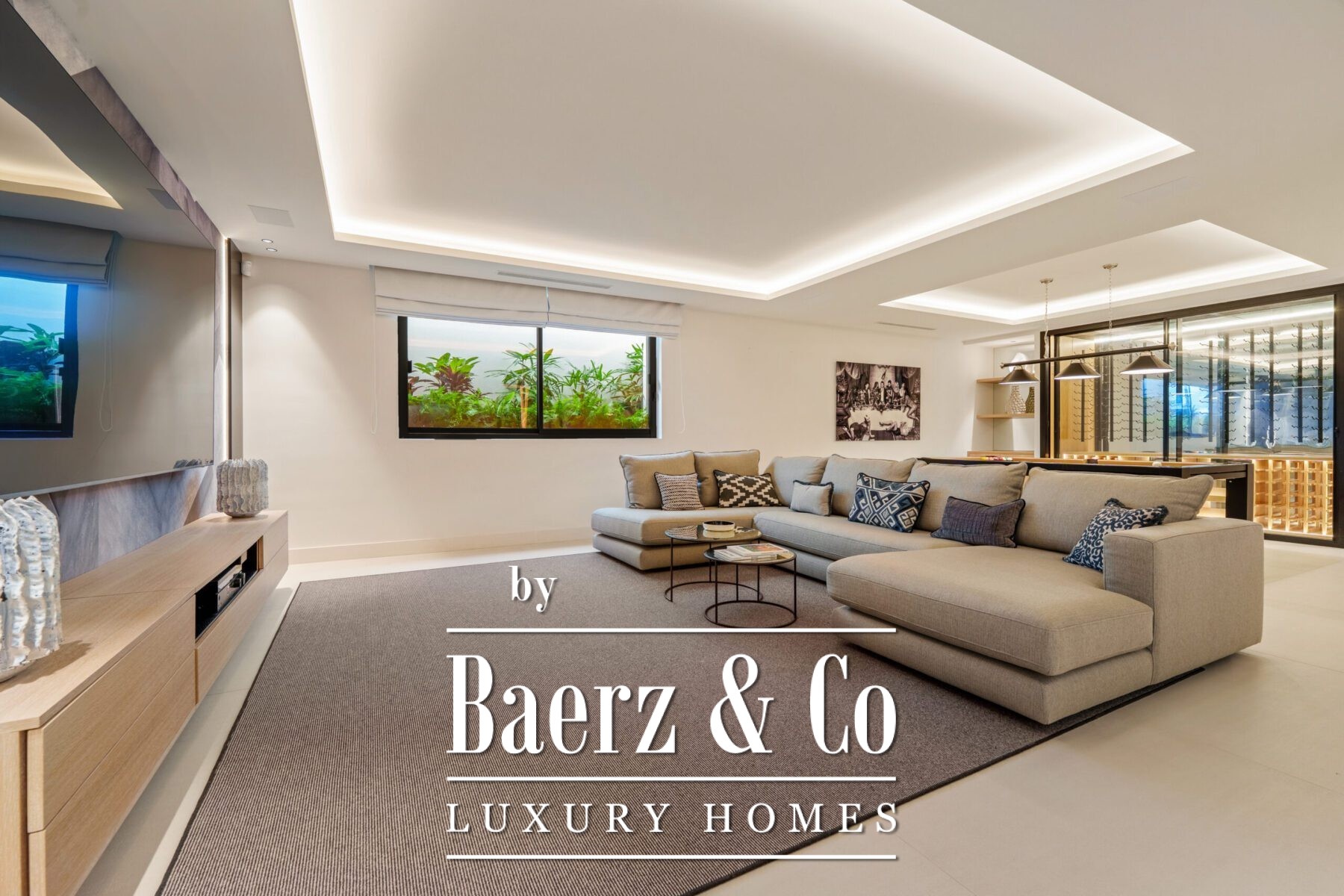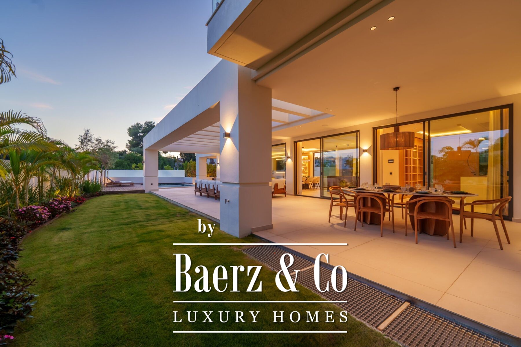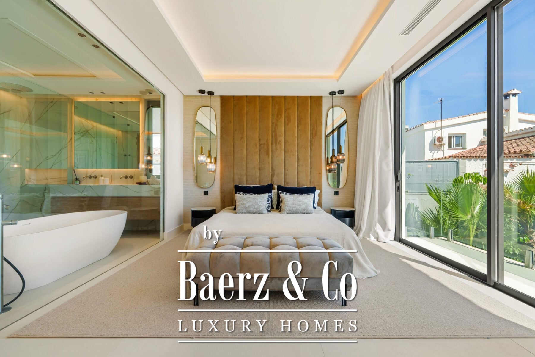 This contemporary villa in the sought-after neighborhood of San Pedro de Alcántara combines sleek architecture with luxurious amenities. Set behind clean white walls and landscaped greenery, the property offers a private oasis with a sparkling pool bordered by a stylish wooden deck and an expansive covered terrace for dining and lounging. Generous outdoor spaces, including a rooftop solarium, create the perfect setting for relaxation and entertaining.