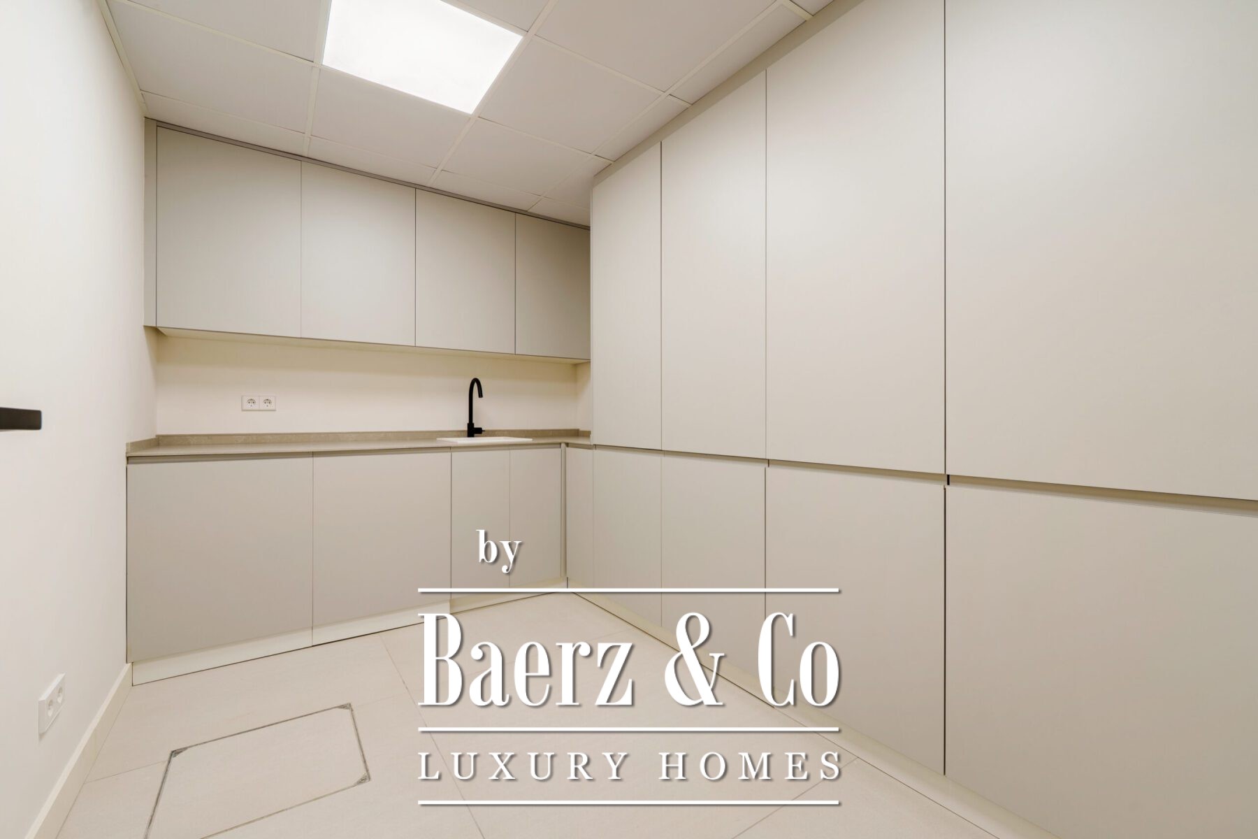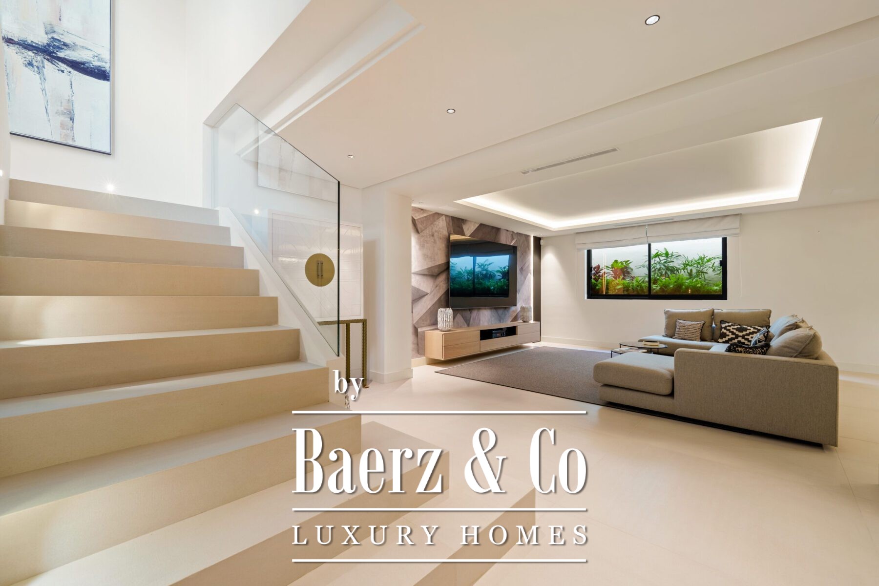 The villa’s private quarters continue the sophisticated aesthetic. Bedrooms are serene and airy, with floor-to-ceiling glass doors that open to terraces, and en-suite bathrooms that exude spa-like elegance with floating vanities, marble finishes, and freestanding tubs. The primary suite impresses with its luxurious proportions and direct access to a sunlit terrace, creating an intimate retreat within the home.