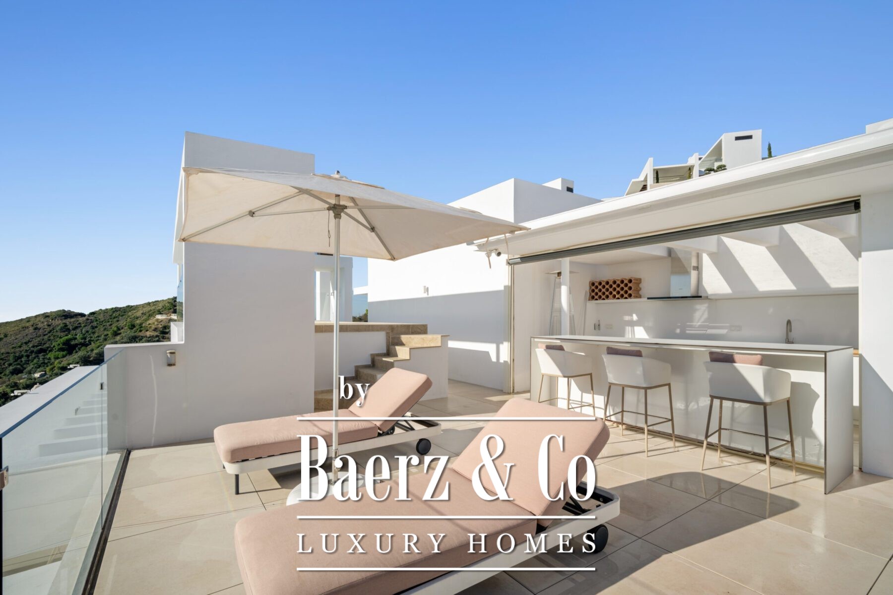 Residents enjoy 24-hour security and an array of resort-inspired amenities: clubhouse, spa, gym, sauna, cold plunge, cinema room, tennis courts, scenic hiking trails, and an on-site organic market. Located within minutes of Marbella's coast, golf courses, and all local conveniences, this duplex penthouse Marbella is a statement of elevated living in a privileged setting.