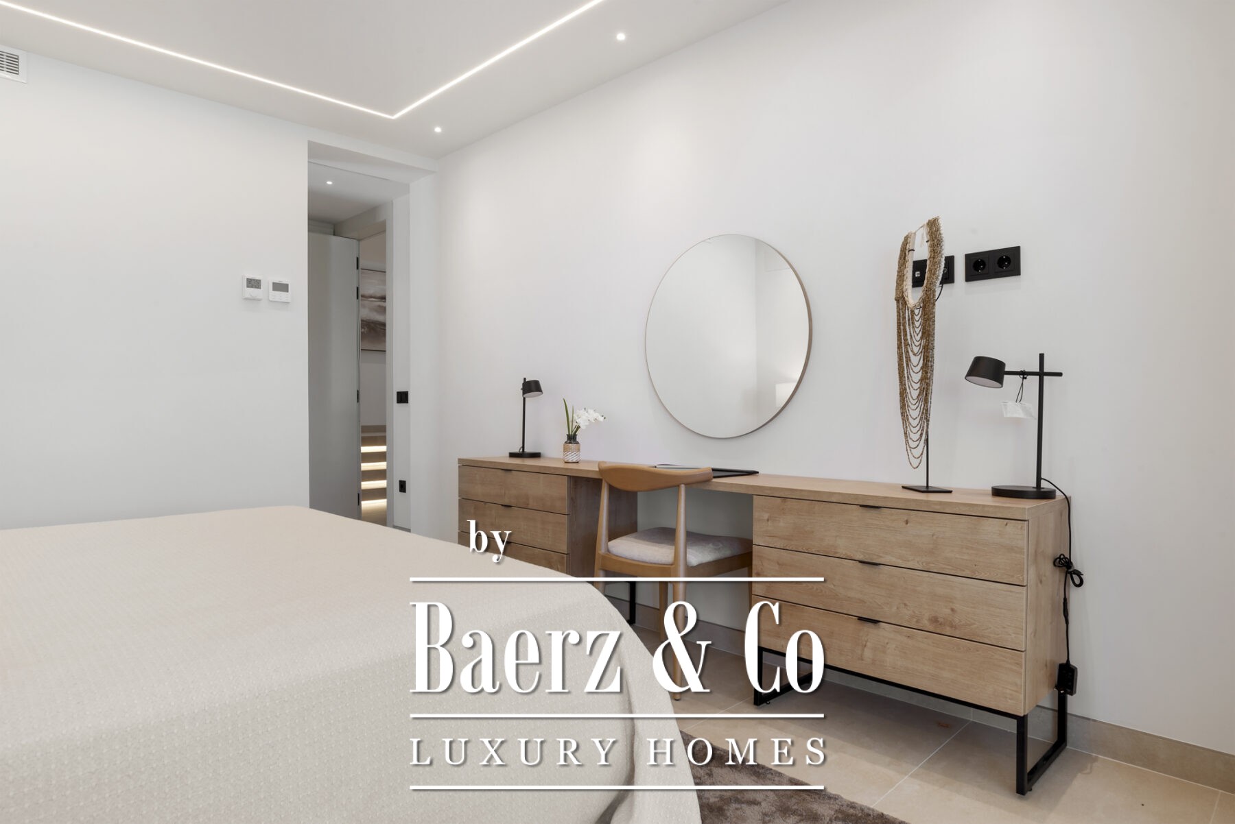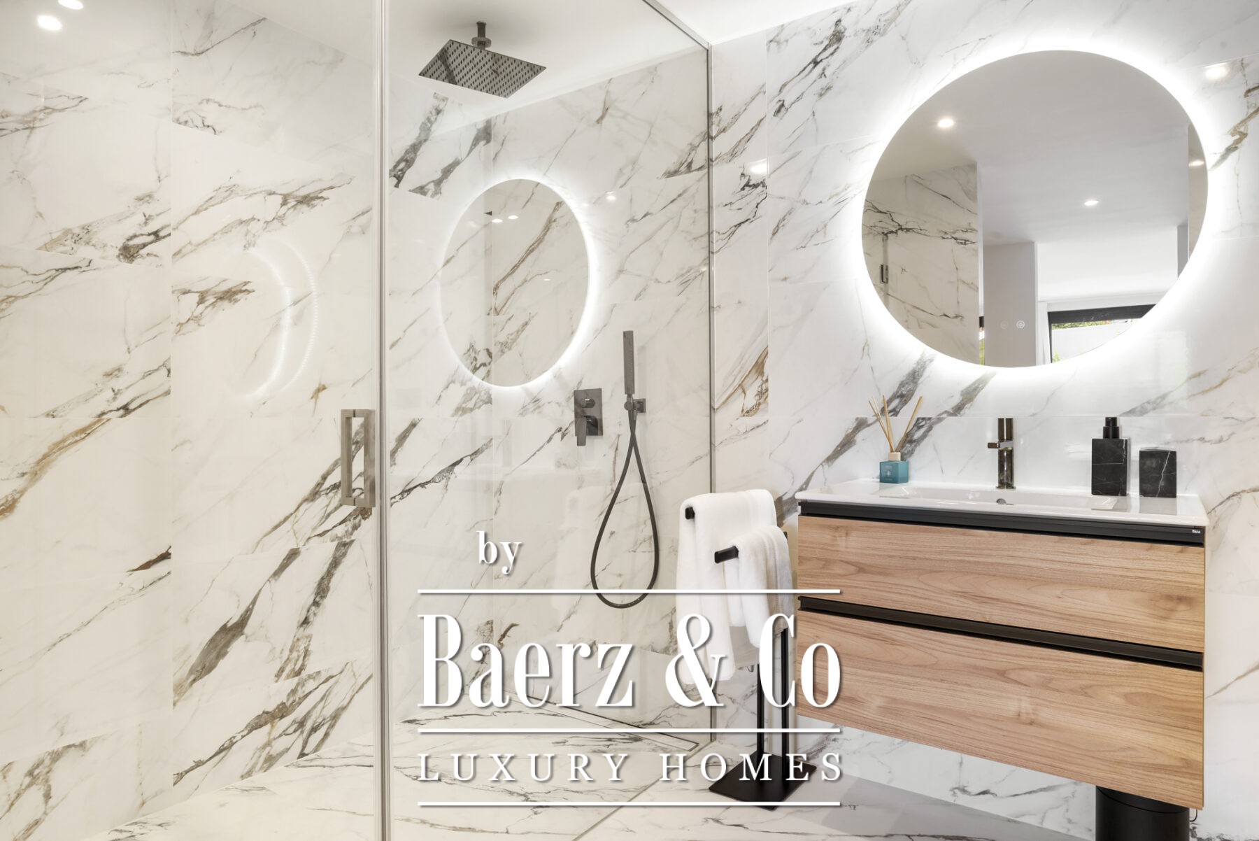 On the rooftop terrace, panoramic views of the sea and mountains invite moments of quiet reflection. Built-in wardrobes include LED illumination, combining practicality with subtle sophistication. The villa offers a garage for one car with a charging point, and additional enclosed parking for up to three further vehicles within the gate.