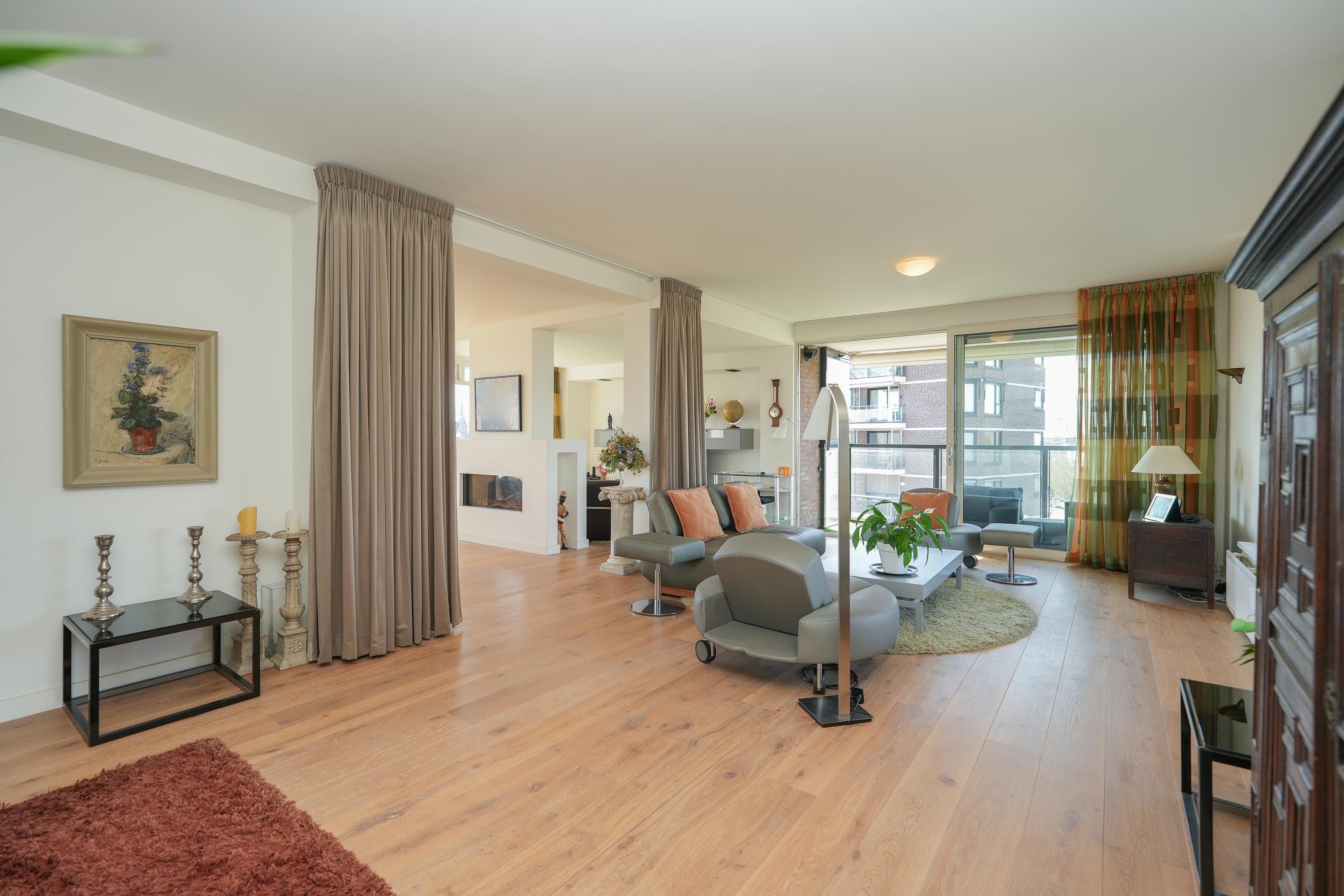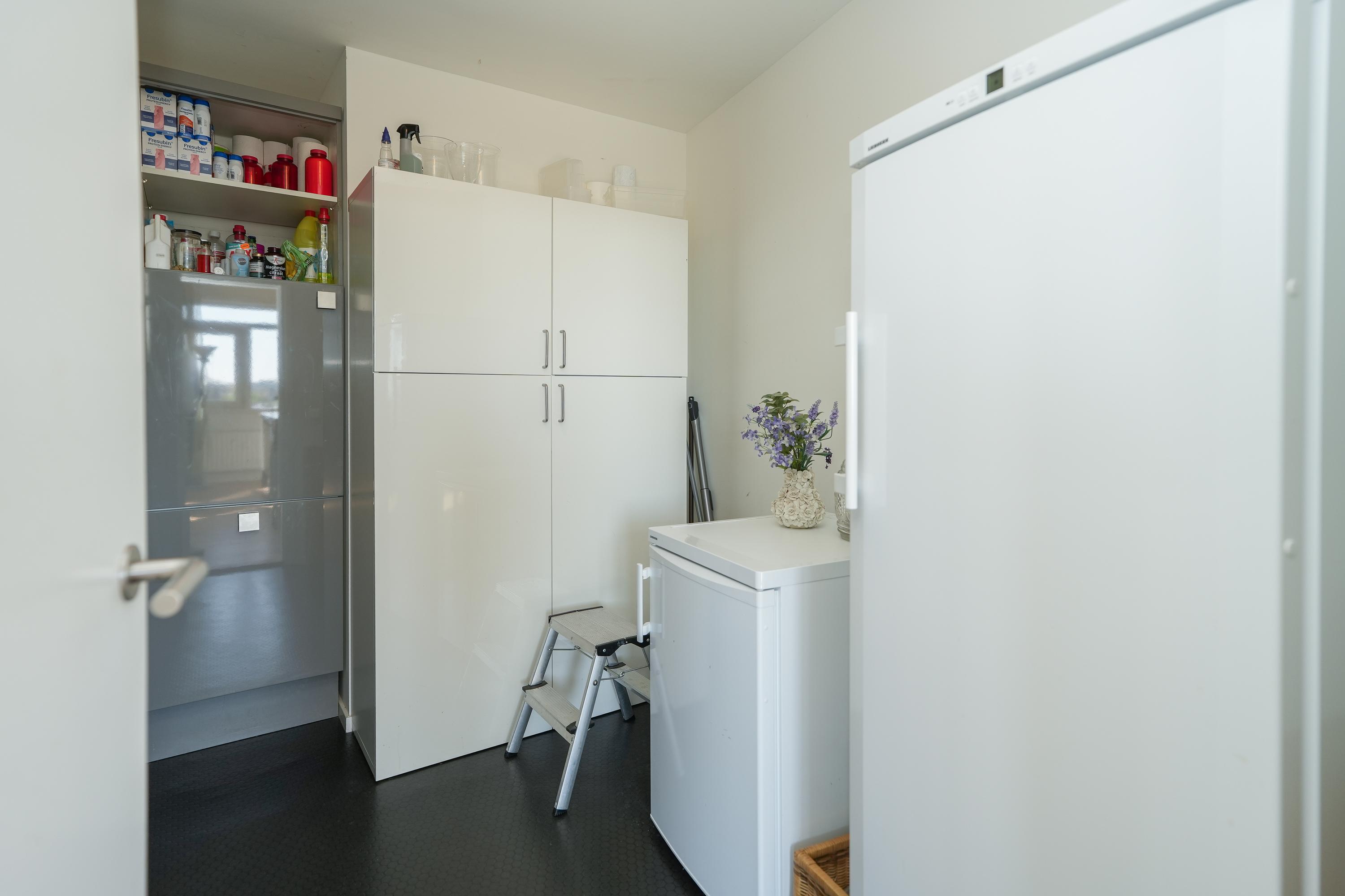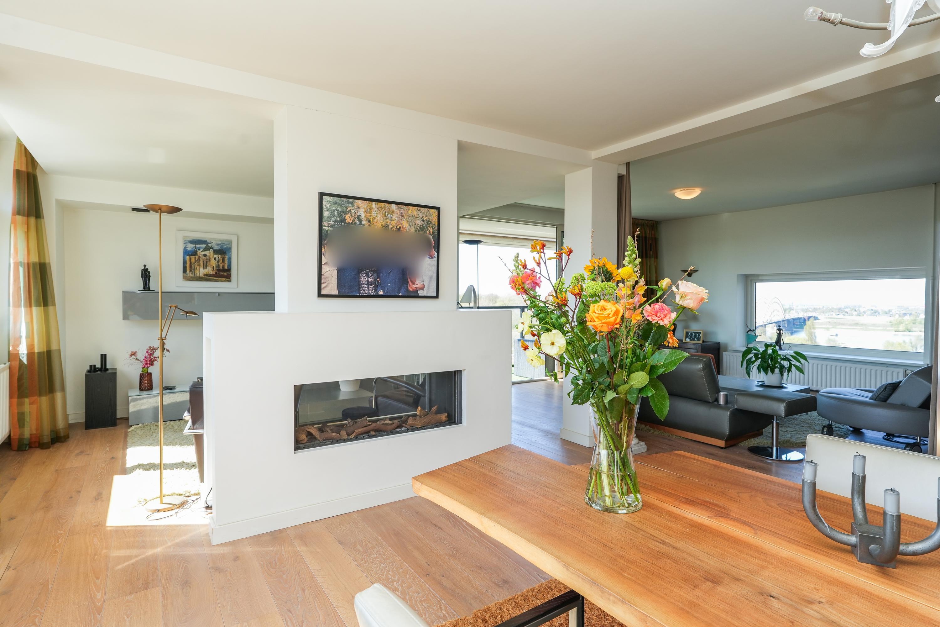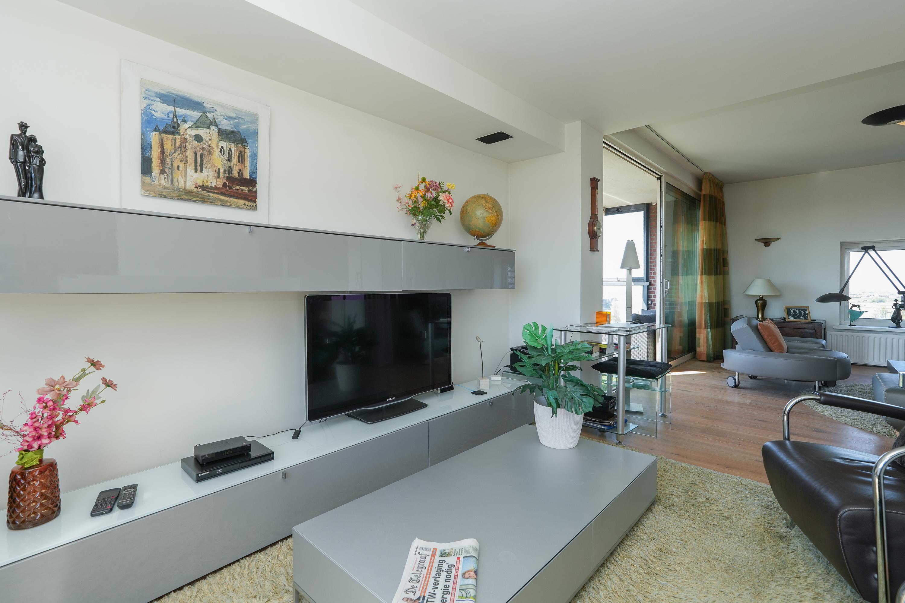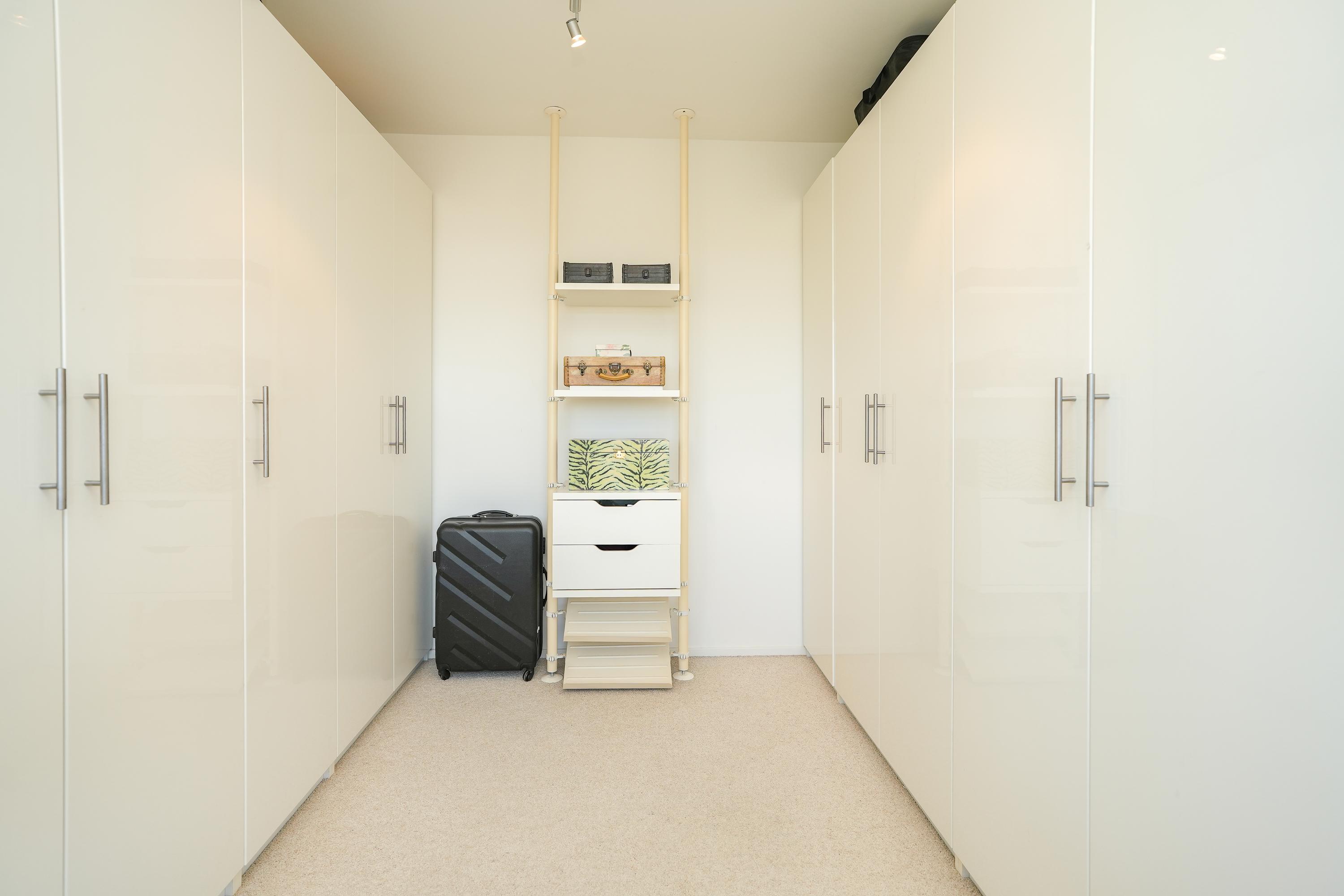 Entrance flat with a secure entrance door. The tastefully finished flat features a long, wide hallway that serves as a central connection between the various rooms. Upon entering are the cloakroom, guest toilet, a laundry room and the open kitchen. The kitchen and living room are both directly accessible from the hall, making for a nice, logical walk-through. The high-quality and complete kitchen is equipped with various built-in appliances and provides access to the first balcony, which faces south. Adjacent to the kitchen/dining room is a spacious utility room with additional storage and work space. From the balcony there is a beautiful view over the city of Nijmegen and Radboud University. The living room is loft-like in design and exceptionally spacious. A modern gas fireplace separates the dining room from the seating area on the south-west side. Large windows provide a sea of light and from the sitting area a sliding door gives access to a second, west-facing balcony with fine views towards the river Waal and the iconic Waal bridge.