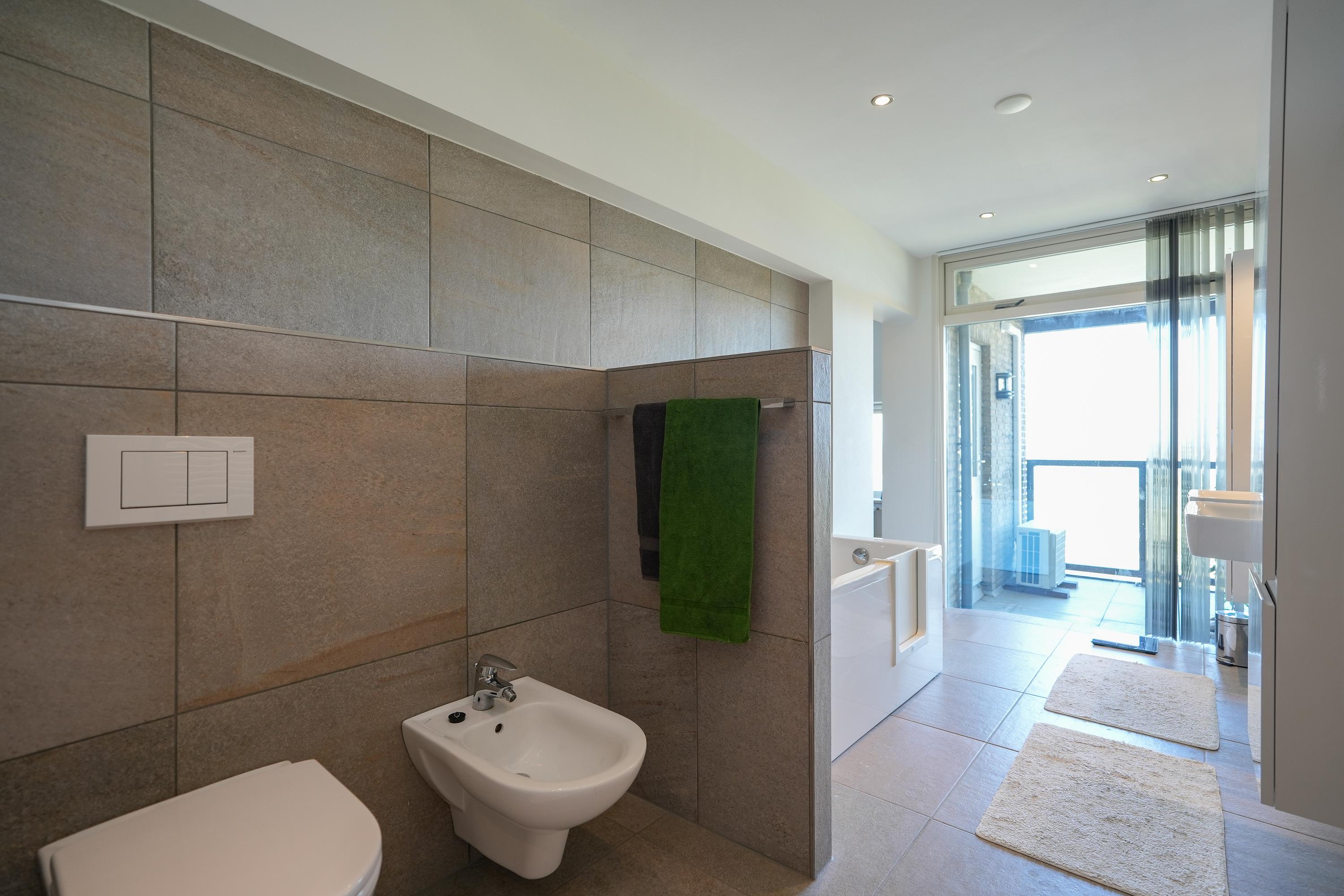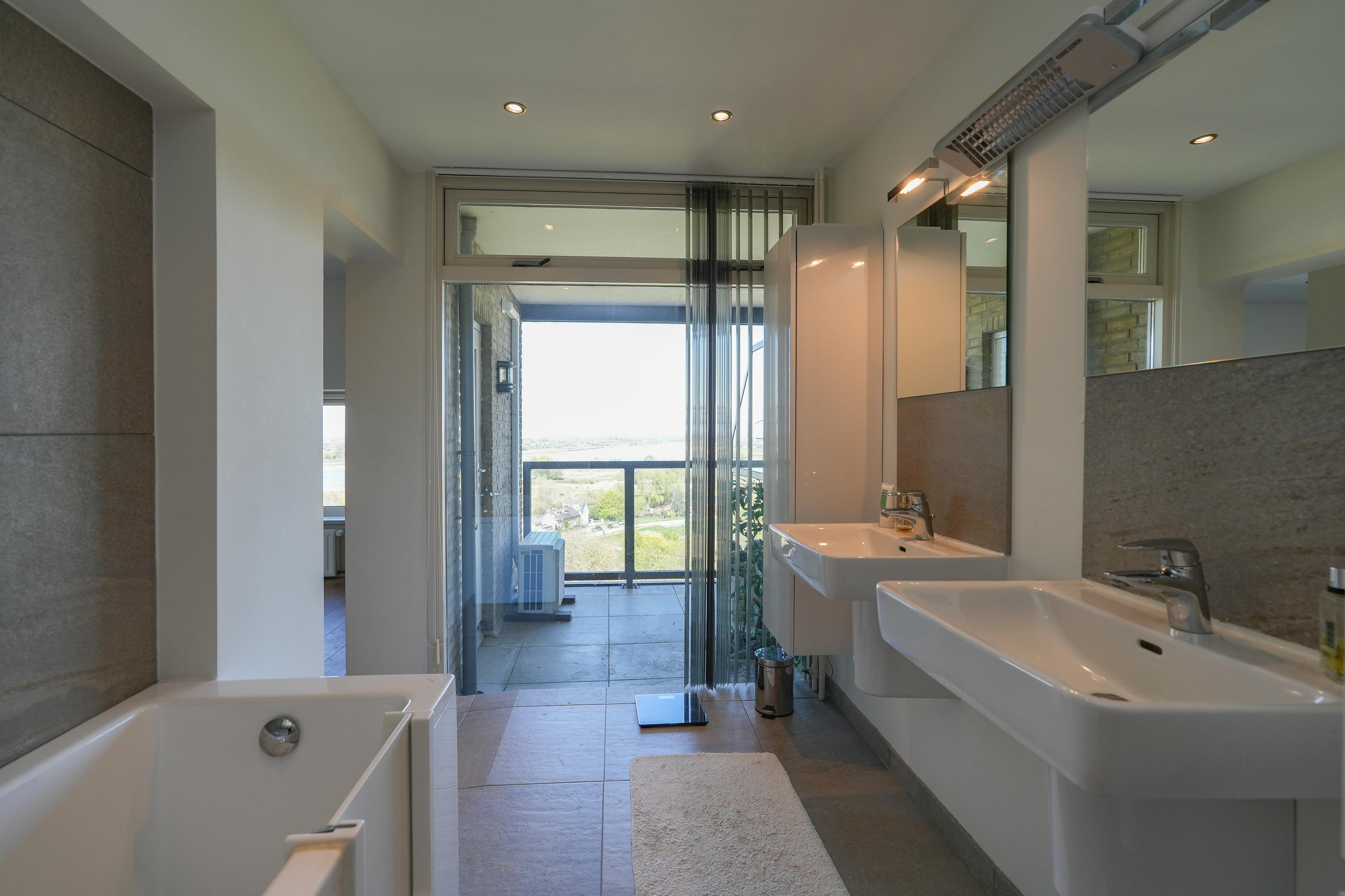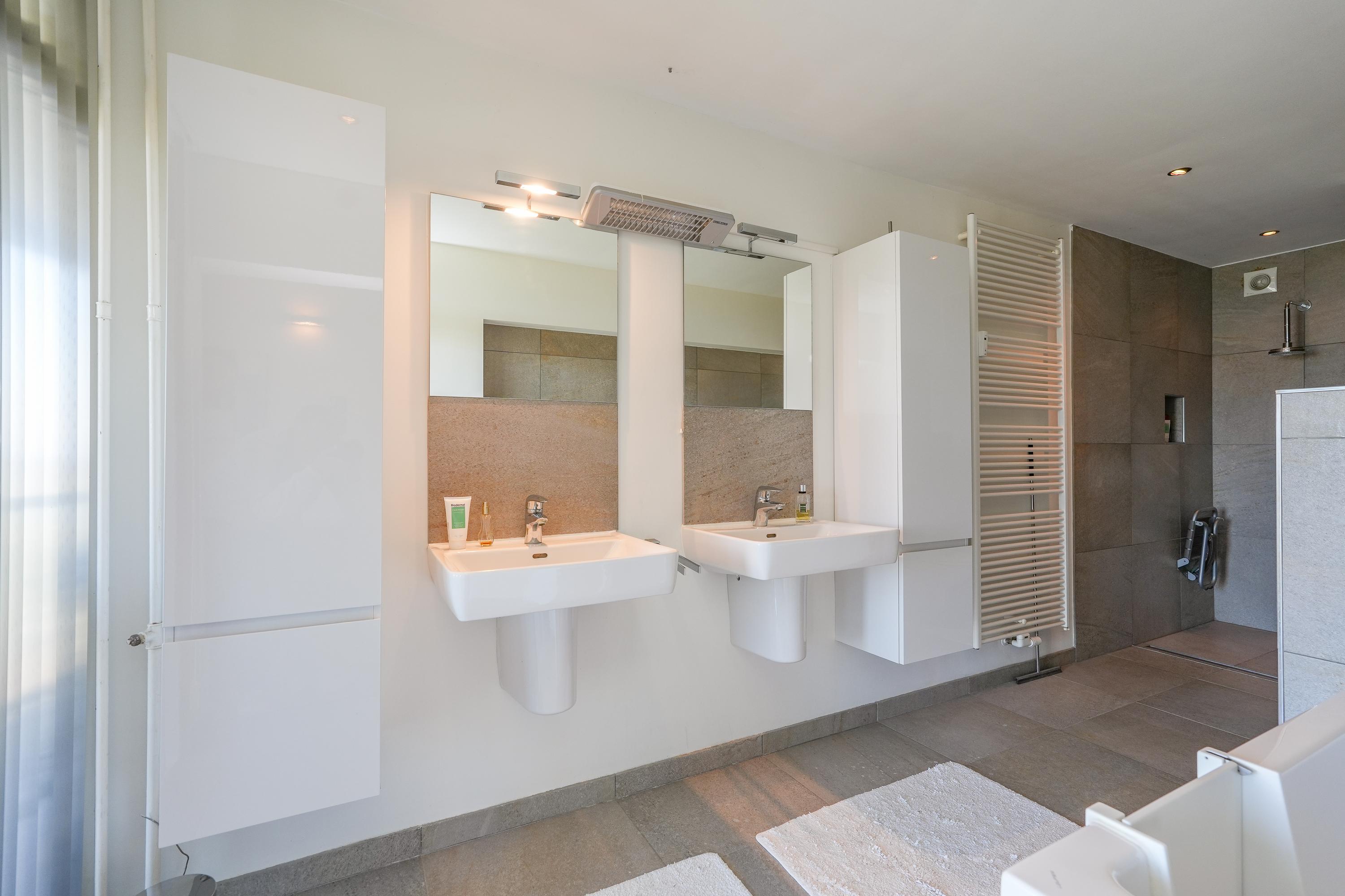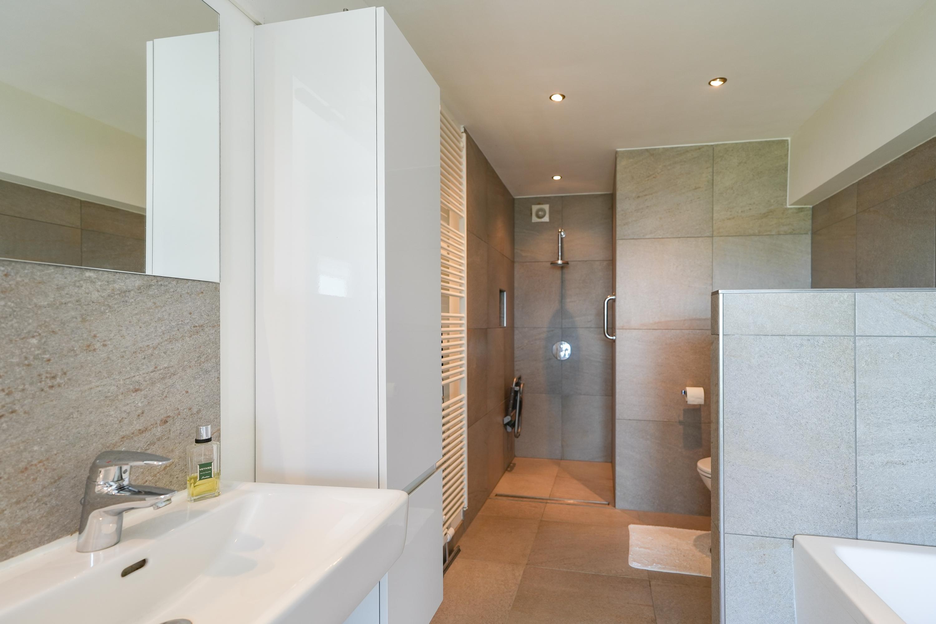 On the right side of the hall is the bedroom wing, consisting of three spacious bedrooms and two bathrooms. The master bedroom is a comfortable private space with a spacious walk-in wardrobe, its own luxurious bathroom and a north-facing balcony. From this balcony, there are beautiful views of the Waal river, the Waal bridge and the vast Ooijpolder. The bedroom is also air-conditioned. The bathroom is fully equipped and features a comfortable step-in bath, a spacious walk-in shower, toilet, bidet, double sink and two fixed bathroom cabinets. The finish is beautiful and the bathroom offers all the conveniences for daily use.