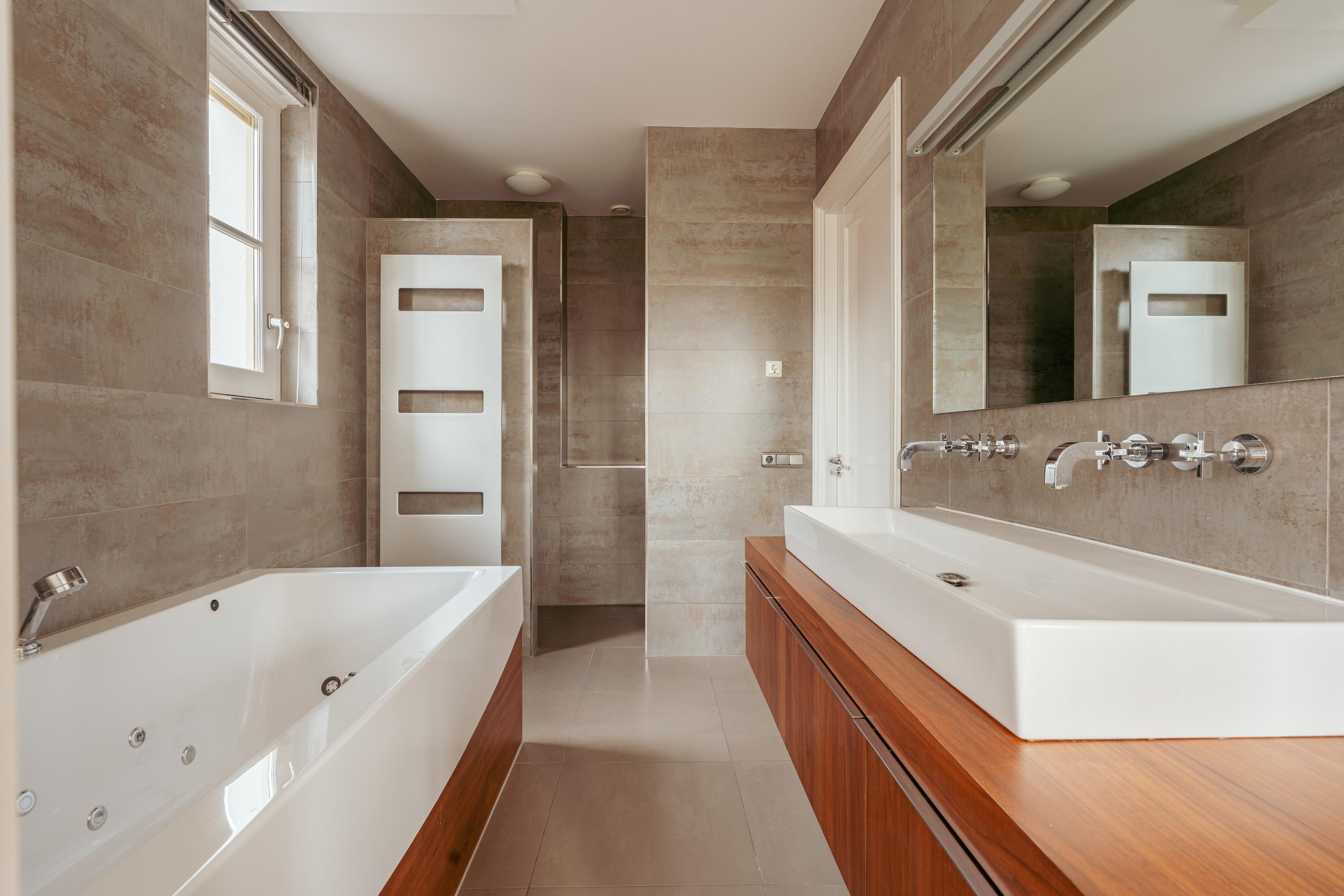 The second floor comprises two spacious bedrooms and a second bathroom, fitted with a toilet, washbasin and shower. Both bedrooms feature dormer windows on two sides, built-in wardrobes with sliding doors and air conditioning.