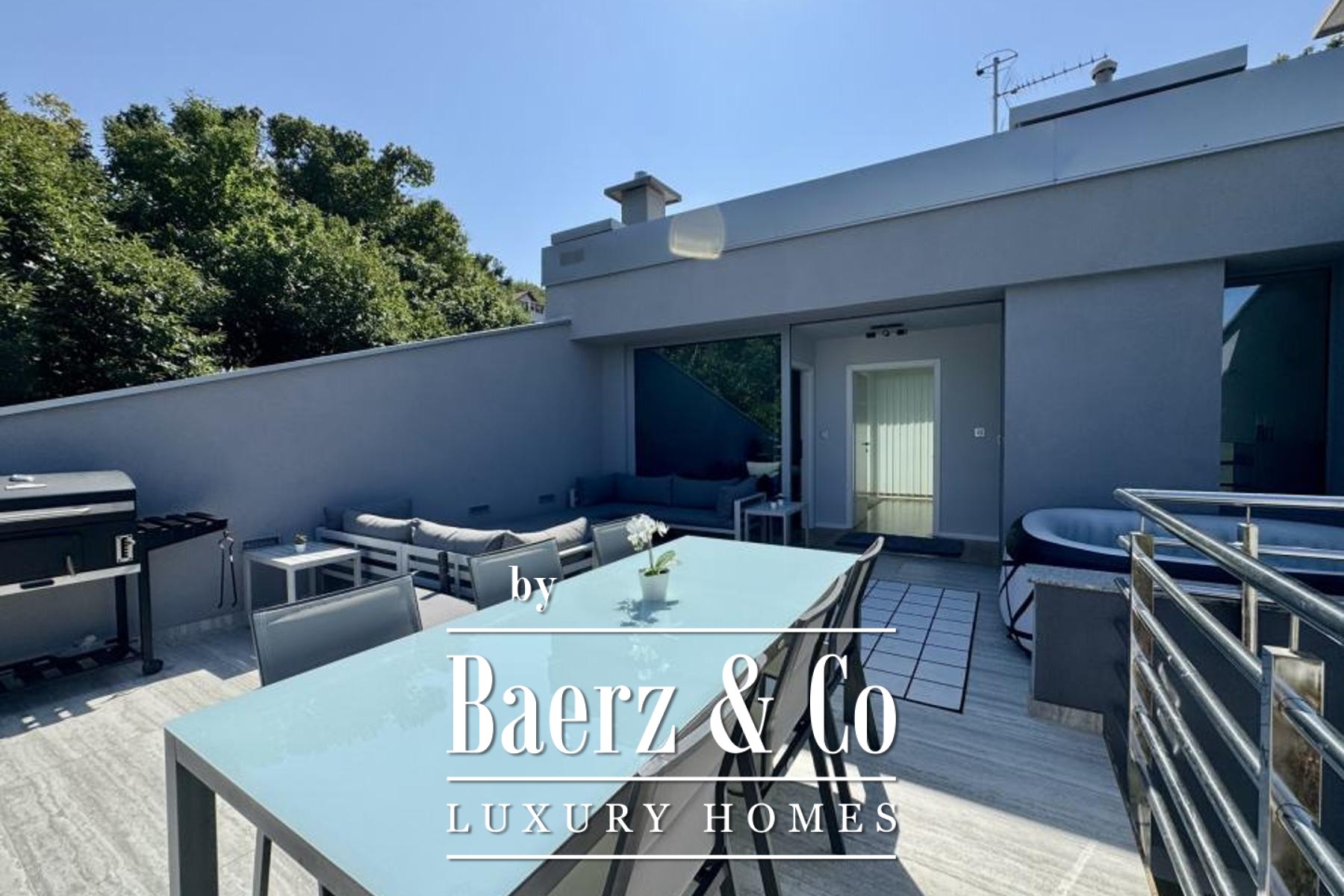 On the third level, the master bedroom extends to a covered terrace and en suite, culminating in a generous 40 m² rooftop terrace with jacuzzi, where the vista encompasses Sljeme and the city to the north and east. A garden, ample parking for up to five vehicles, and recent updates—including a new roof, facade, terraces with Italian ceramics, upgraded lighting, and Daikin air conditioning—underscore modernity and ease. This luxury apartment for sale in Podsljeme, discreetly positioned in a quiet cul-de-sac, offers an exceptional vantage point to experience sophisticated Zagreb living.