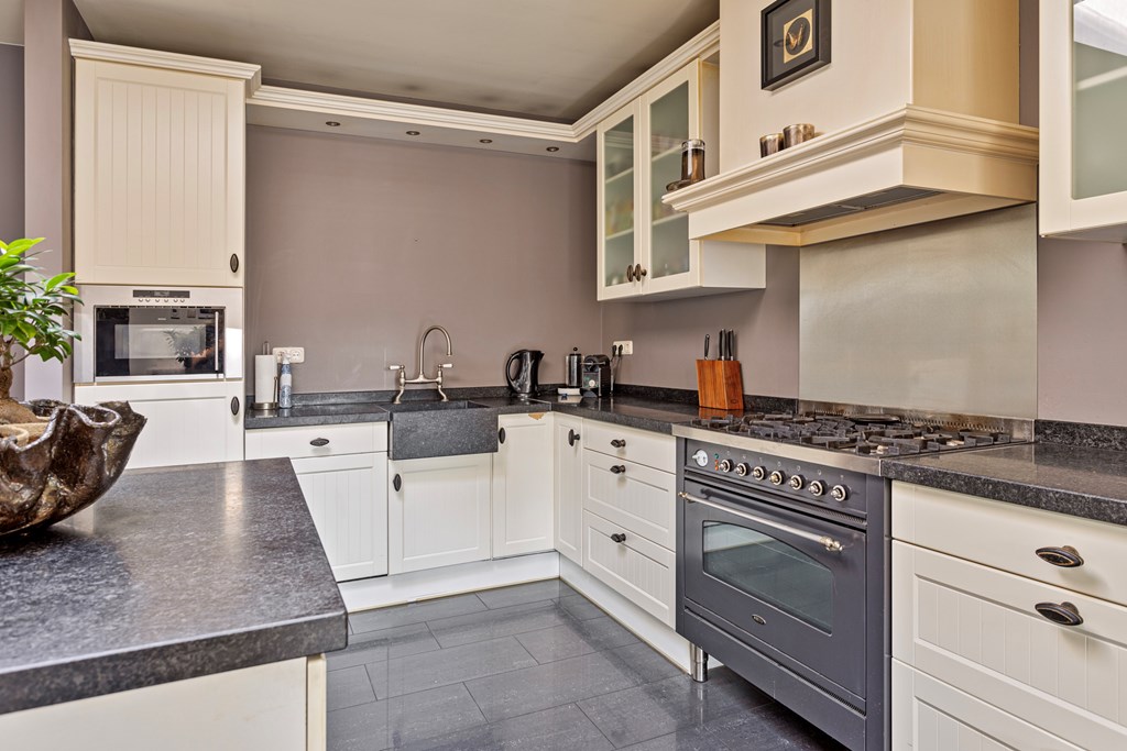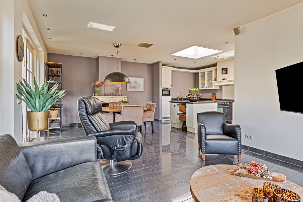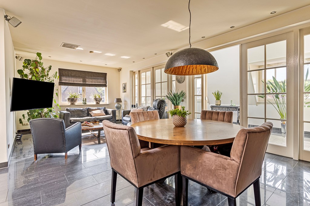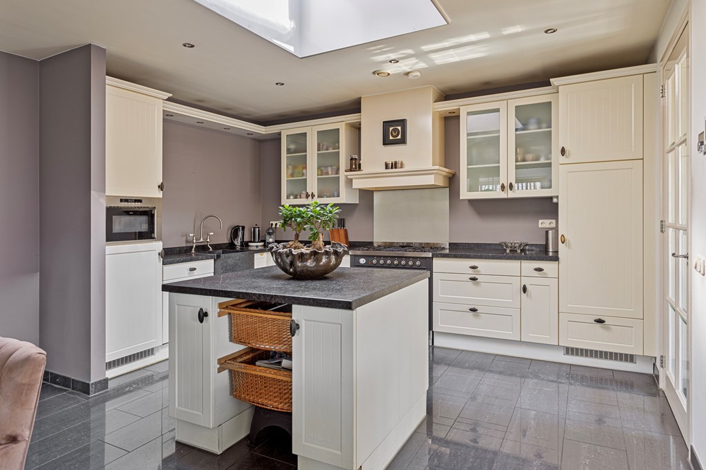 On the first floor, you reach the hall via the stairs or the lift. From the hall, you enter the generous living area with open kitchen, finished with a stylish natural stone floor. The kitchen island offers more than enough workspace and a lovely outlook over the dining area. The open-plan kitchen features a modern island and is fitted with luxury appliances, including a Boretti gas range.