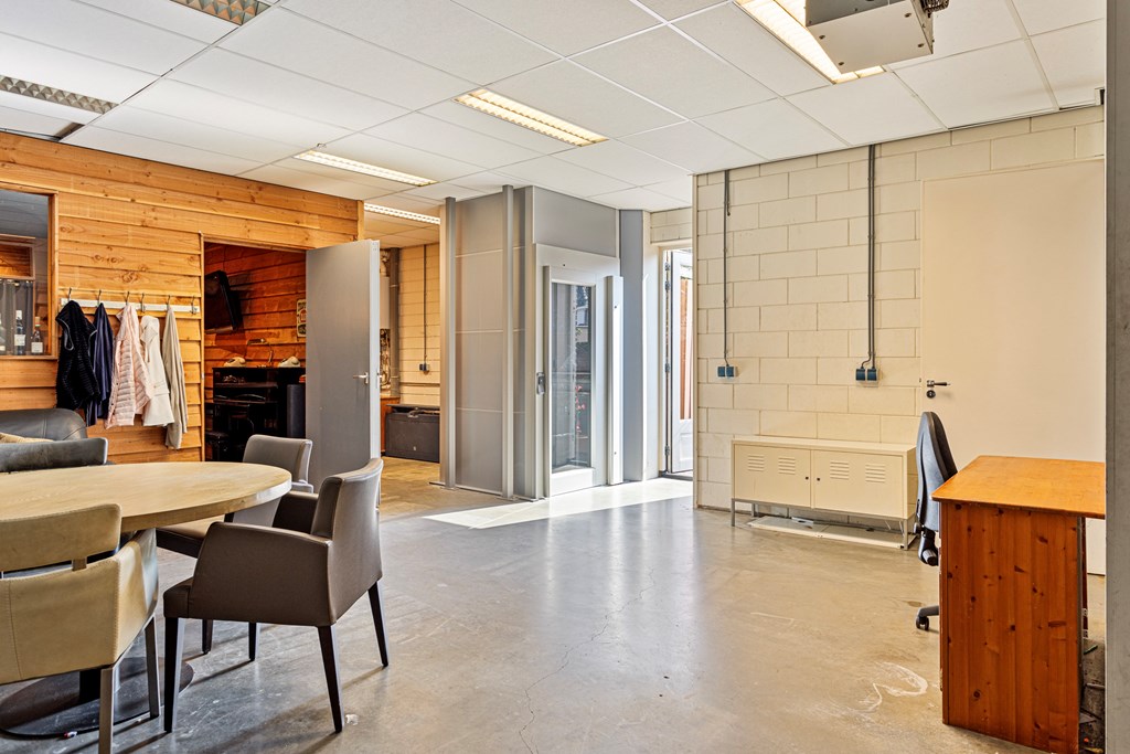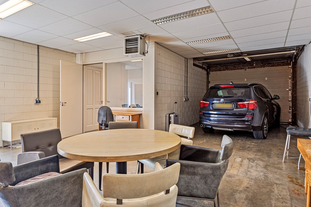Adjacent is the spacious garage, accessible via an electric overhead door, with room for multiple cars. At the rear of the garage you’ll find a practical kitchenette and a toilet with washbasin.